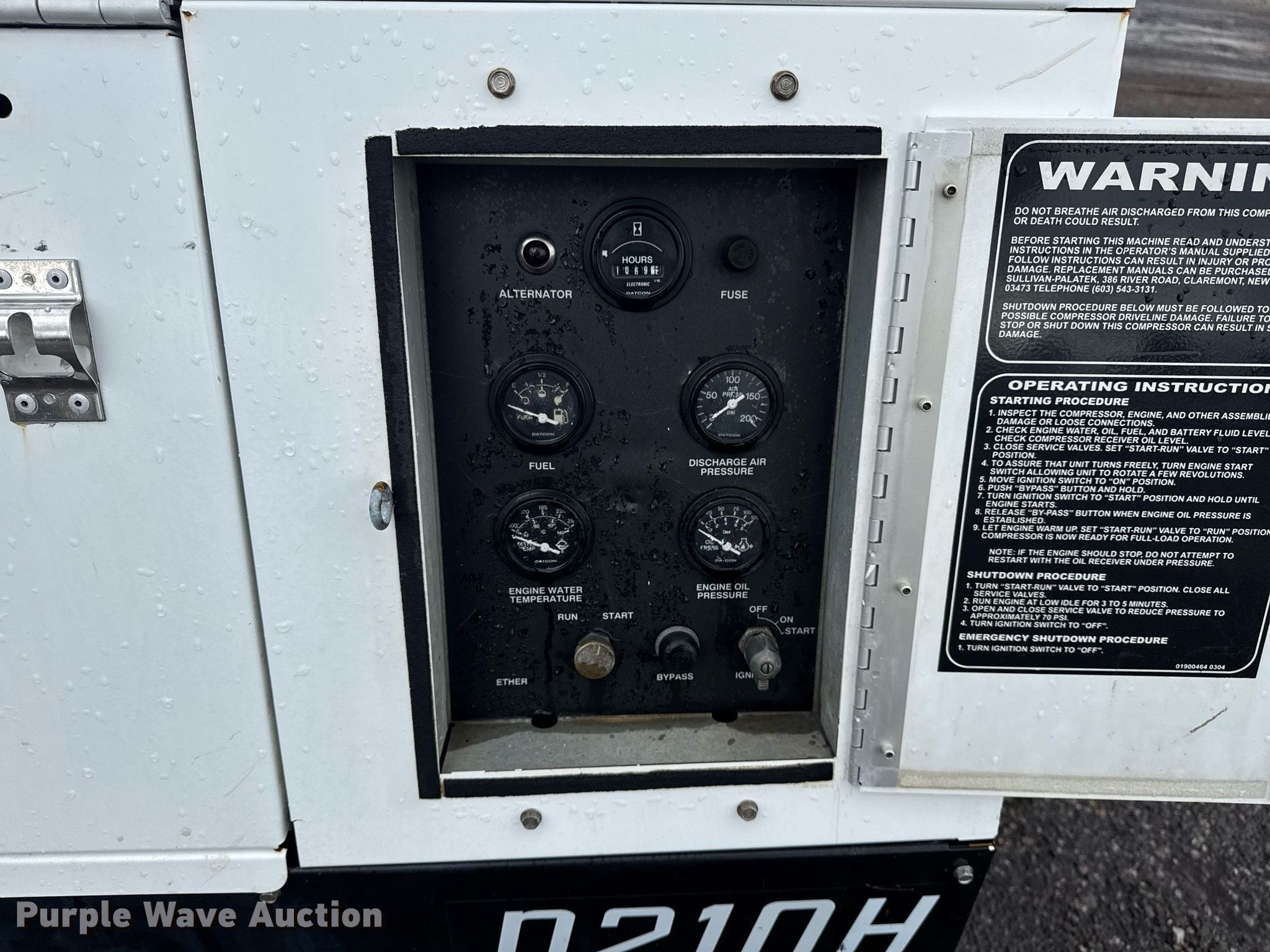 Purple Wave is selling a used Air Compressor in Oklahoma. This item is a 2009 Sullivan Palatek D2100H1OJD air compressor with the following: Hours: 1,069 on meter, Serial: 29081