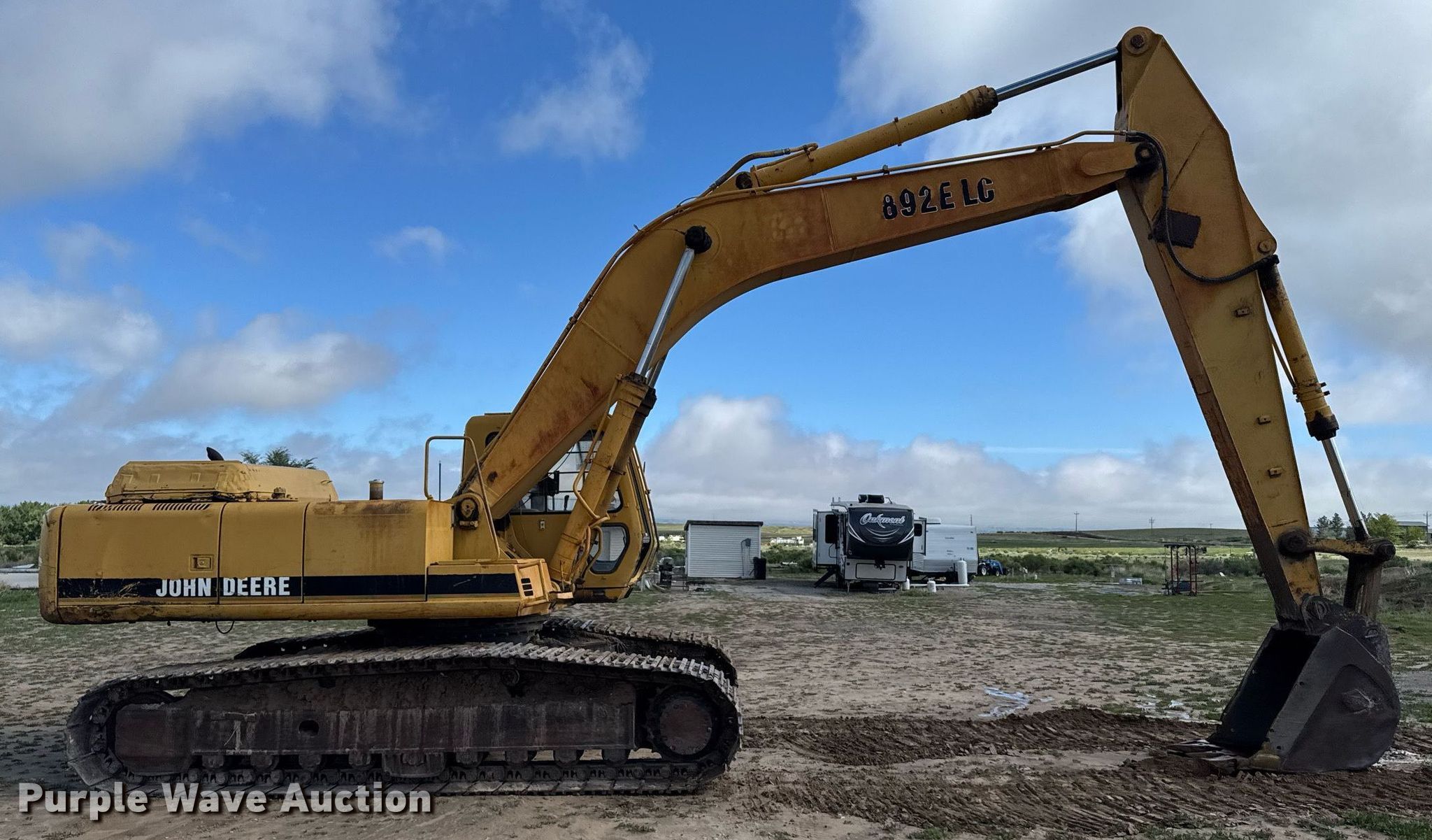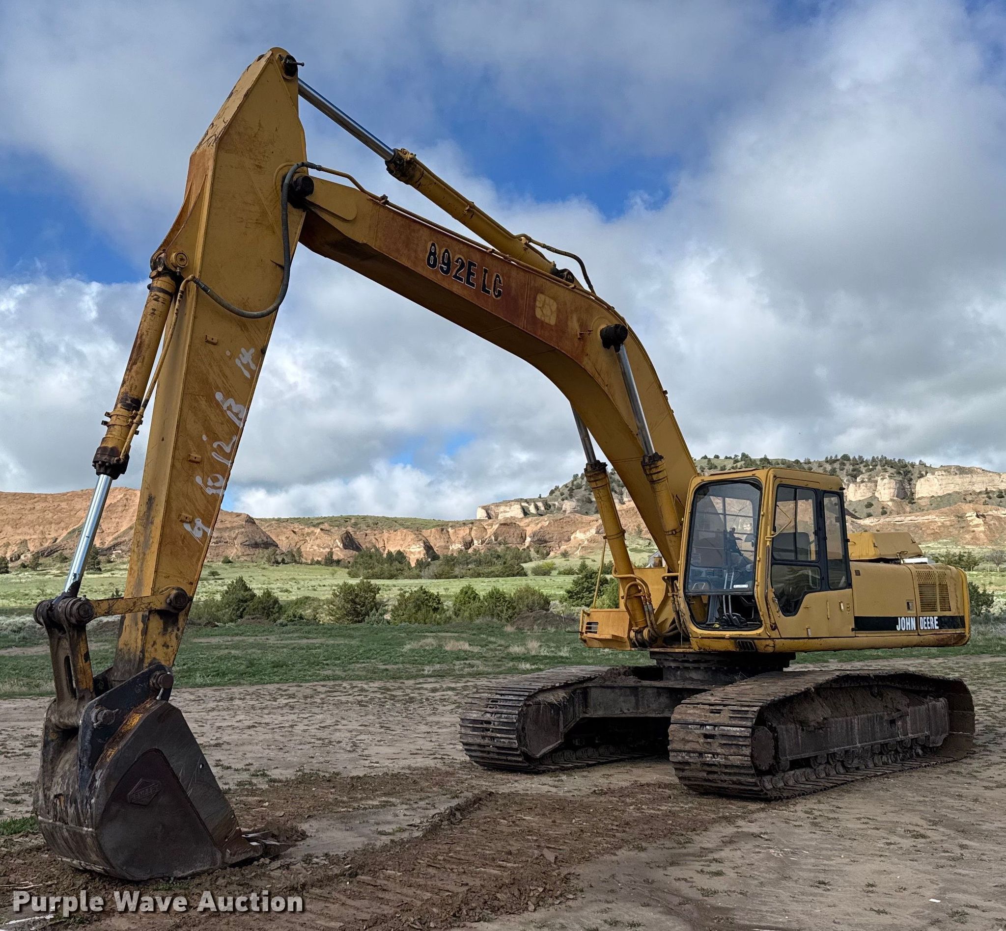 1993 John Deere 892E LC excavator. Hours: 18,833 on meter, Serial: FF892EX007080. Engine Cylinders: 6, Fuel type: Diesel. Transmission Hydrostatic. Operators station Enclosed cab, Heat. Features Boom Standard, Stick Stick length: 13', Quick coupler: Mechanical, Bucket Width: 36", Teeth: 4. Tracks Width: 32", Steel, Grouser pads: Triple. Notes Glass cracked. Grace Industries LLC. Scottsbluff, NE 69361