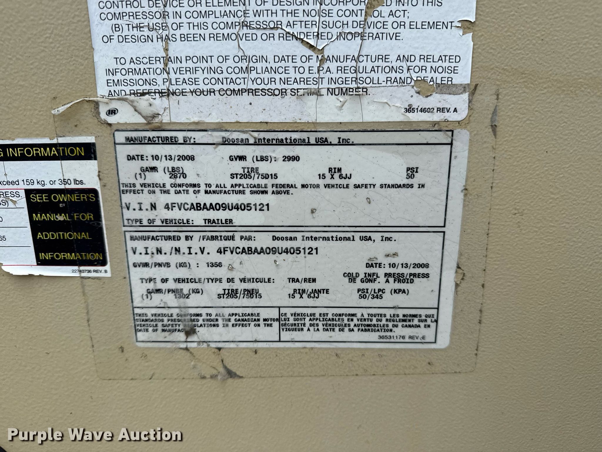 2008 Ingersoll Rand P185WIR air compressor. Hours: 2,010 on meter, Serial: 405121UUSD07. Engine Ingersoll Rand 41R18N, Displacement: 3.319L, Cylinders: 4, Fuel type: Diesel. Features Air compressor PSI: 185. Trailer 2009 Doosan International USA Inc, VIN: 4FVCABAA09U405121, Ball hitch size: 2", Axles: Single, Tire size: 255/60R16, GVWR: 2,990 lbs, GAWR: 2,870 lbs. Transfer of ownership documentation will be a bill of sale. Metro Auto Wholesale. Tulsa, OK 74145