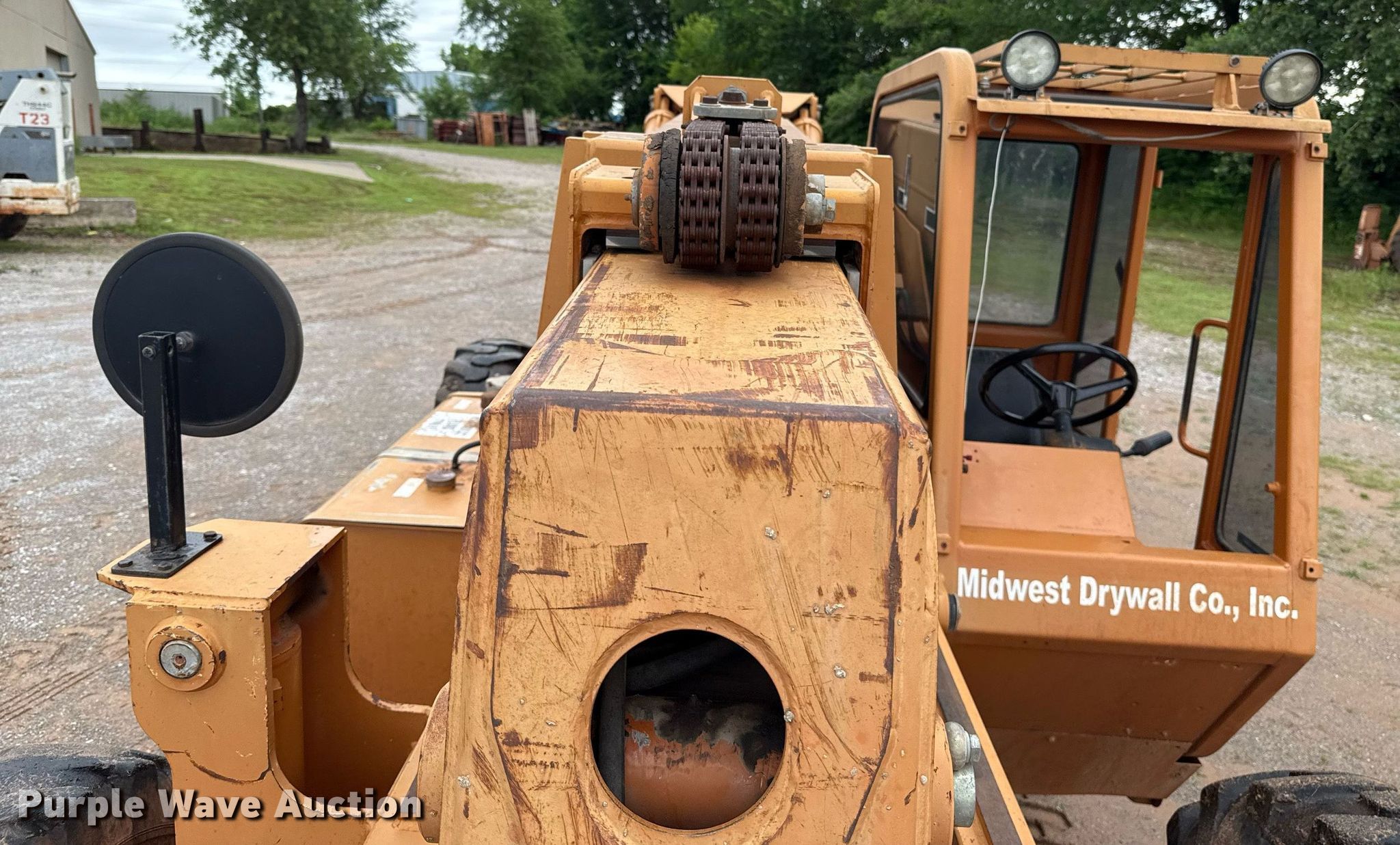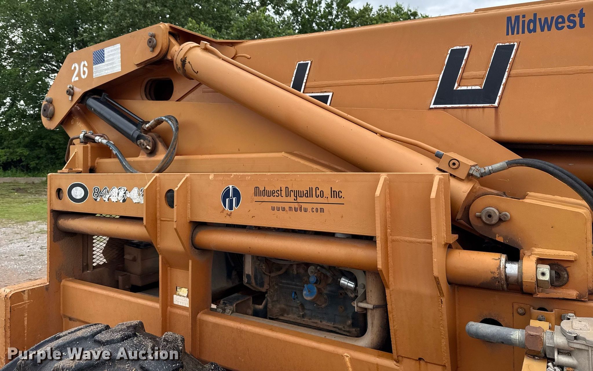 2000 Lull 844C-42 telehandler. Hours: 6,732 on meter, Serial: 00W21P22-3326. Engine Cummins B3.9C, Serial: 45002690, Displacement: 3.9L, Cylinders: 4, Fuel type: Diesel, HP: 110. Transmission Powershift, 4F - 3R, Four wheel drive, Differential lock. Operators station OROPS, Canopy, Steering: Crab, Four wheel. Features Maximum lift capacity: 8,000 lbs, Maximum lift height: 42', Boom stages: 3, Fork length: 48", Auxiliary hydraulics, Tilt carriage. Tires Size: 13.00-24. Notes Warning indicator: Transmission disconnect, Glass cracked, Glass missing, Door missing, Starter issues, must jump from alternator, Fuel pump leak, Fuel injector leak. Midwest Drywall Company. Oklahoma City, OK 73129