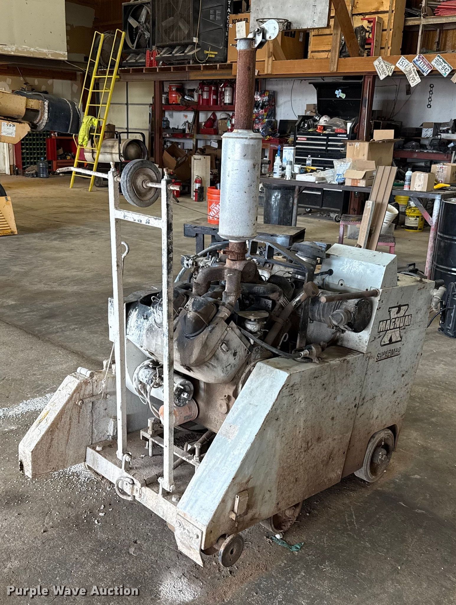 Magnum Supermag/26 concrete saw. Hours: Unknown, Serial: 1007991580. Engine Wisconsin V468D1, Serial: 99090212, Cylinders: 4, Fuel type: Gas. Transmission Hydrostatic. Features Water hookup. Notes Blade missing, Unknown operating condition. Redlands Contracting. El Reno, OK 73036