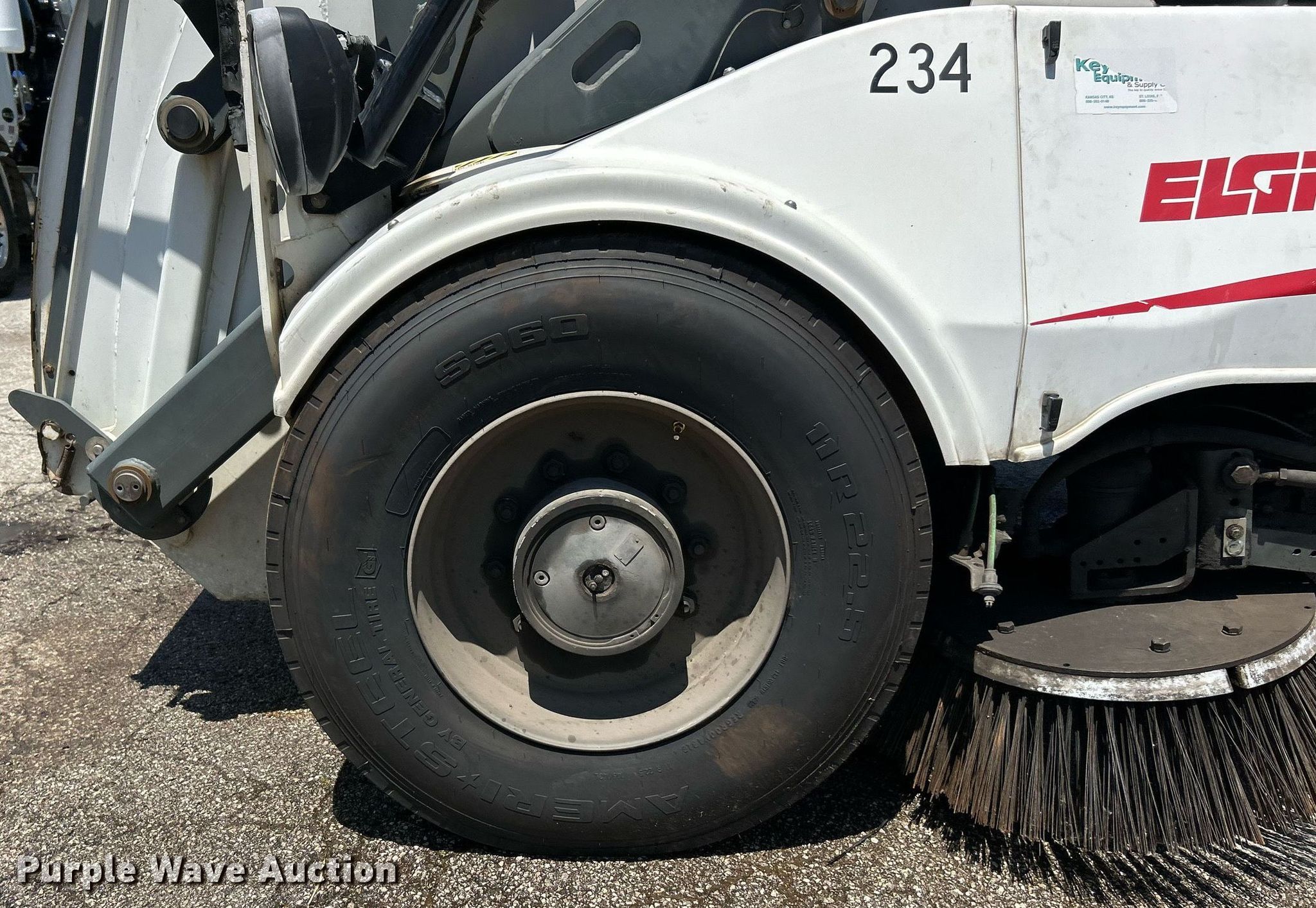 2009 Elgin Pelican NP street sweeper. Miles: 36,297 on odometer, Hours: 8,432 on meter, Serial: NP1245D. Engine John Deere, Displacement: 4.5L, Cylinders: 4, Fuel type: Diesel. Transmission Hydrostatic. Chassis Brakes: Hydraulic. Operators station Enclosed cab, AC, Heat, Dual operating station, Backup camera. Features Broom Width: 72", Water spray system, Sweeper bed Sweeper bed type: Conveyor, Left gutter broom Diameter: 24", Right gutter broom Diameter: 24".. Tires Front: 11R22.5, Rear: 10R17.5. Key Equipment & Supply Co. Bridgeton, MO 63044