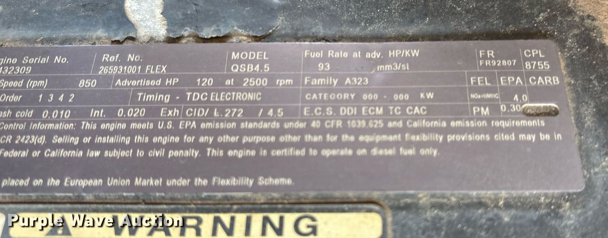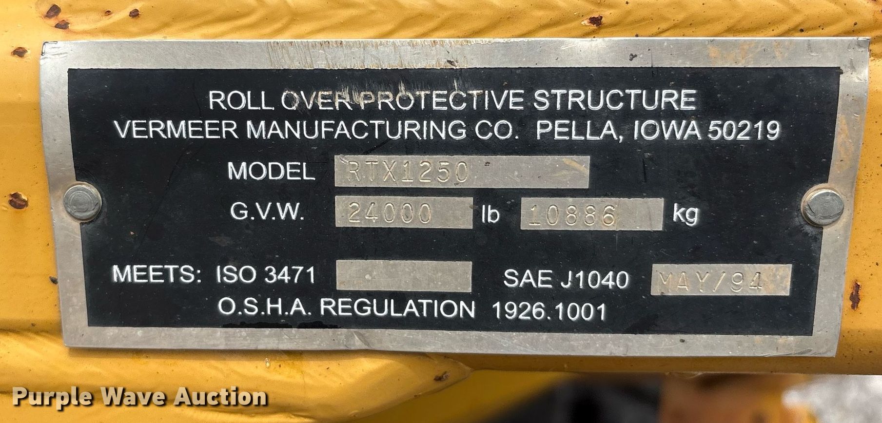 2012 Vermeer RTX 1250 cable plow. Hours: 834 on meter, Serial: 1VR6110Y5D1000398. Engine Cummins QSB4.5, Displacement: 4.5L, Cylinders: 4, Fuel type: Diesel, HP: 120. Transmission Hydrostatic, Two speed travel, Four wheel drive, Four wheel steer. Operators station OROPS, Canopy. Features Vibratory plow Estimated dig depth: 55", Cutting width: 2", Reel carrier Maximum reel width: 60", Maximum reel diameter: 48". Tracks Width: 18", Rubber. CD Brown Construction. Sulphur, OK 73086