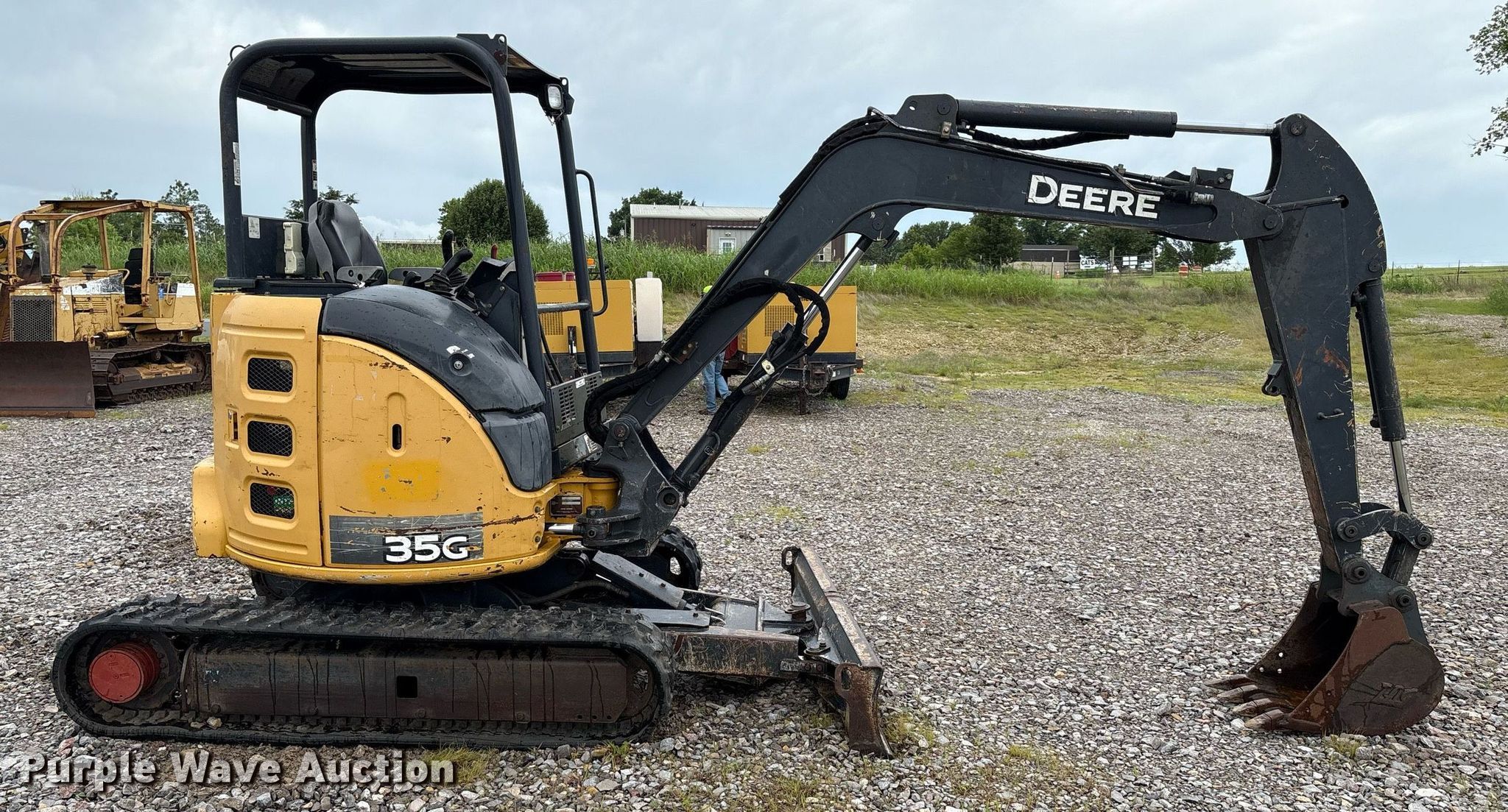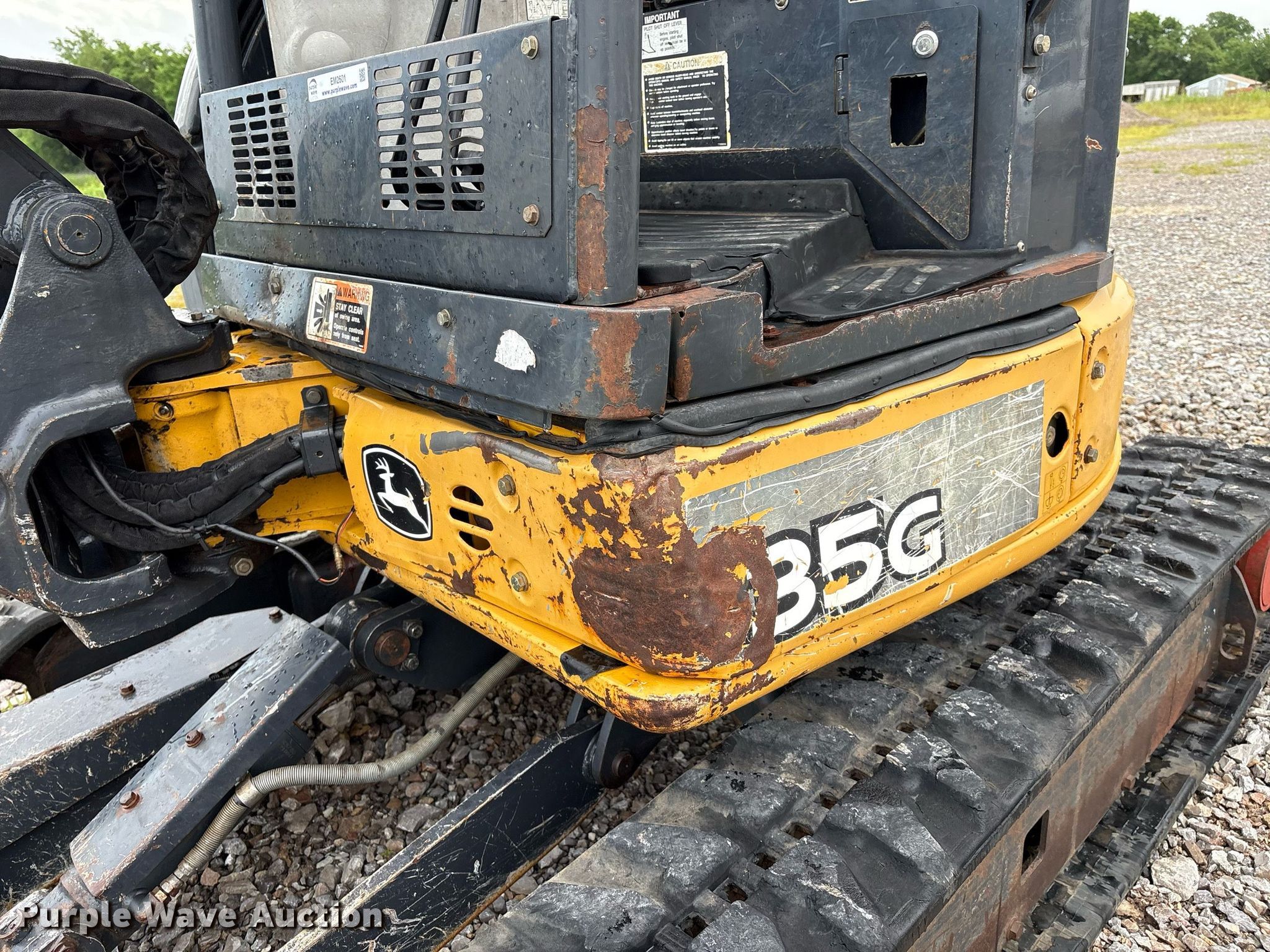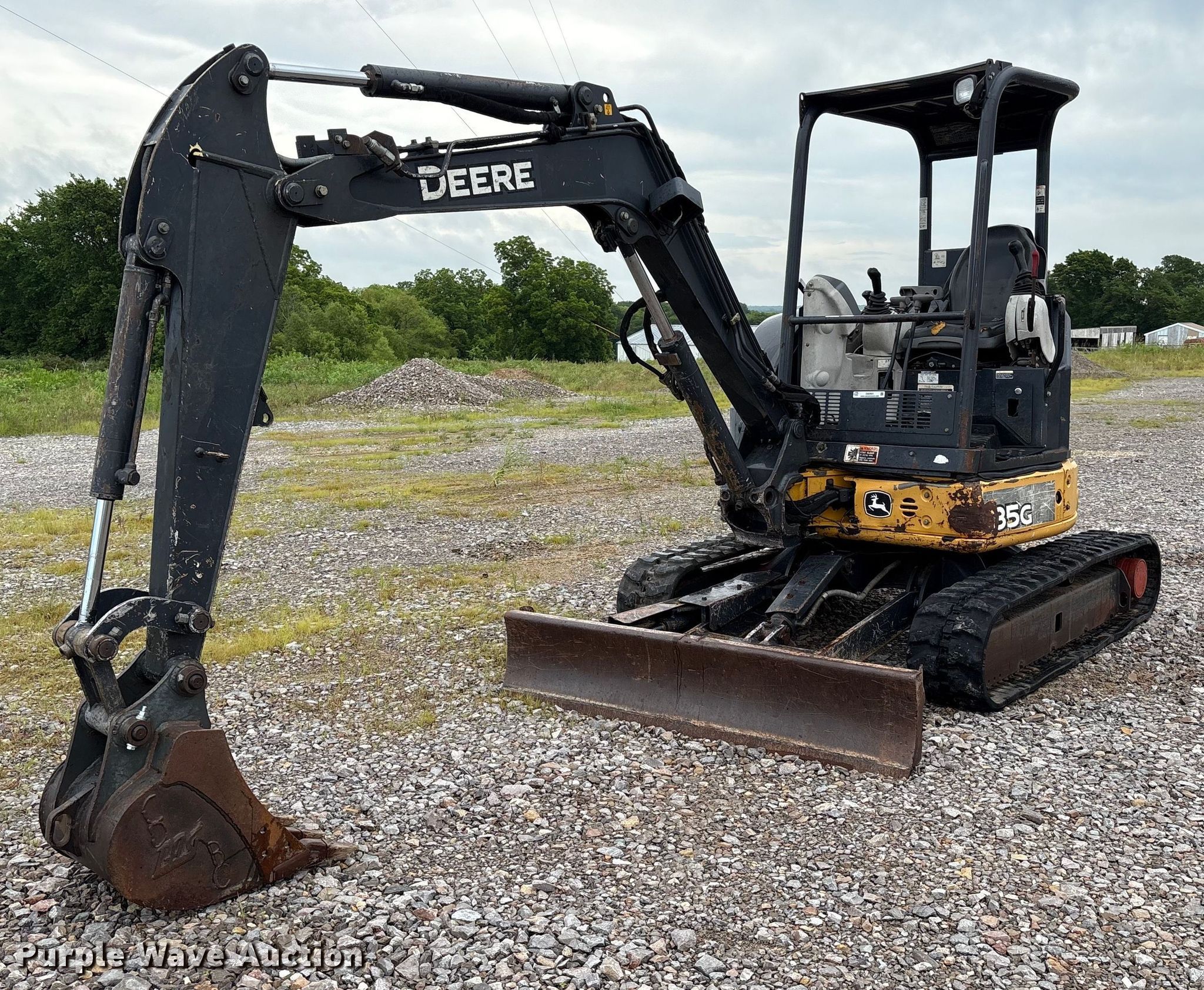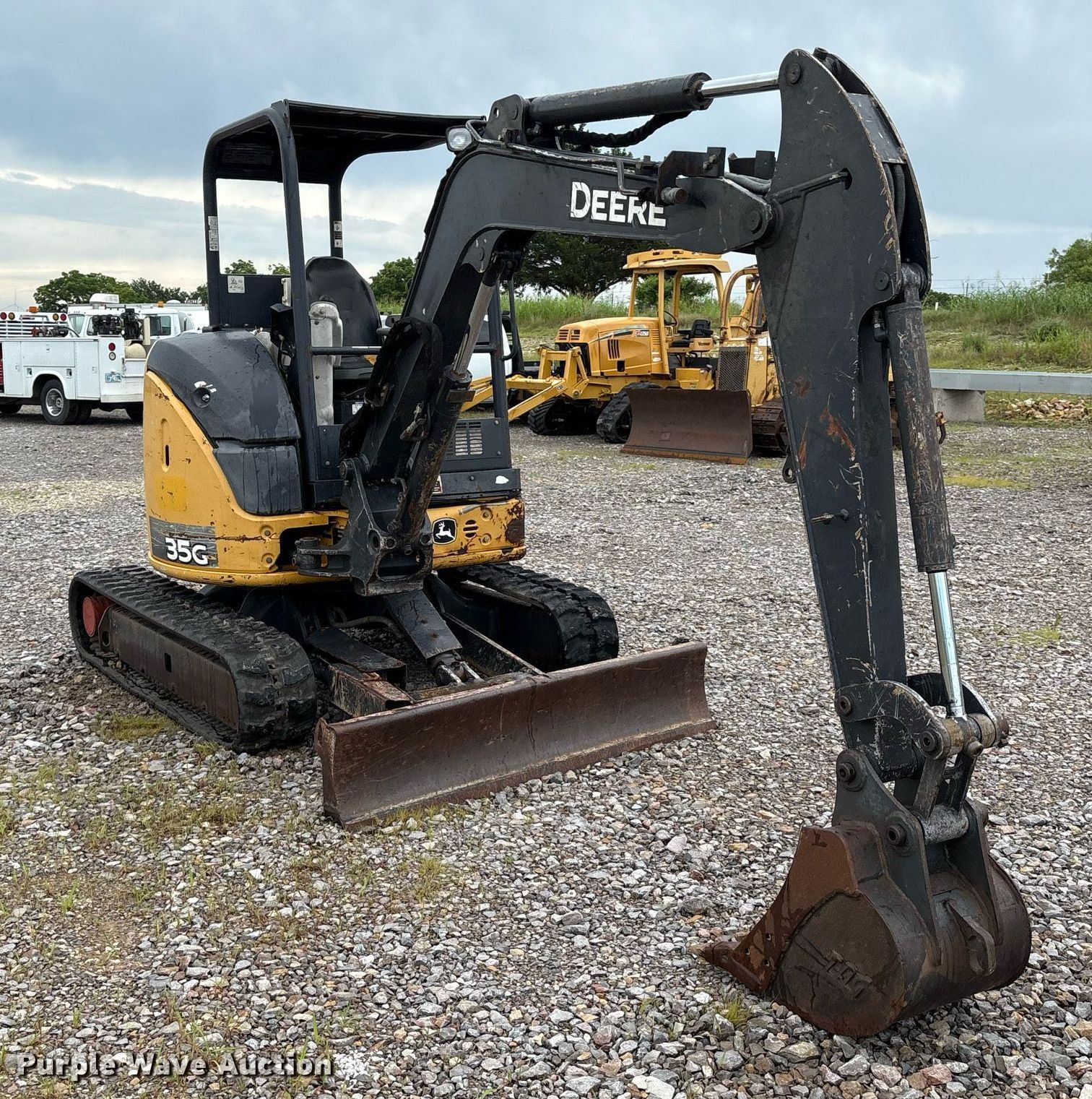 Purple Wave is selling a used Mini Excavator in Oklahoma. This item is a 2014 John Deere 35G mini excavator with the following: Hours: 1 on meter, Actual hours unknown, Serial: 1FF035GXPDK270911
