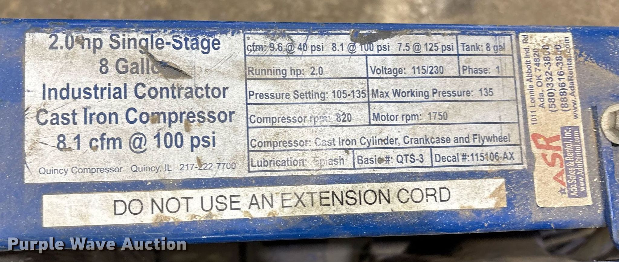 Purple Wave is selling a used Air Compressor in Oklahoma. This item is a Quincey QTS-3 air compressor with the following: Serial: 20040916-0108