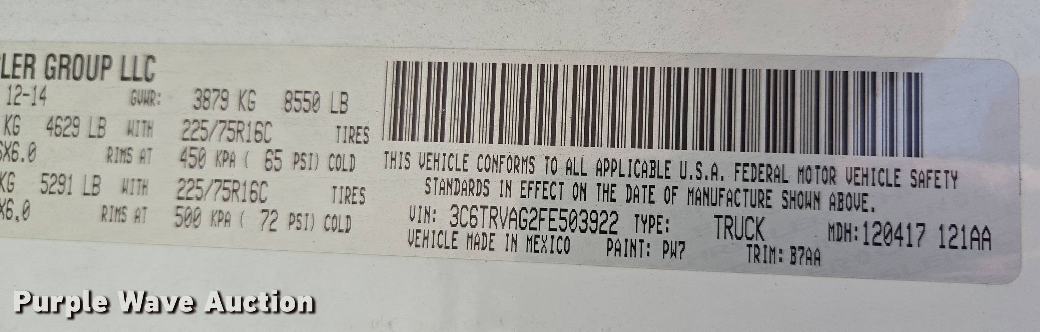 2015 Dodge ProMaster 1500 utility van. Miles: 188,640 on odometer, VIN: 3C6TRVAG2FE503922. Engine Displacement: 3.6L V6, Cylinders: 6, Fuel type: Gas. Transmission Automatic. Interior AC, Heat, Heated mirrors, Power windows, Power locks. Tires Size: 225/75R16. Notes Windshield chipped or cracked, Dead battery. Missouri title. Title has a lien that will be released following the close of the auction. Title distribution may be delayed up to 30 days from verification of funds. Raytown, MO 64133