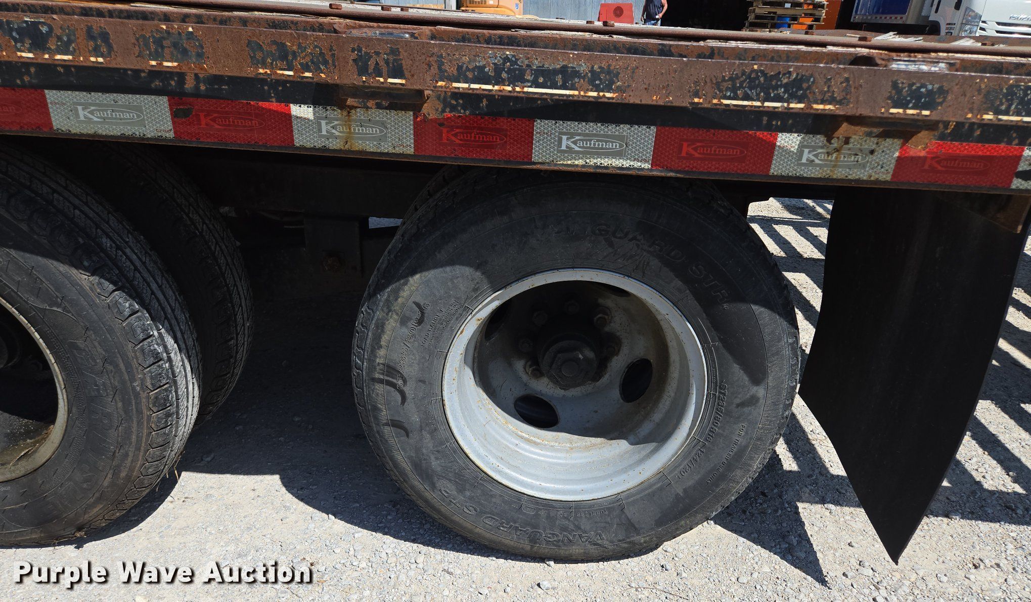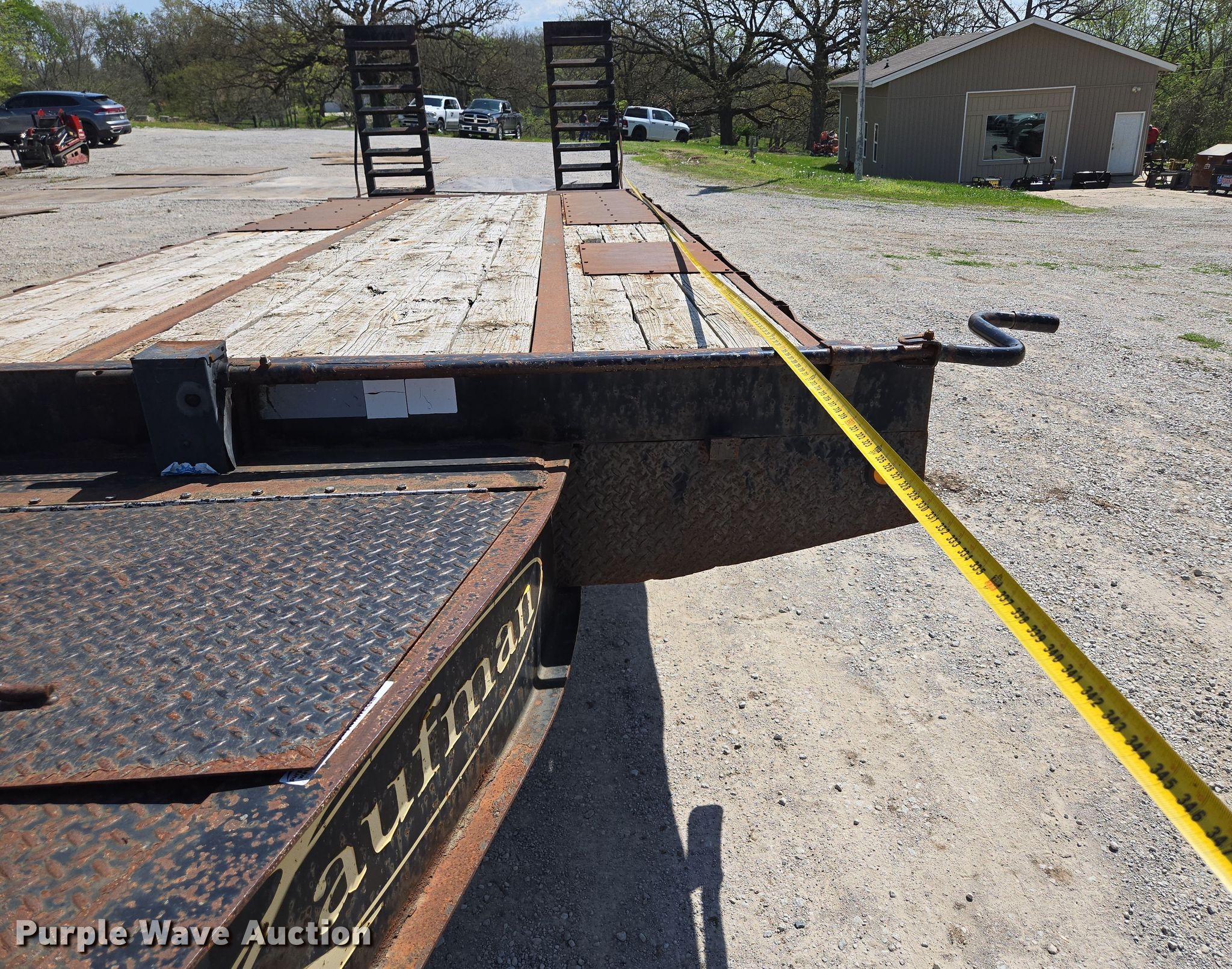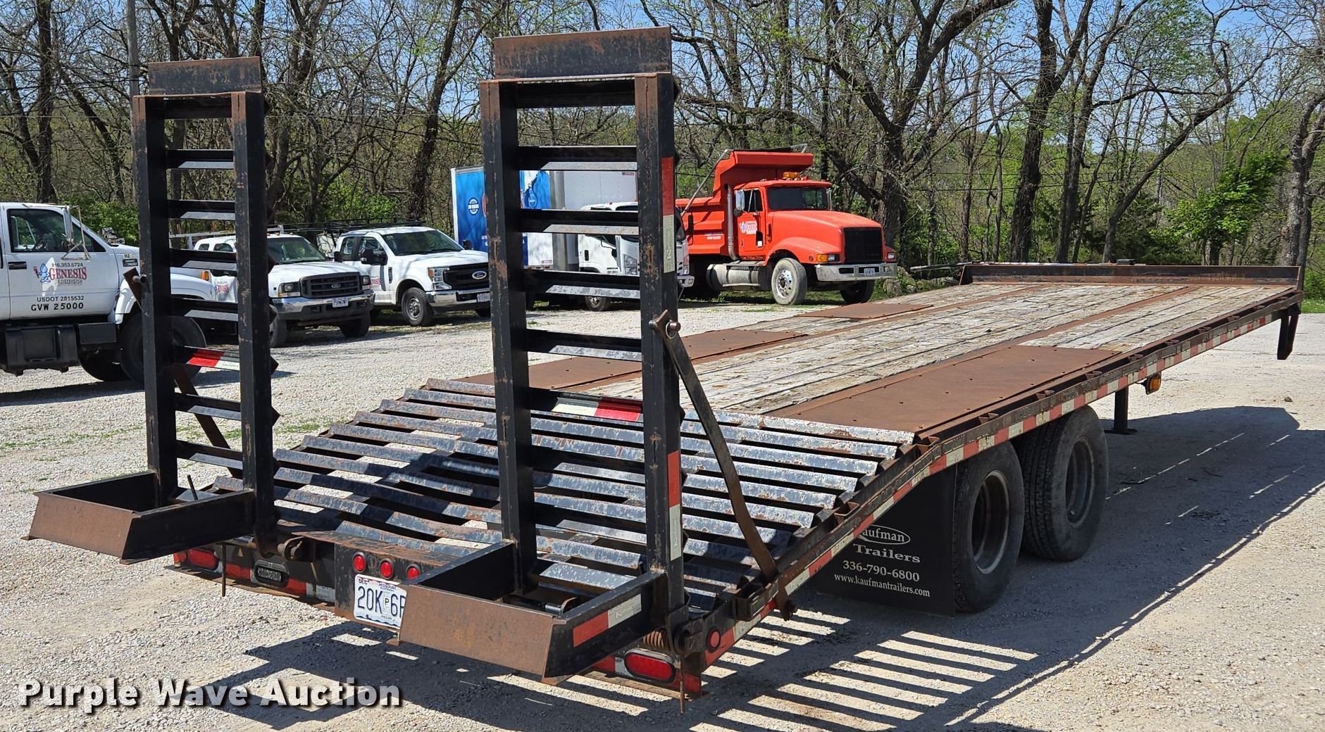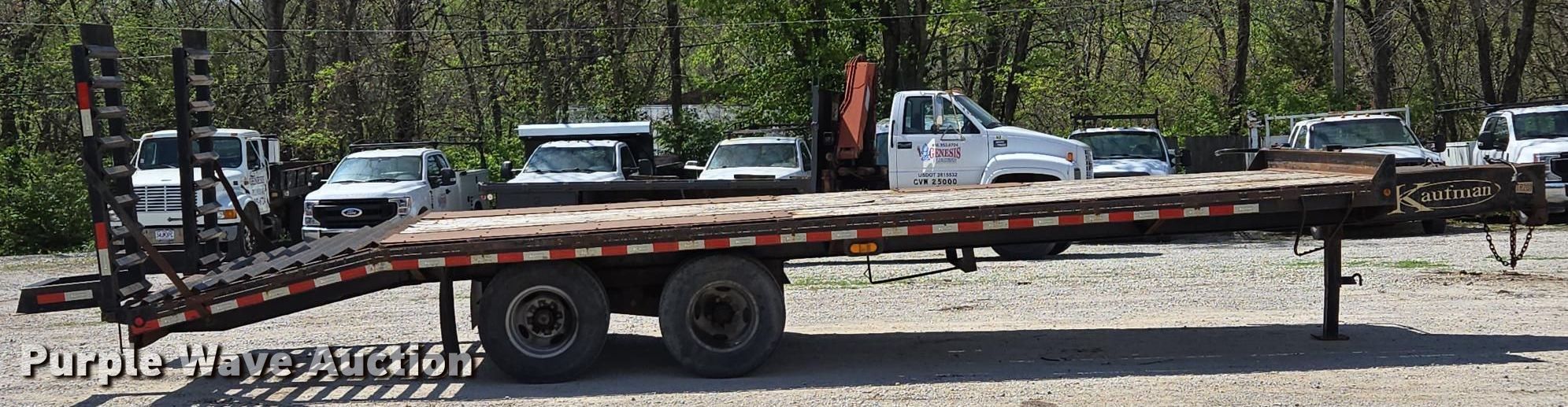 2014 Kaufman equipment trailer. VIN: 5SHFH2520EB000153. Dimensions Overall: 30' 6" L x 96" W, Deck: 20' L x 96" W, Tail length: 5', Ramps: Manual Length: 5'. Features Deck type: Wood. Chassis Hitch: Pintle, Landing gear: Single, Suspension: Spring, Brakes: Electric, Axles: Tandem, GVWR: 25,900 lbs. Tires Steel wheels, Size: 235/80R16. Notes Toolbox contents not included, Tongue damaged, bent. Missouri title. Title has a lien that will be released following the close of the auction. Title distribution may be delayed up to 30 days from verification of funds. Raytown, MO 64133