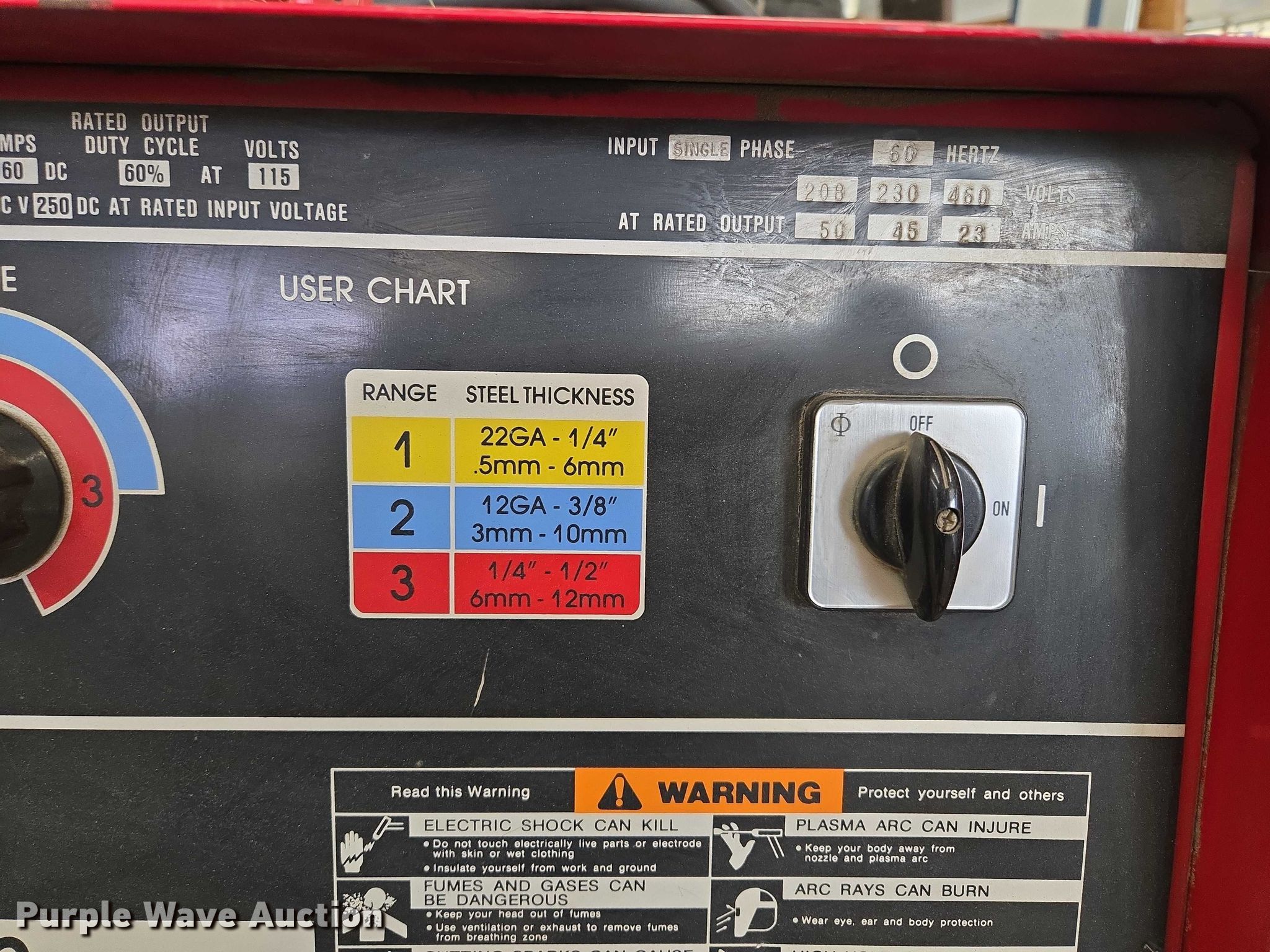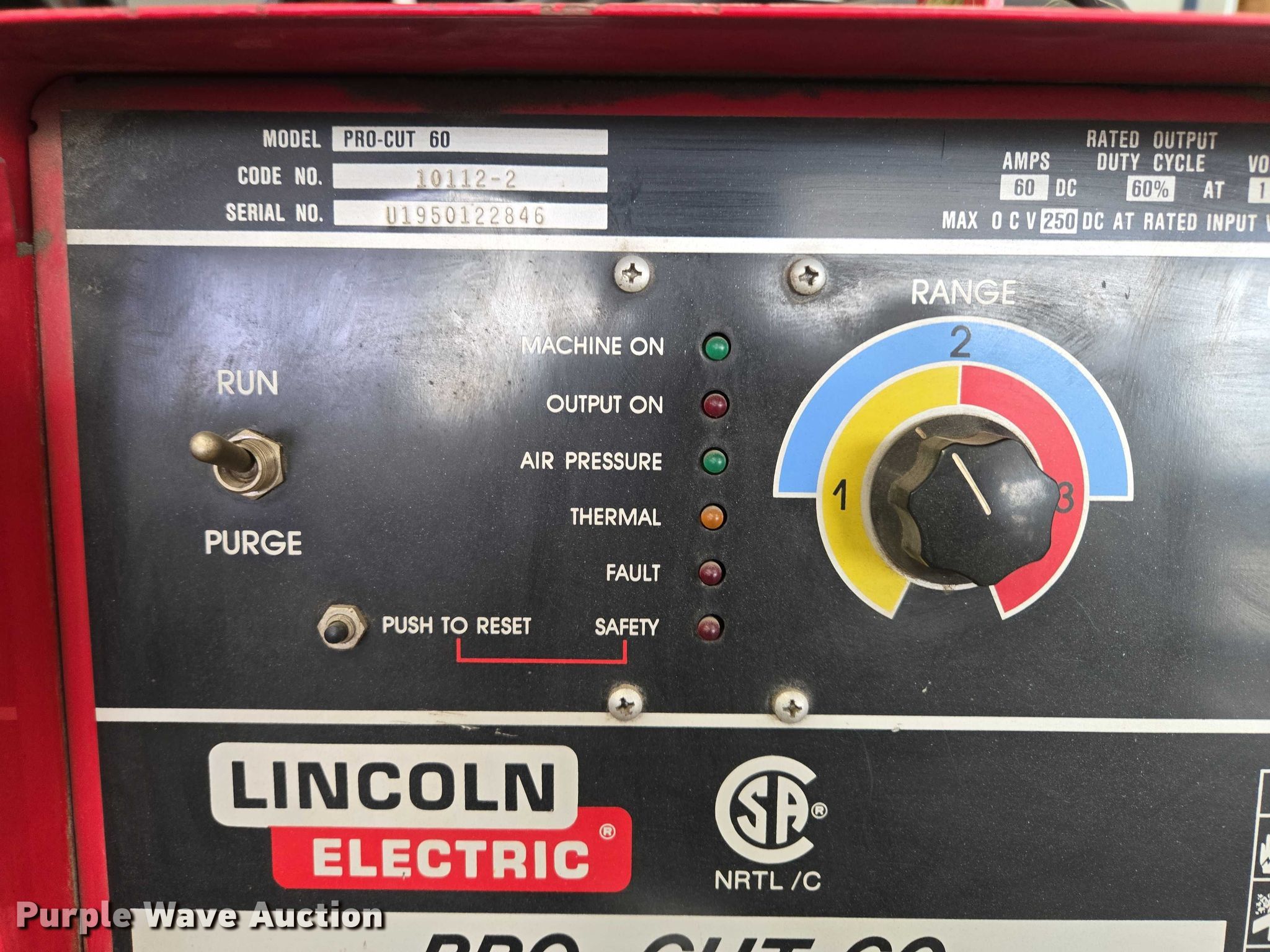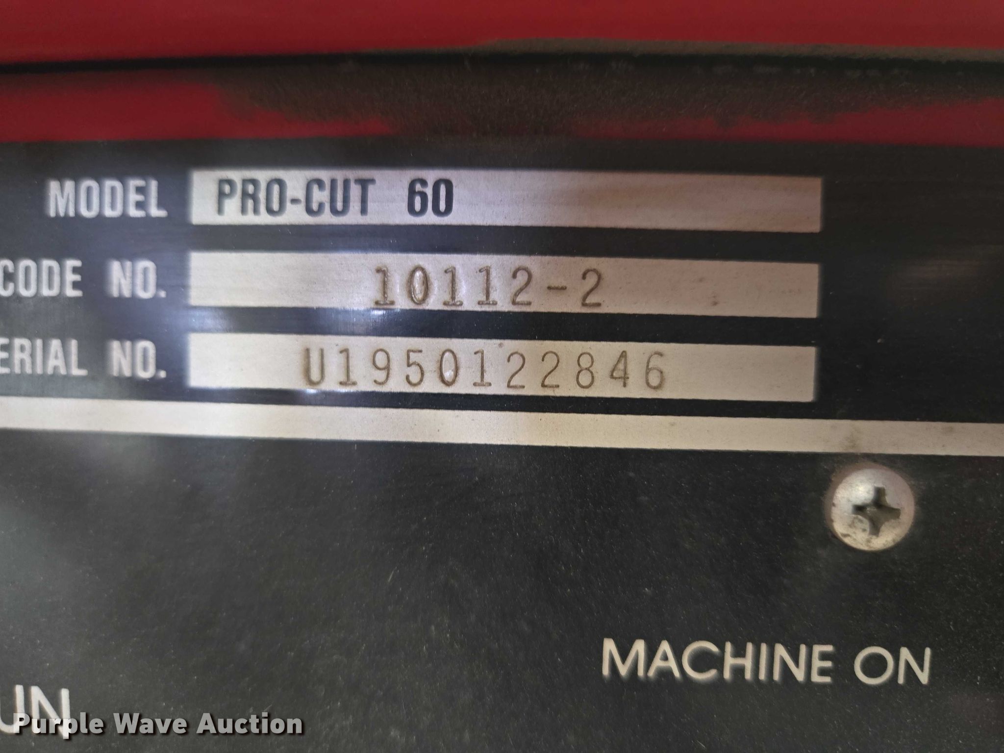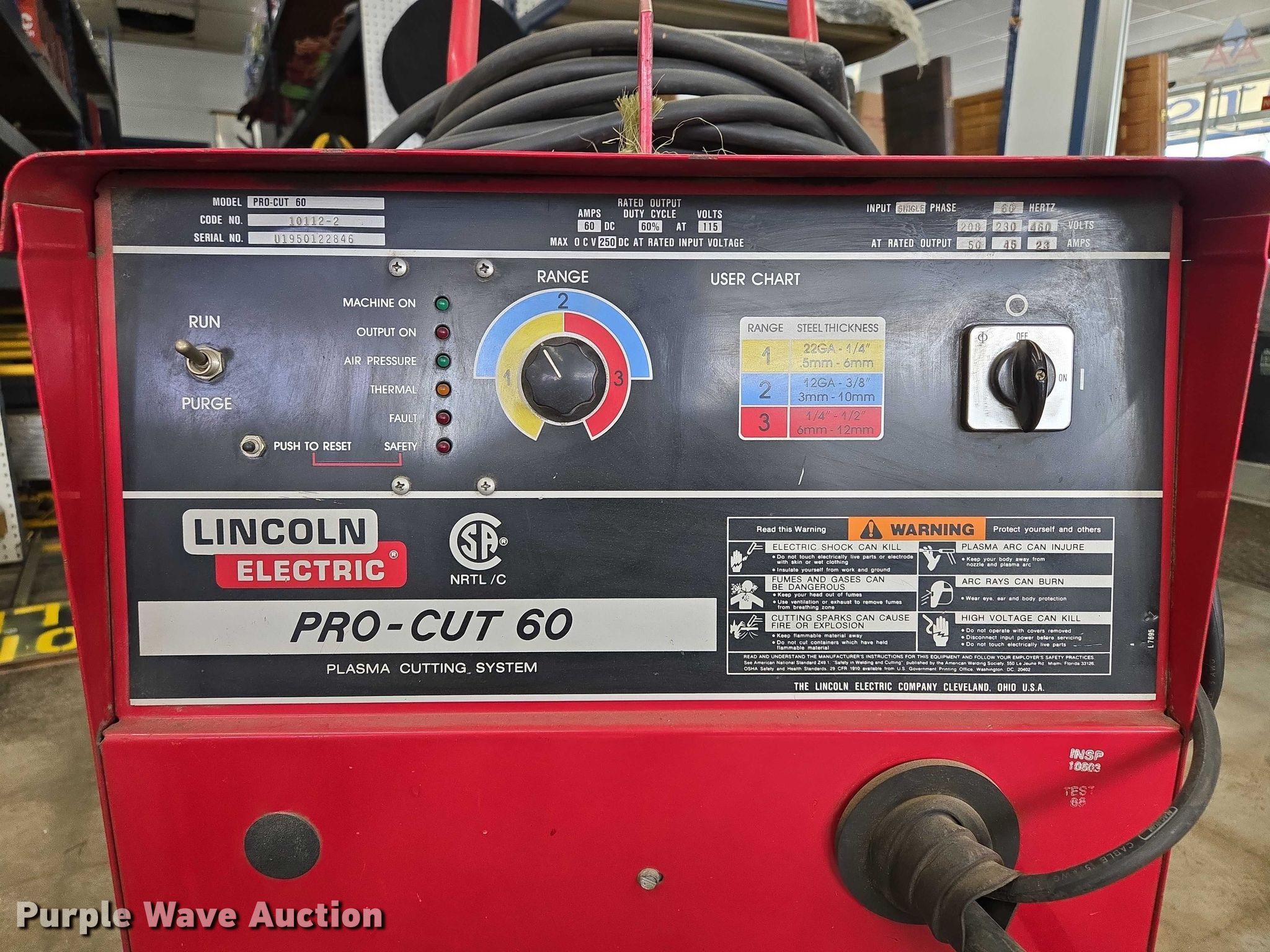 Purple Wave is selling a used Hand Held Plasma Cutter in Missouri. This item is a Lincoln Electric Pro-Cut 60 plasma cutter with the following: Serial: U1950122846
