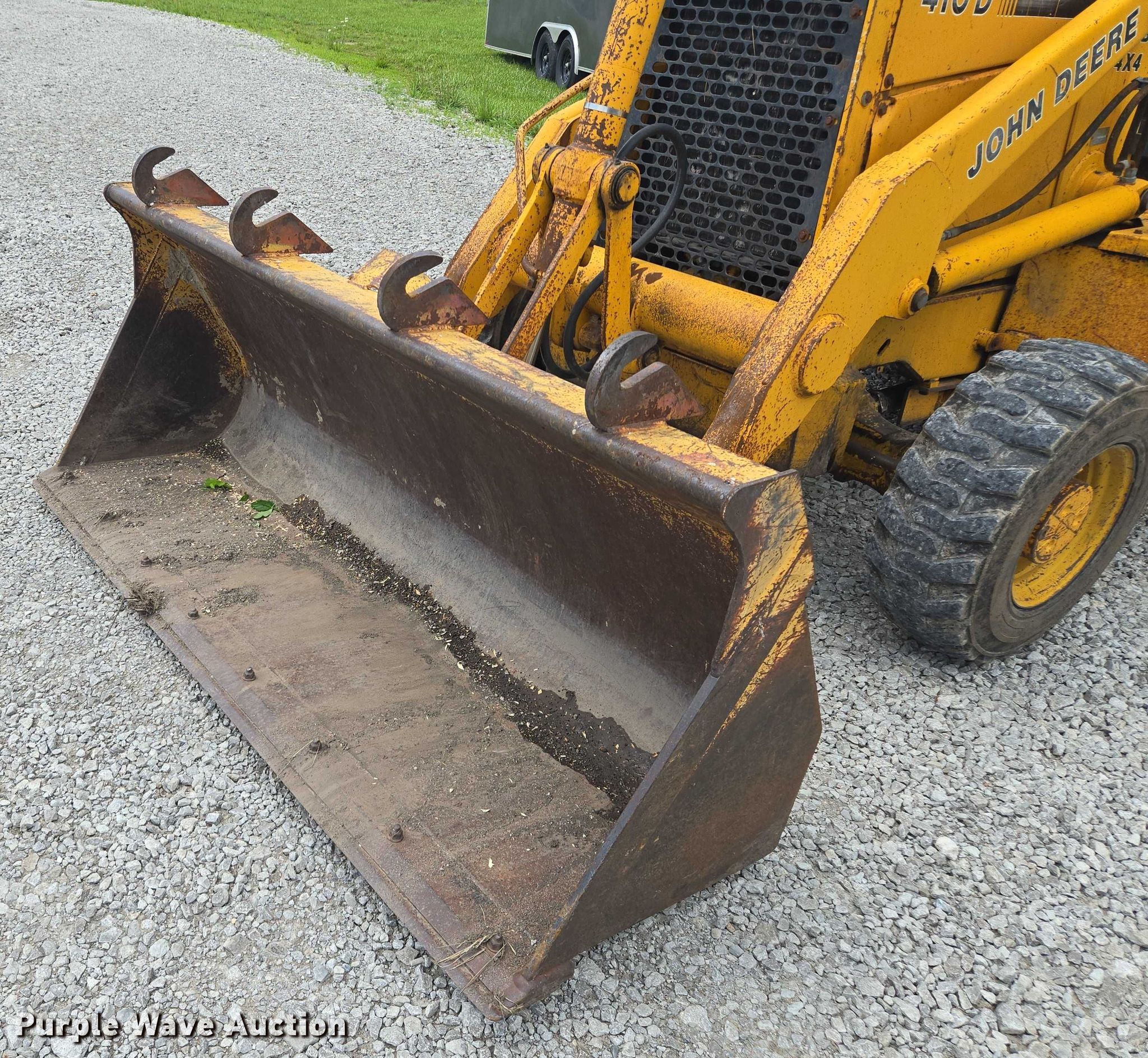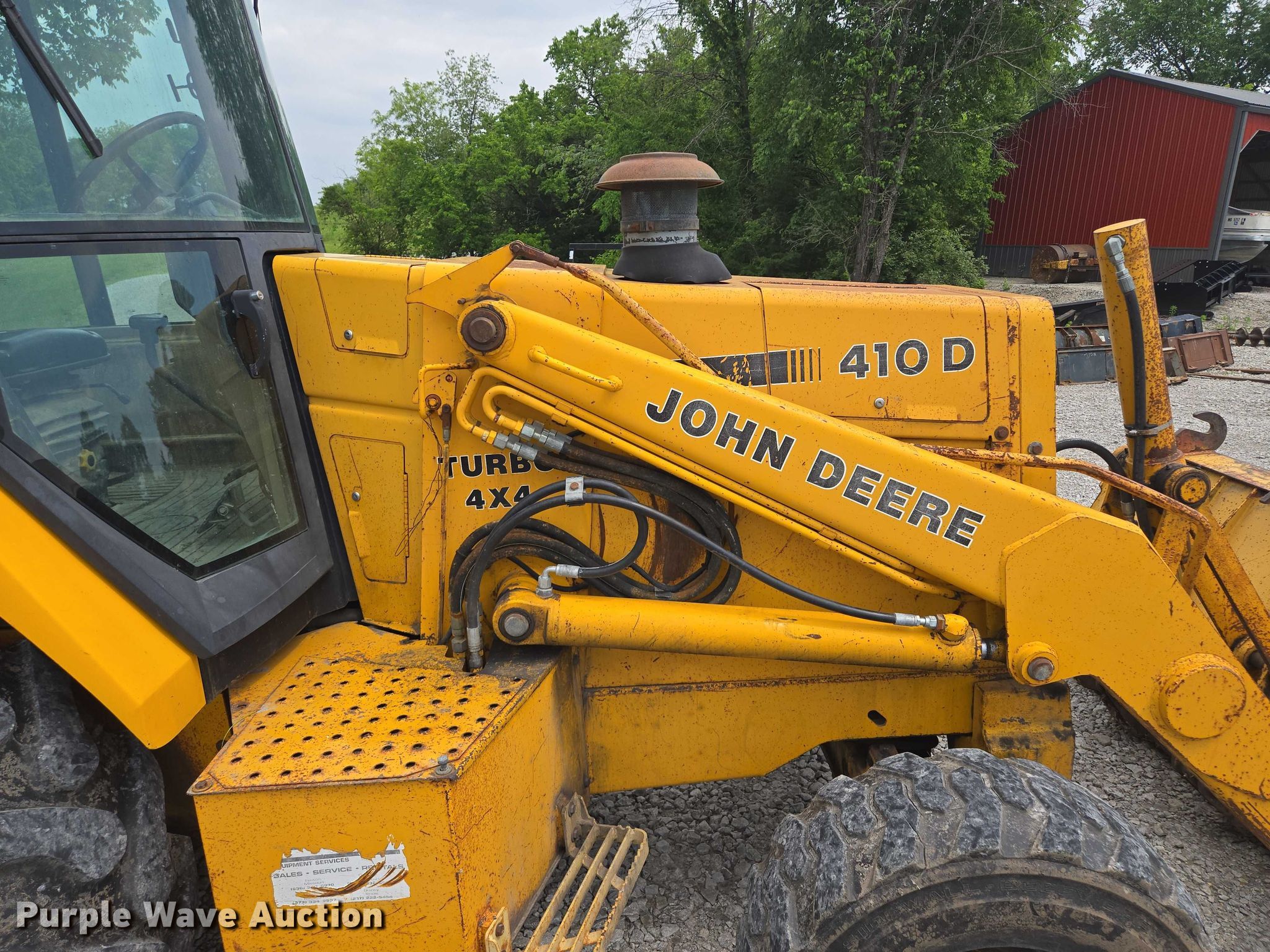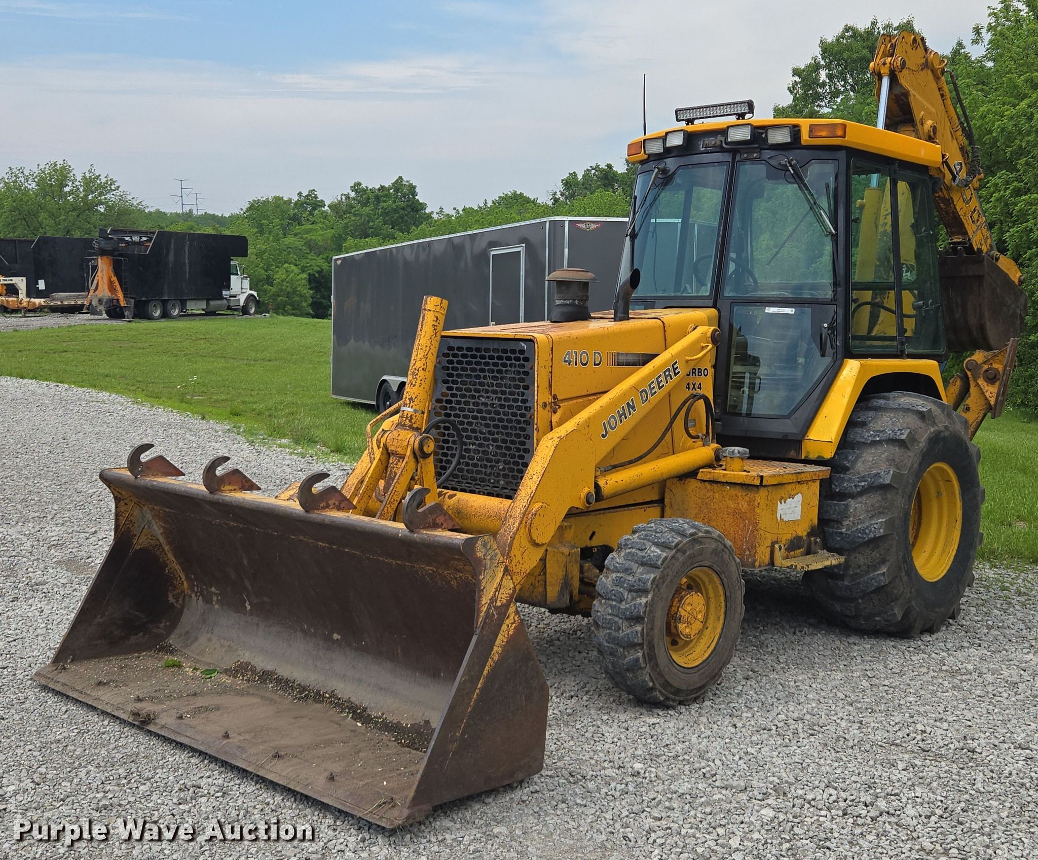 1991 John Deere 410D backhoe. Hours: 713 on meter Actual hours unknown, Serial: T0410DG780006. Engine Cylinders: 4, Fuel type: Diesel. Transmission Shuttle shift, 4F - 4R. Chassis Four wheel drive. Operators station Enclosed cab, Heat, Backhoe controls: Wobble stick / two stick. Features Loader Bucket Width: 92", Cutting edge: Weld-on, Backhoe Extendable stick, Bucket Width: 24", Cutting edge: Weld-on, Teeth: 5.. Tires Front: 12-16.5RG400, Rear: 21L-24. Notes Boom cylinder issues, leaks. Workhorse General Contracting. Turney, MO 64493