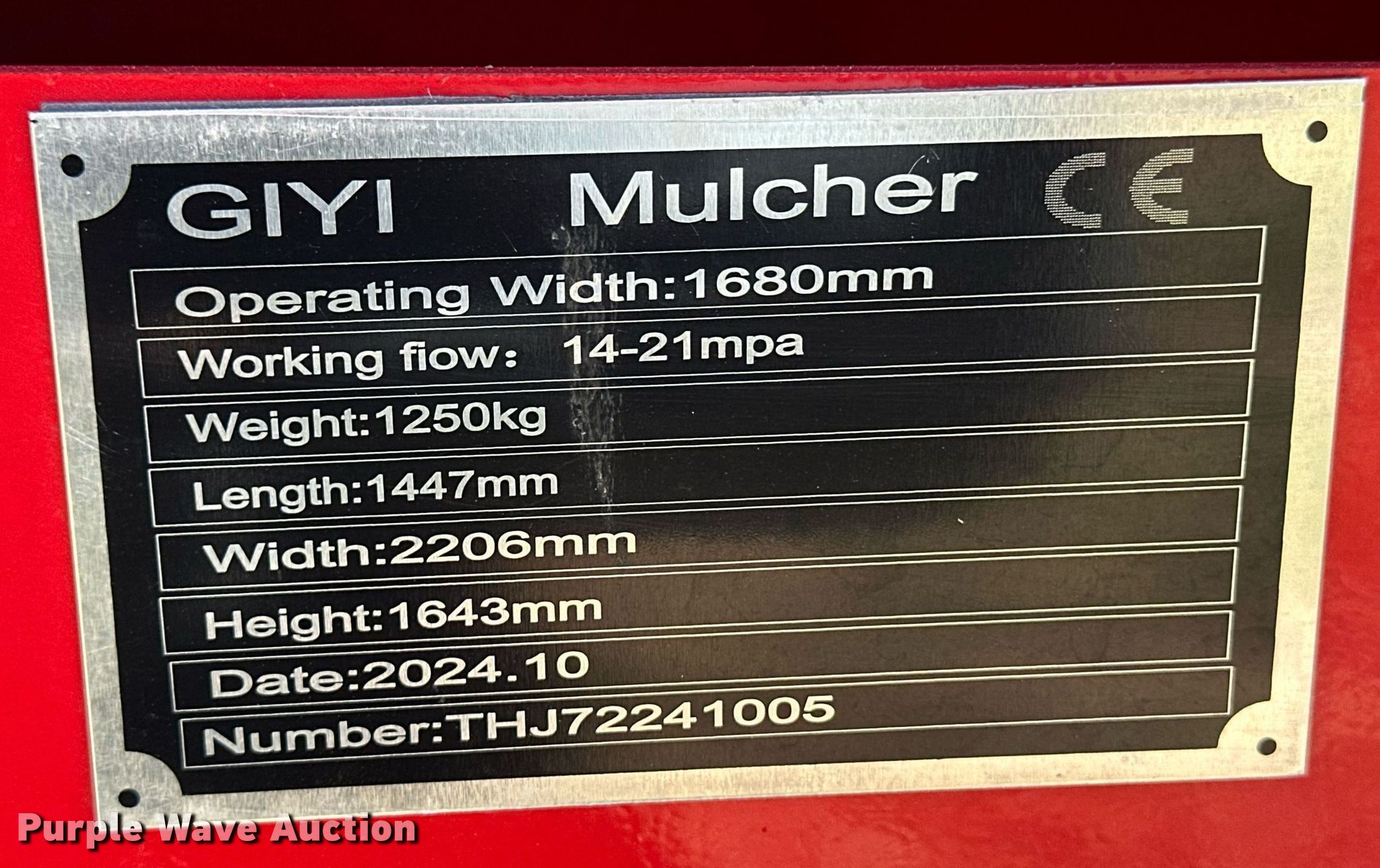 Purple Wave is selling a used Skid Steer Attach. in Oklahoma. This item is a 2024 GIYI skid steer mulcher with the following: Serial: THJ72241005, Width: 72", Unused