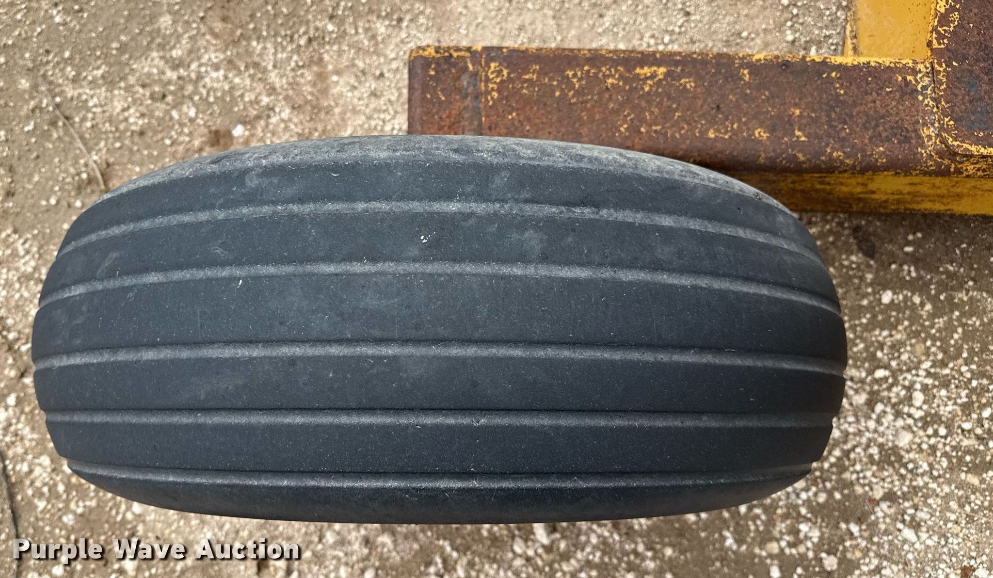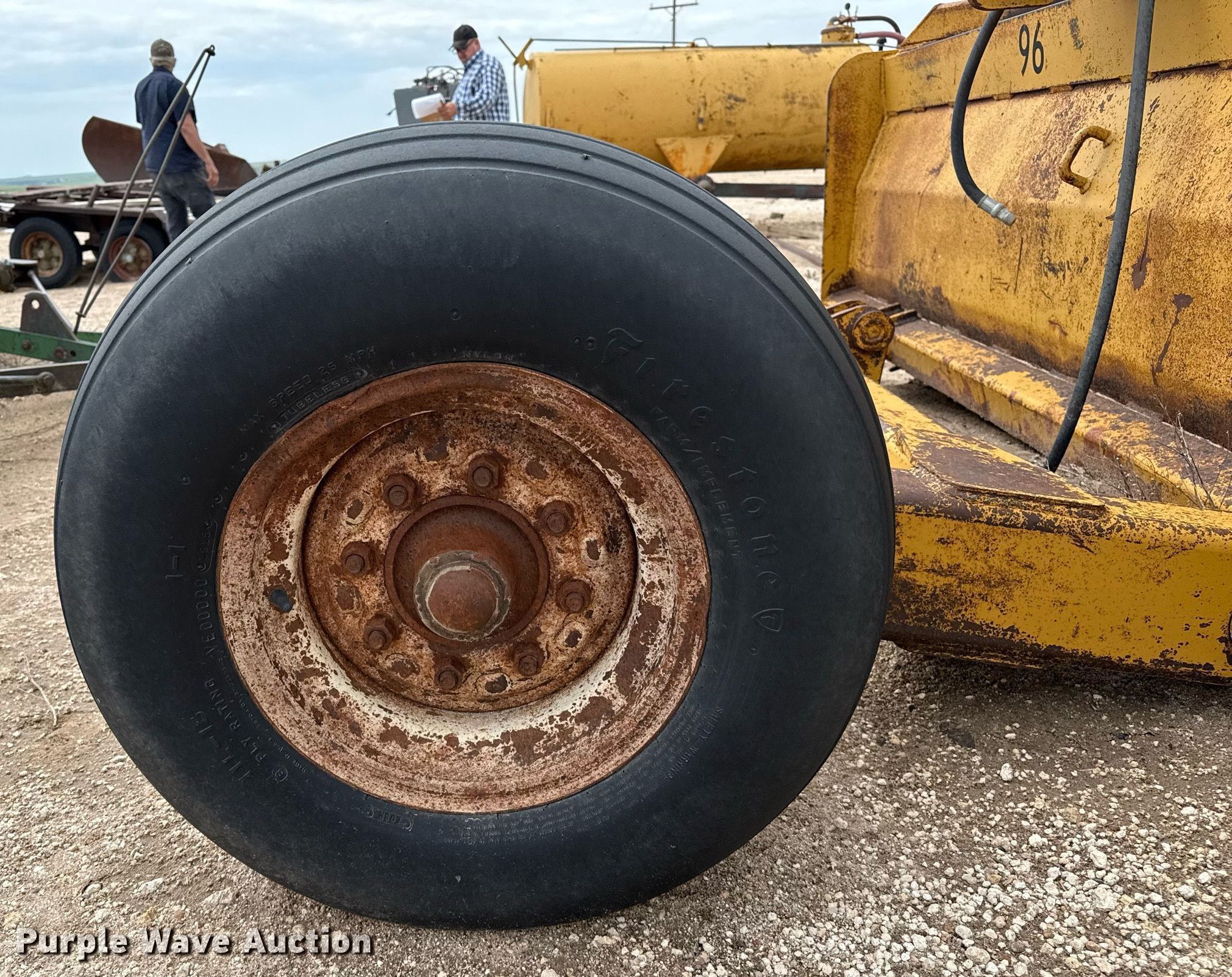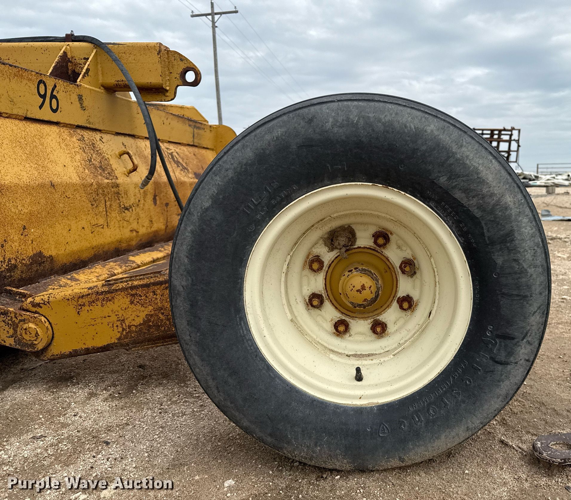Holcomb scraper. Serial: 980710. Features Width: 10', Hydraulic lift. Tires Size: 11L-15. Notes Hydraulic cylinder missing. Cobalt Cattle Company. Leoti, KS 67861