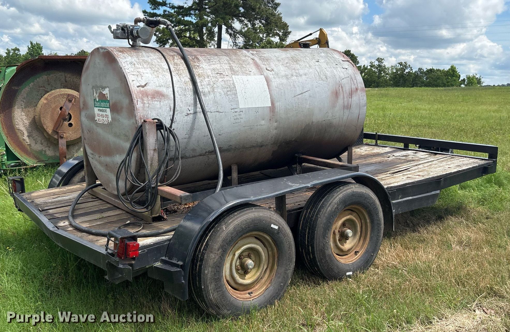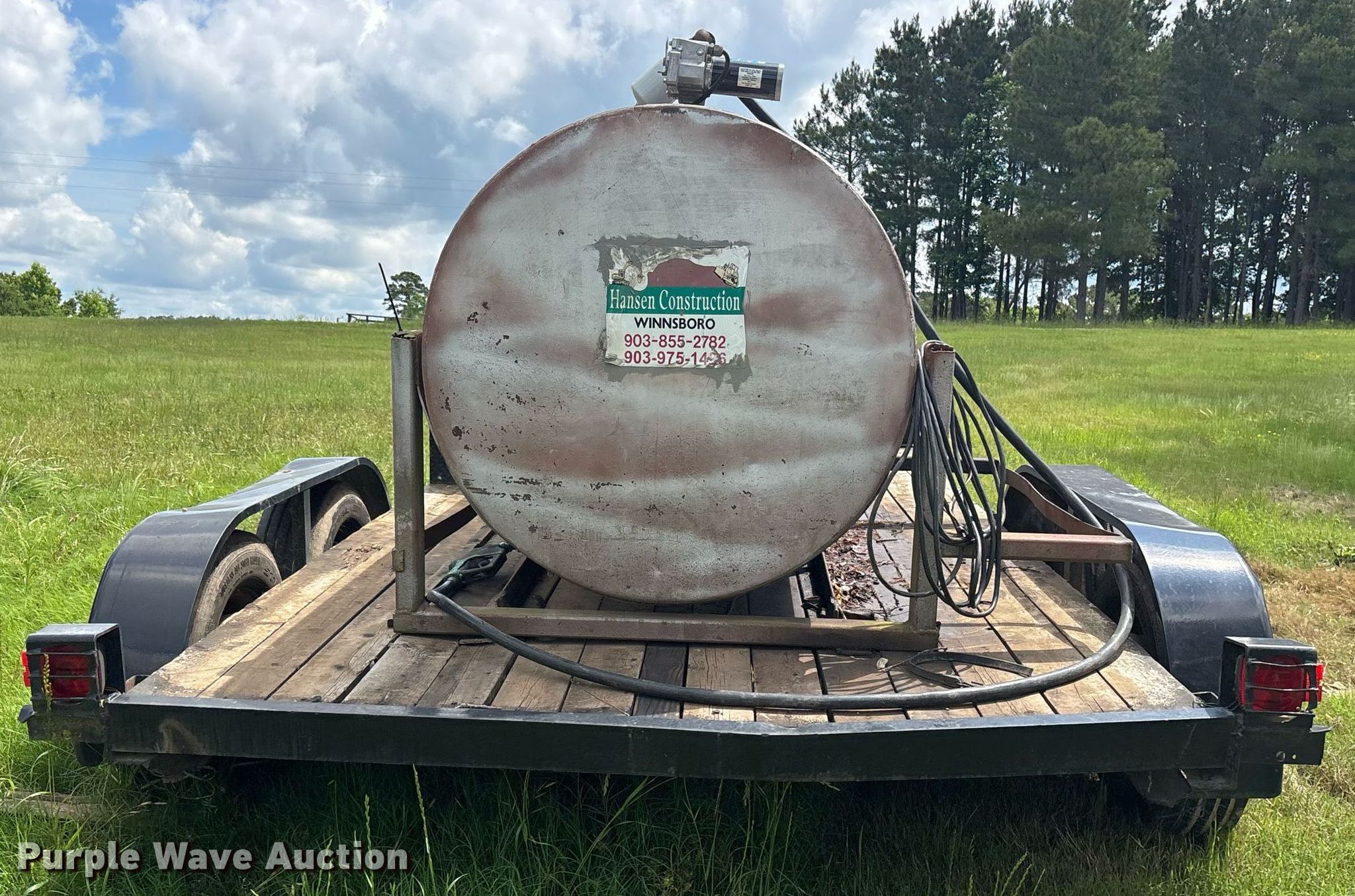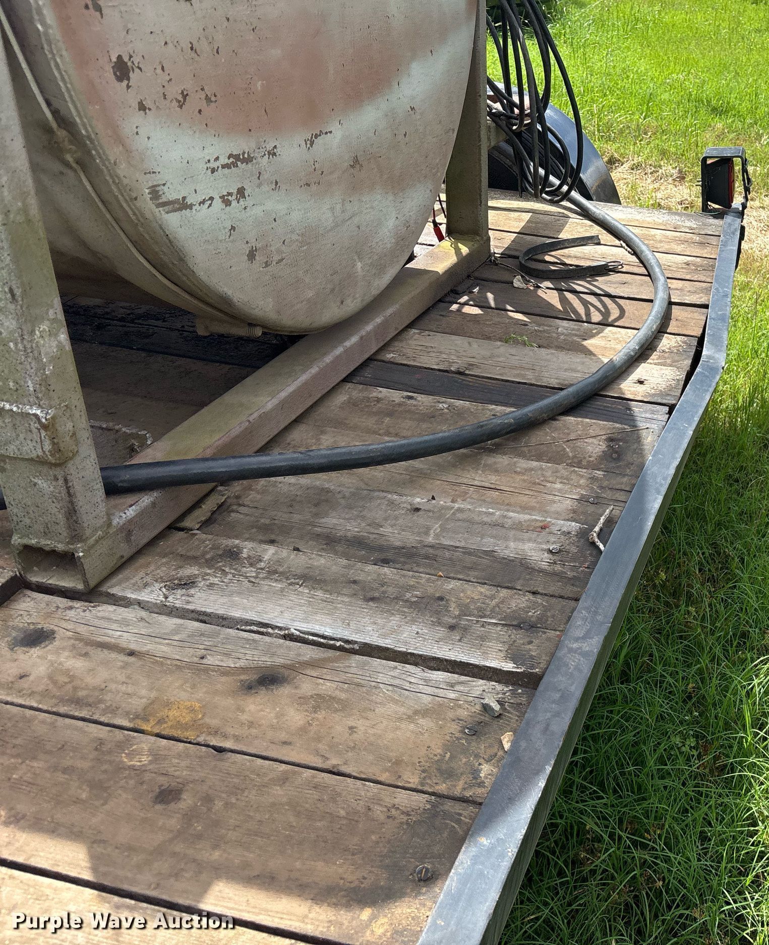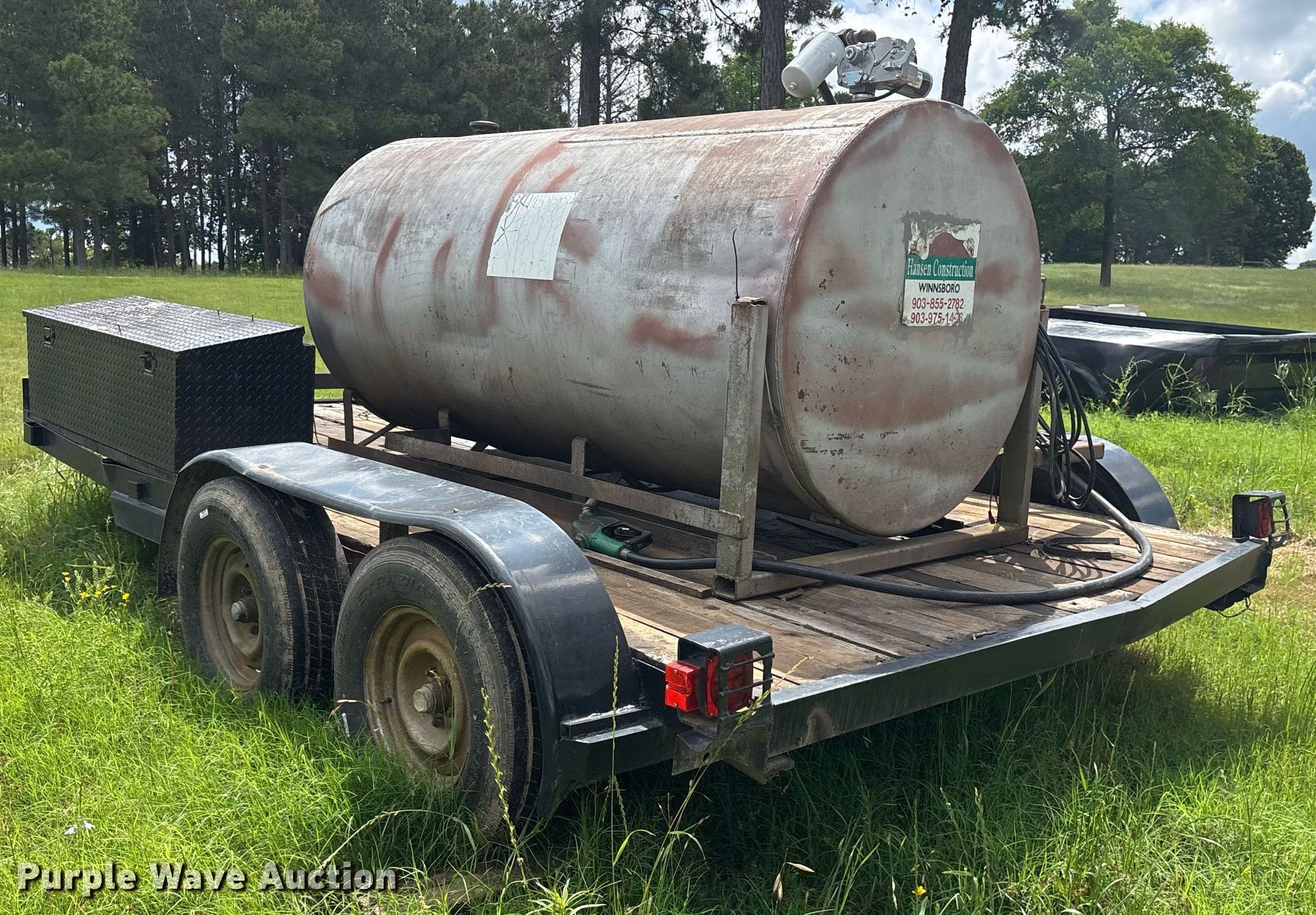 1999 Shop built utility trailer. VIN: 6775. Dimensions Overall: 17' L x 8' 6" W. Features Tank Tank type: Steel, Capacity: 500 gallons, Pump, Hose, Nozzle. Chassis Ball hitch: 2", Landing gear: Single, Suspension: Spring, Axles: Tandem, GVWR: 3,000 lbs. Tires Steel wheels, Size: ST225/75R15. Transfer of ownership documentation will be a bill of sale. Winnsboro, TX 75494