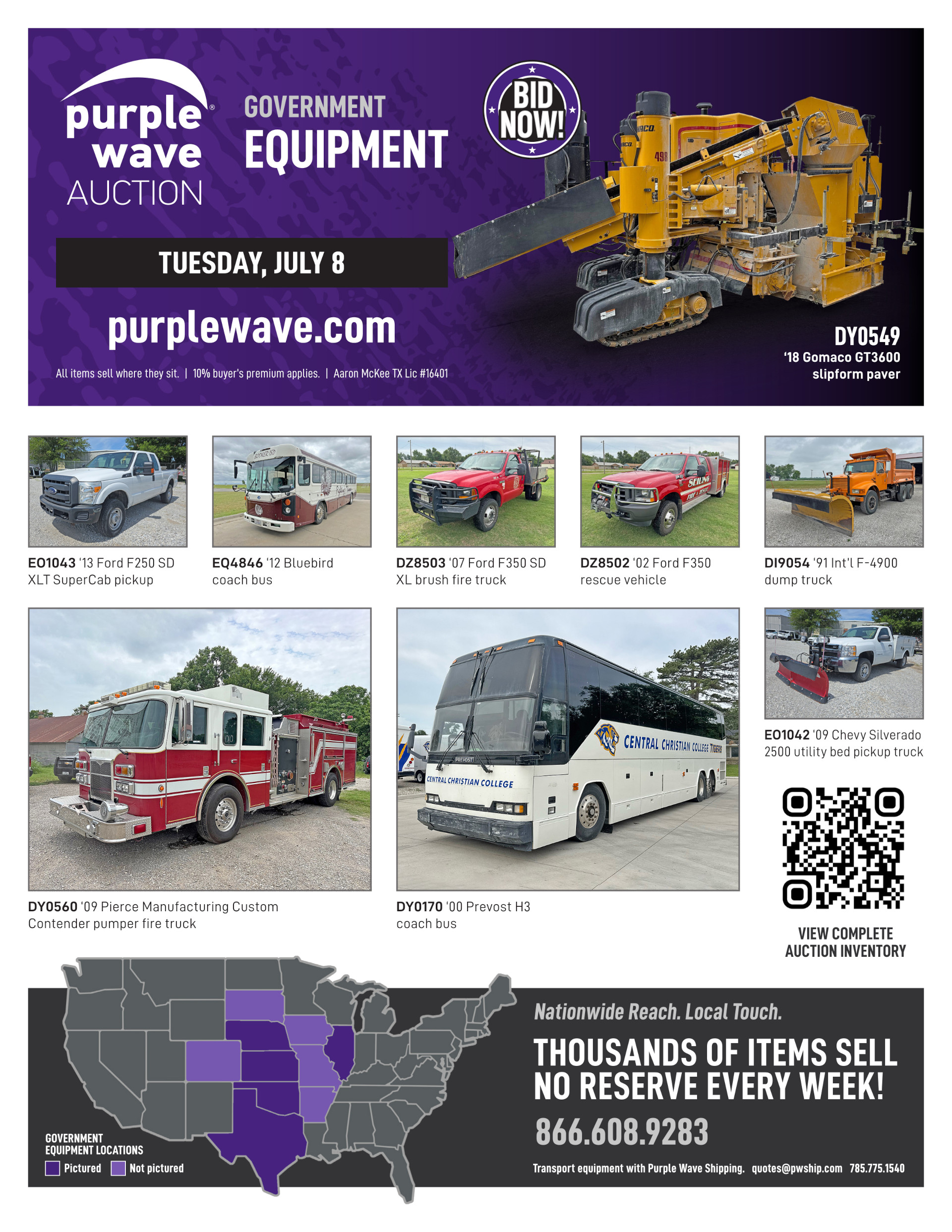 Purple Wave Shipping, LLC provides shipping and transportation services to winning bidders on ag, construction and fleet type assets. Purple Wave Shipping, LLC does not provide shipping on items weighing less than 1,000 pounds.