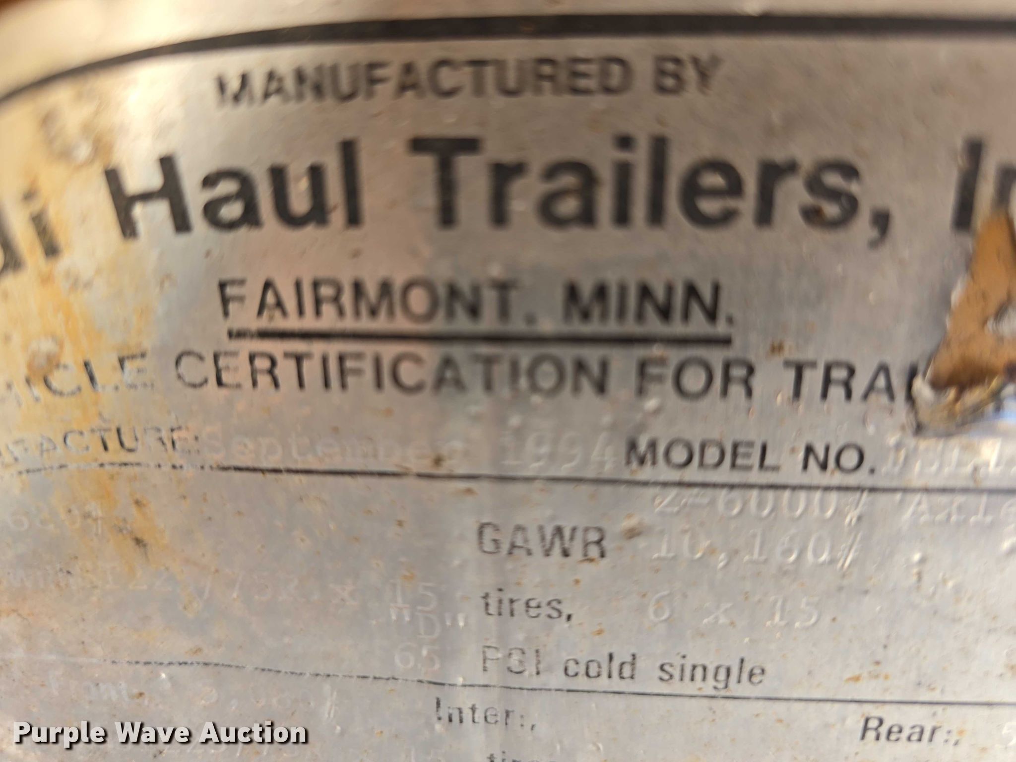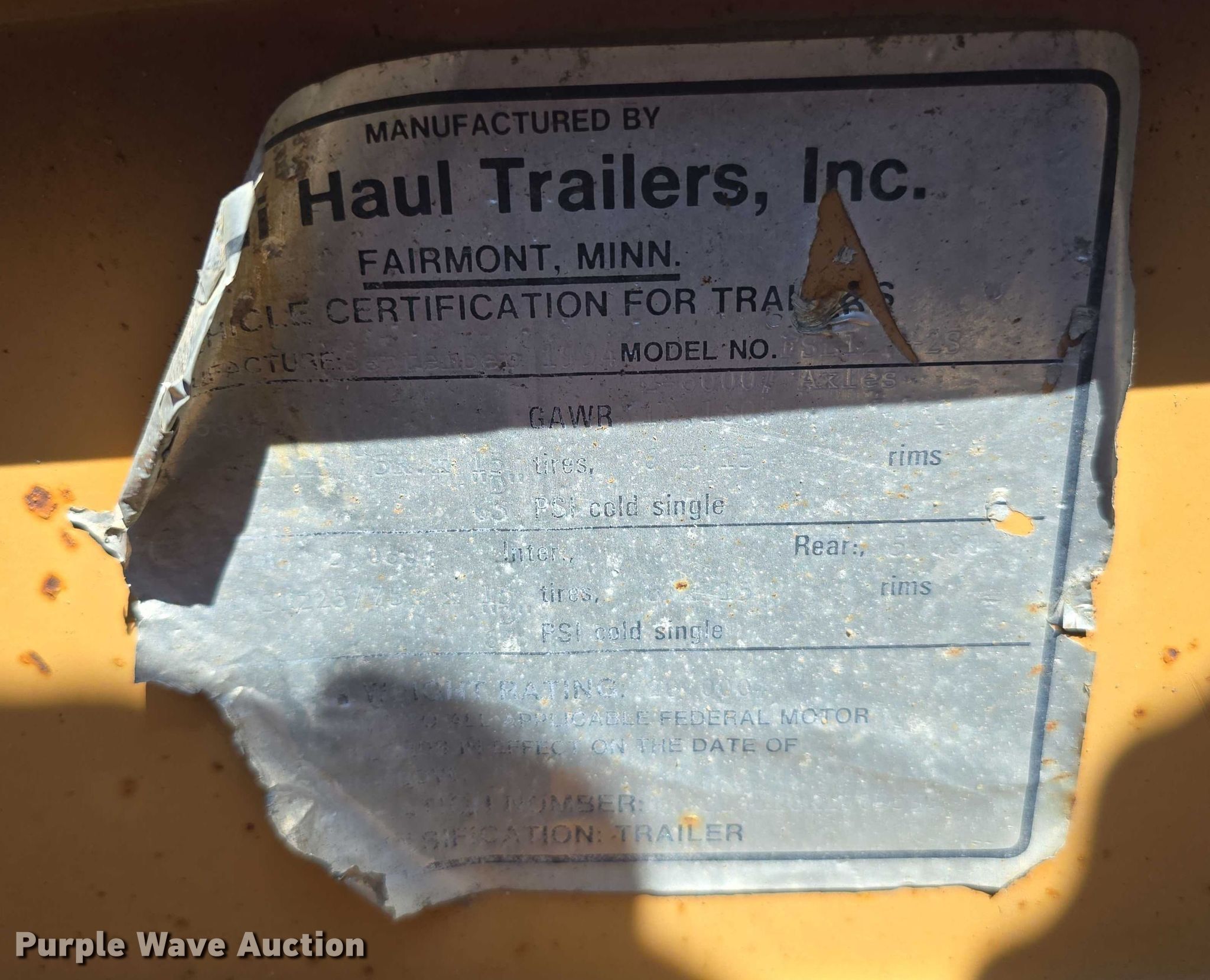 1994 Redi Haul Trailers FSL12 utility trailer. VIN: 47SS142T0R1009599. Dimensions Overall: 19' L x 96" W, Deck: 14' L x 74" W. Features Deck type: Wood. Chassis Landing gear: Single, Suspension: Spring, Brakes: Hydraulic, Axles: Tandem, GVWR: 20,000 lbs, GAWR: 10,150 lbs. Tires Steel wheels, Size: ST225/75R15. Nebraska title. Title distribution may be delayed up to 14 days from verification of funds. City of Kearney, NE. Kearney, NE 68847