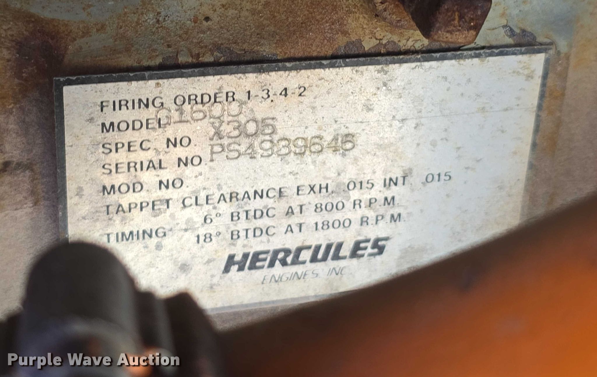 White Engines pump. Hours: 899 on meter, Serial: 66094D, VIN: 4TCCGW318266094E. Engine Hercules G1600, Serial: PS4939646, Cylinders: 4, Fuel type: Gas. Features Overall dimensions: 11' L x 54" W, Pump Inlet: 5" diameters, Outlet: 5" diameters, Hose. Chassis Hitch: Pintle, Landing gear: Single. Tires Size: P215/75R15. Notes Possible fuel pump issue, Unknown operating condition. This is worksite support equipment and will not come with a title. Transfer of ownership documentation will be a bill of sale. City of Kearney, NE. Kearney, NE 68847