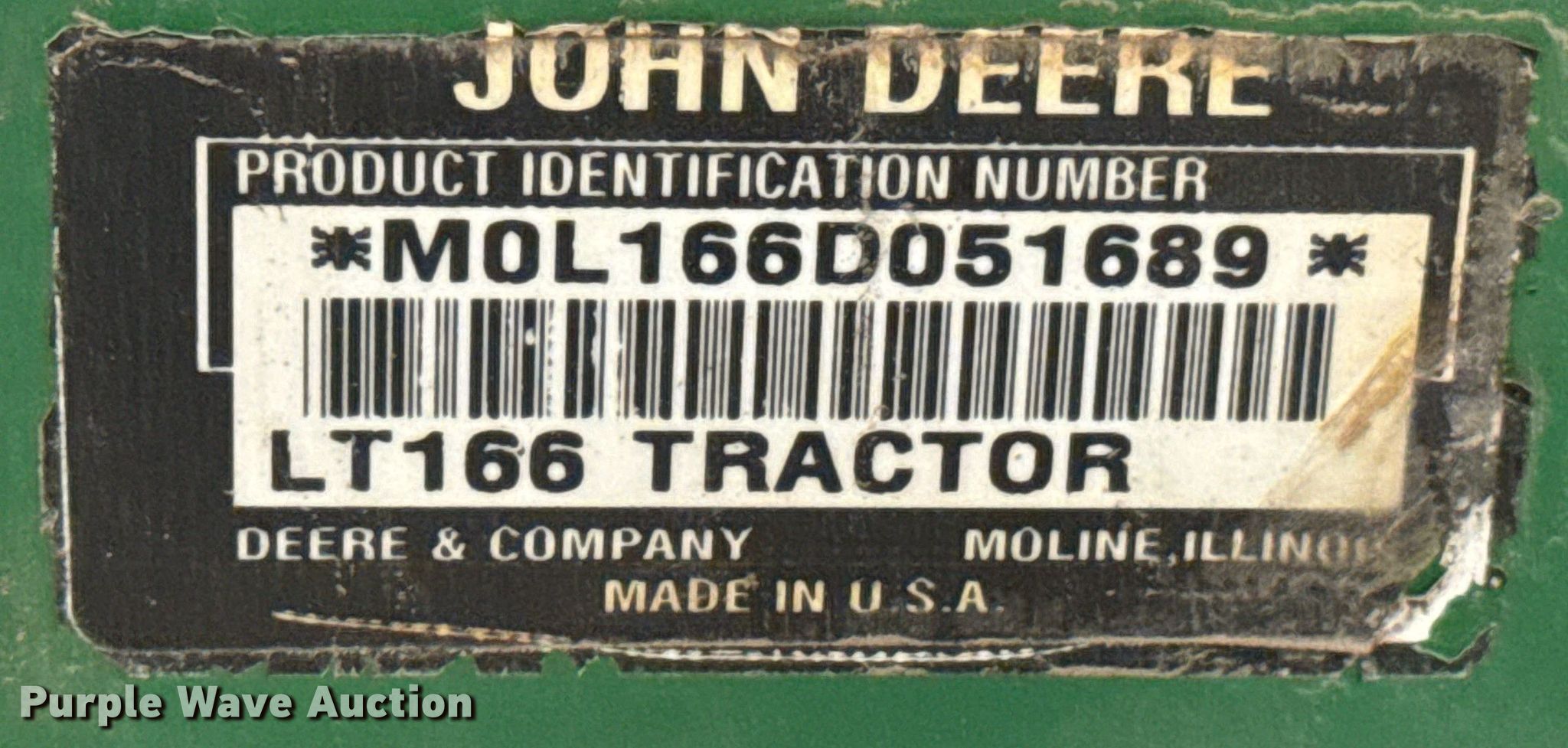 Purple Wave is selling a used Lawn Mower in Oklahoma. This item is a 1999 John Deere LT166 lawn mower with the following: Cutting width: 40", Serial: M0L166D051689