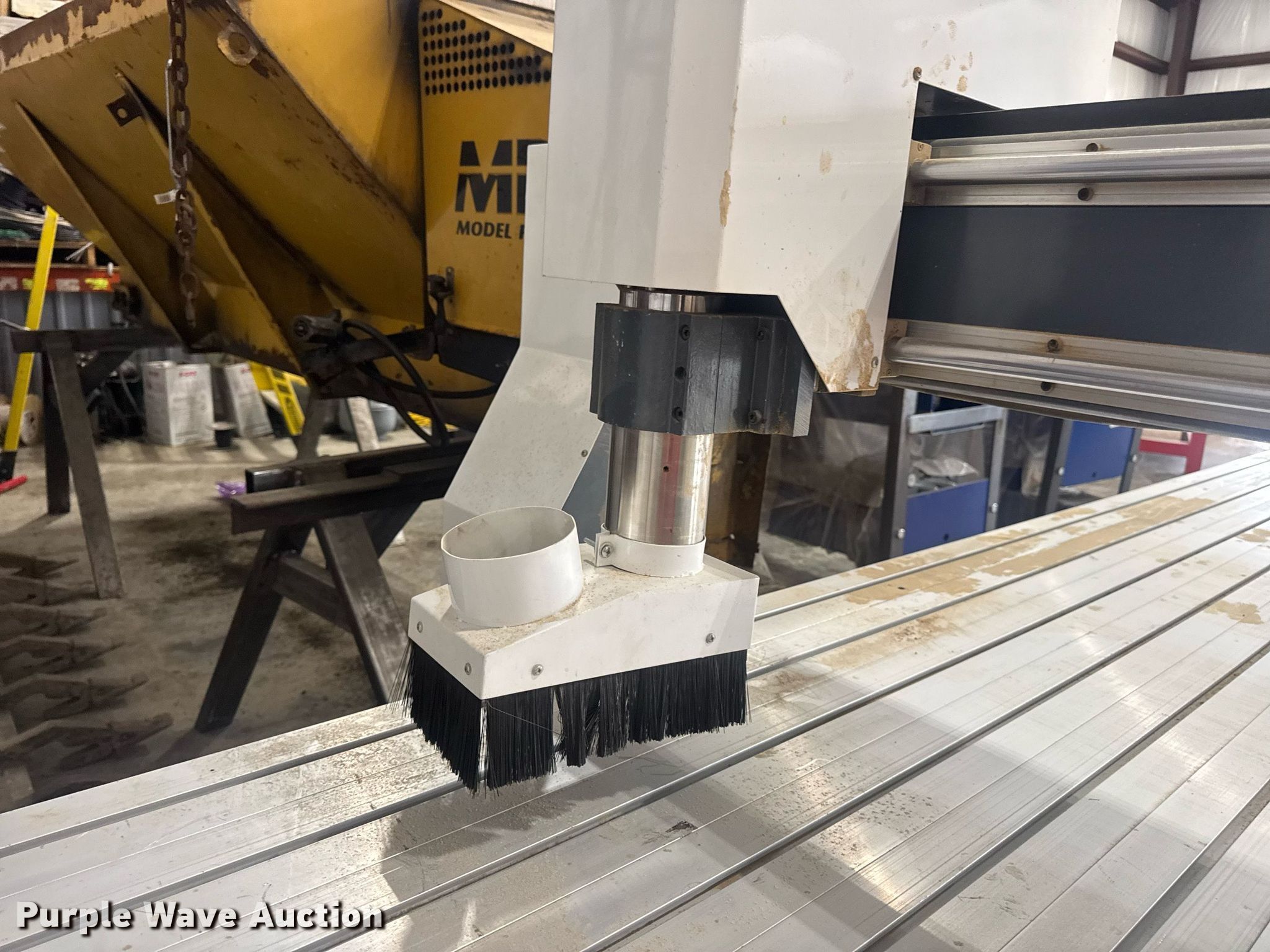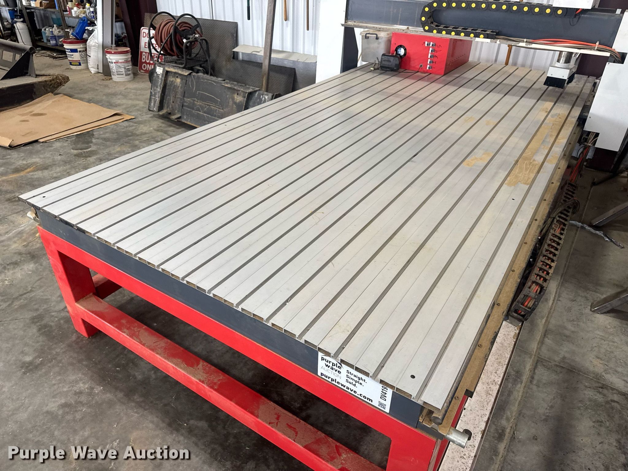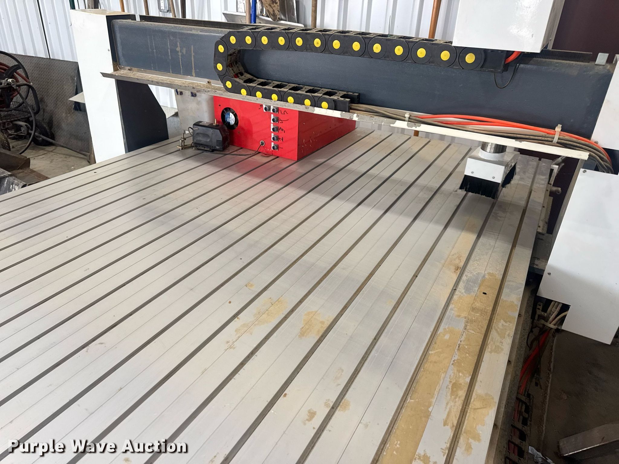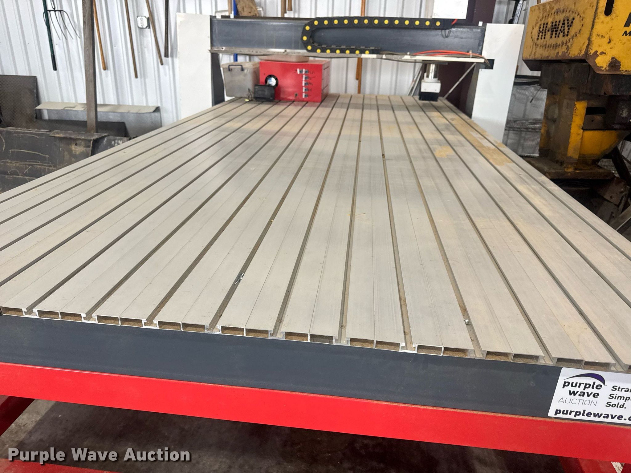 Purple Wave is selling a used Lathe CNC in Missouri. This item is a CNC router table with the following: 11' 4" L x 63.75" W, Sliding X & Y axis, Router, Control box
