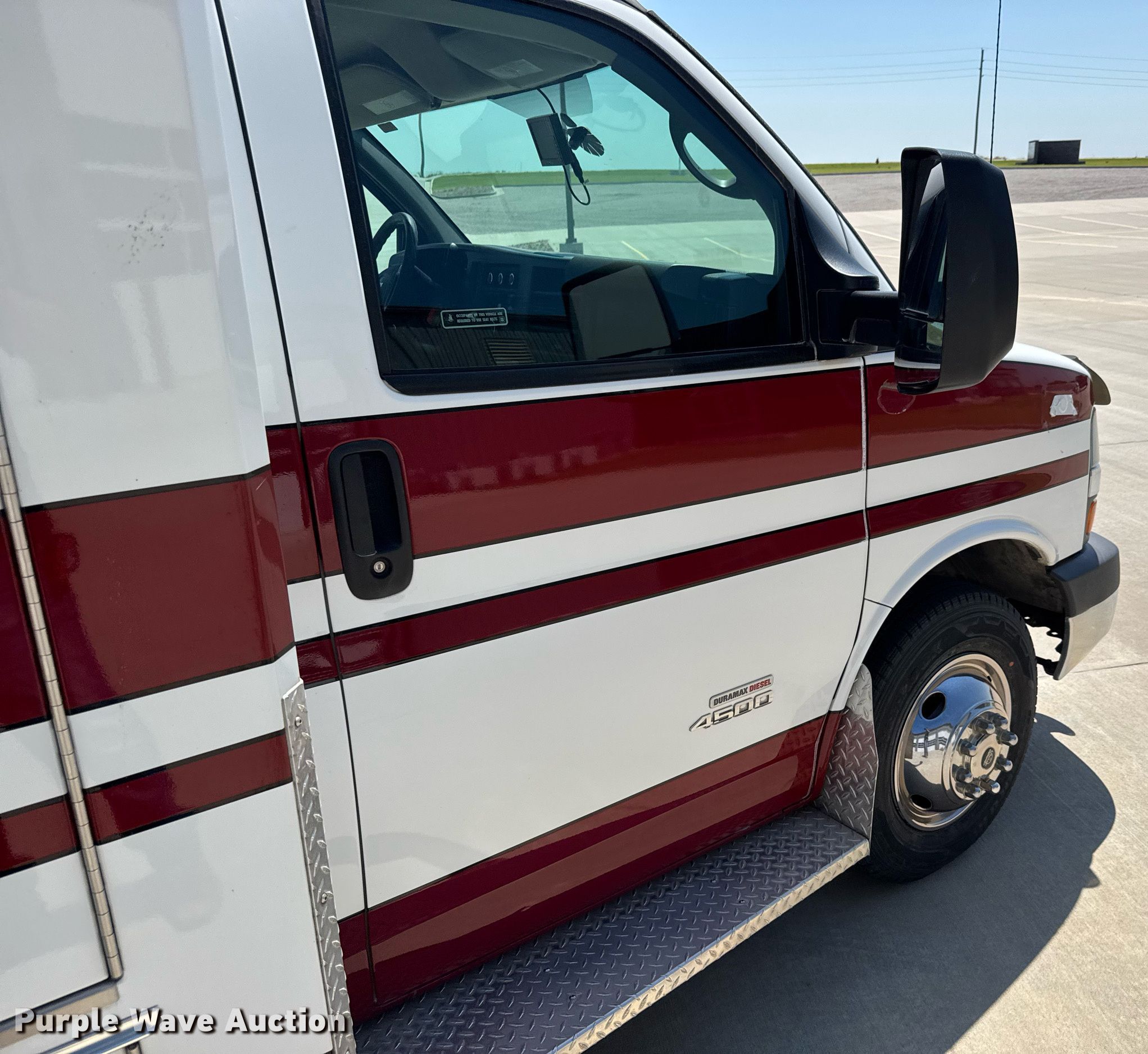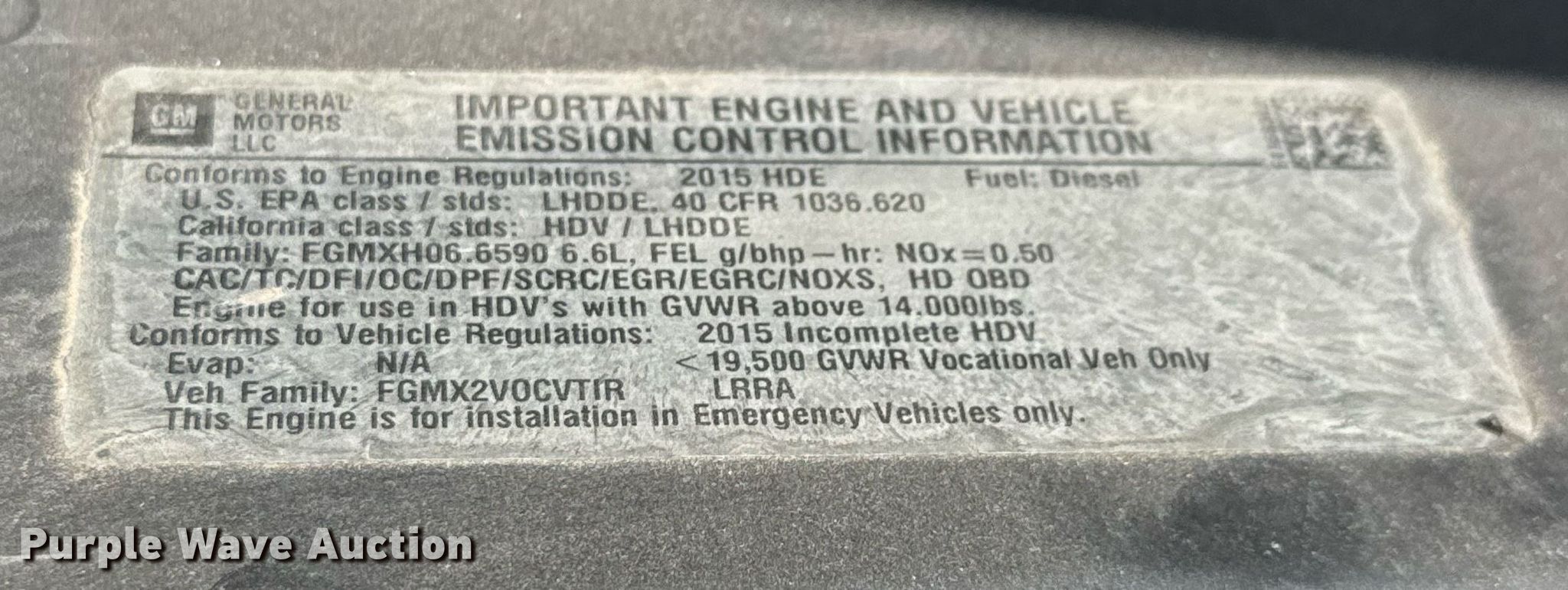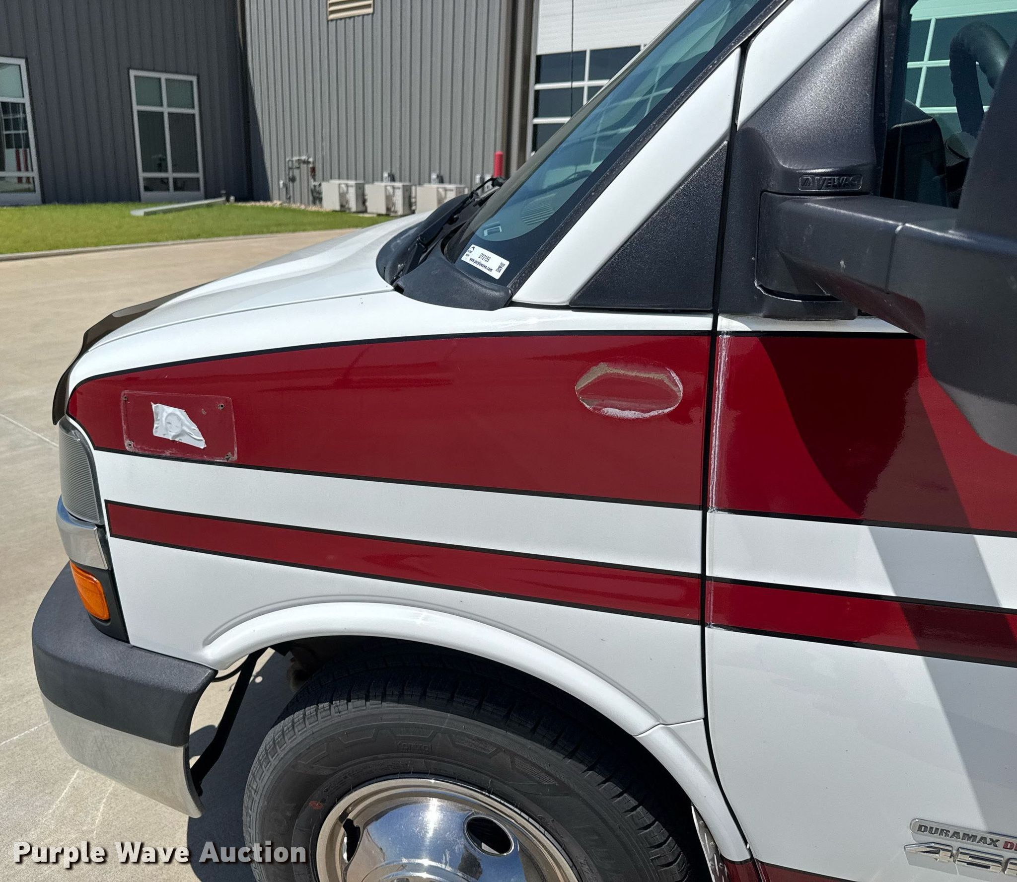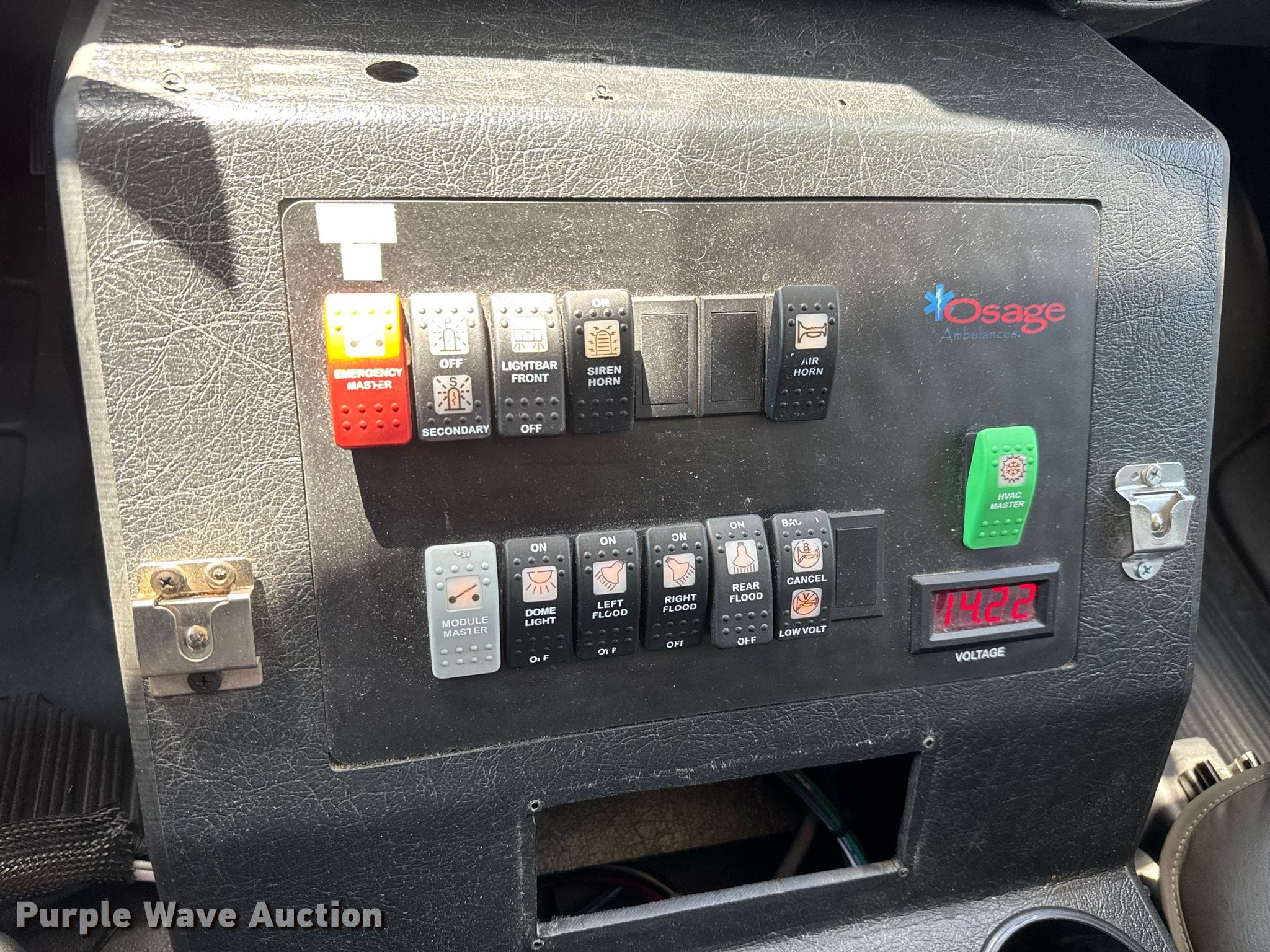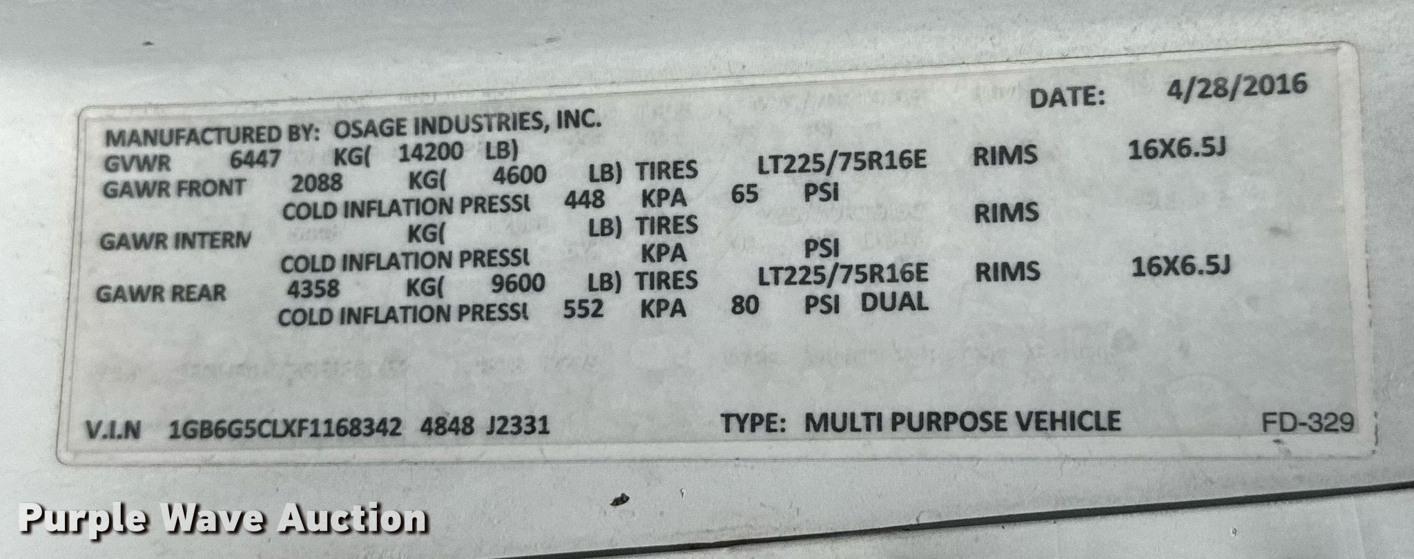 2015 Chevrolet Express G4500 ambulance. Miles: 110,323 on odometer, Hours: 5,068 on meter, VIN: 1GB6G5CLXF1168342. Engine Displacement: 6.6L, Cylinders: 8, Fuel type: Diesel. Transmission Automatic. Chassis Axles: Single, Suspension: Spring, Brakes: Hydraulic, GVWR: 14,200 lbs. Interior AC, Heat, Heated mirrors, Power windows, Power locks, Cruise control, Backup camera, Auxiliary controls. Features Ambulance body Osage Industries, Oxygen hookups. Tires Size: 225/75R16. Notes Dash warning indicator: Check engine, Windshield chipped or cracked, Turbo issue, overboost. Kansas title. Title distribution may be delayed up to 14 days from verification of funds. Pratt, KS 67124