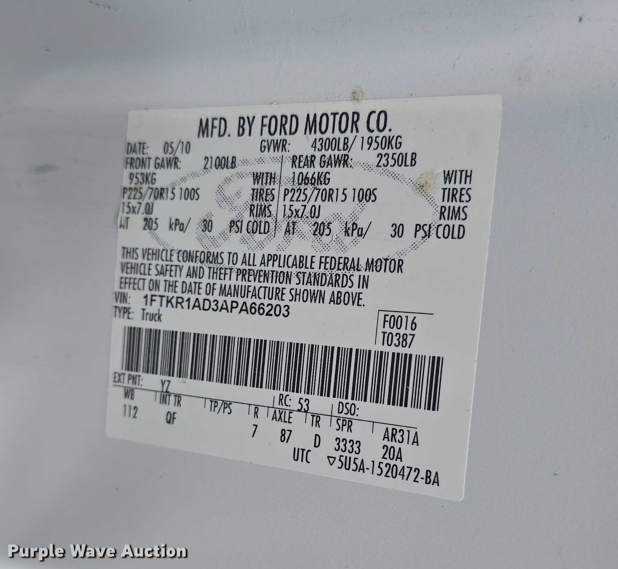 Purple Wave is selling a used Compact Pickup or Van in Kansas. This item is a 2010 Ford Ranger XL pickup truck with the following: Miles: 86,045 on odometer, VIN: 1FTKR1AD3APA66203, Unit #: 5876