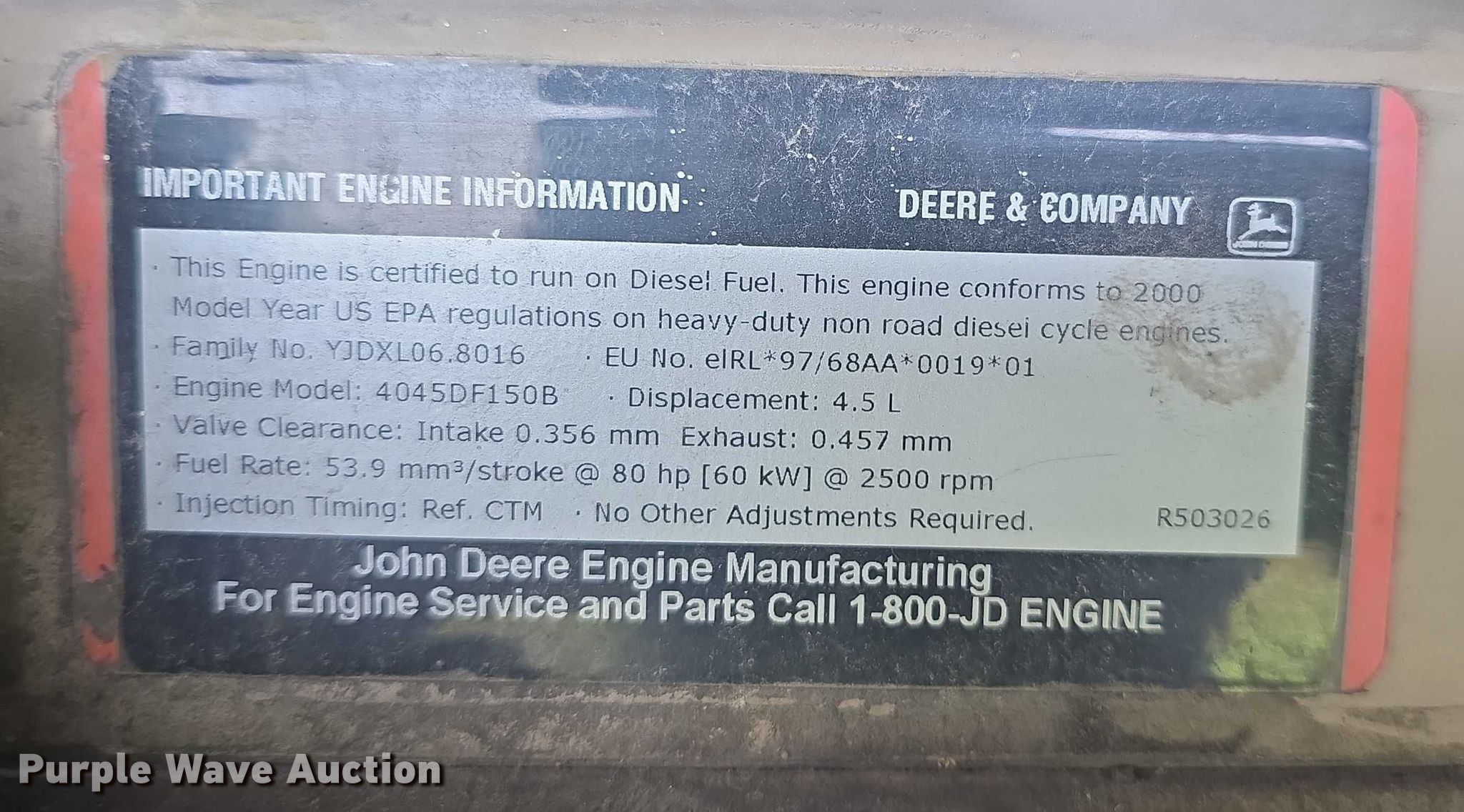 2000 Ingersoll Rand 185 air compressor. VIN: 4FVCABCA5YU314129, Unit #: 8191. Engine John Deere 4045DF150B, Displacement: 4.5L, Cylinders: 4, Fuel type: Diesel, HP: 80, kW: 60. Trailer 7' L x 4" W, Hitch: Pintle, Suspension: Spring, Axles: Single, Tire size: 225/75R15, GVWR: 1,580 lbs. Notes Battery missing, Flywheel issues, teeth missing , Non-operational unit. This is worksite support equipment and will not come with a title. Transfer of ownership documentation will be a bill of sale. City of Olathe. Olathe, KS 66061
