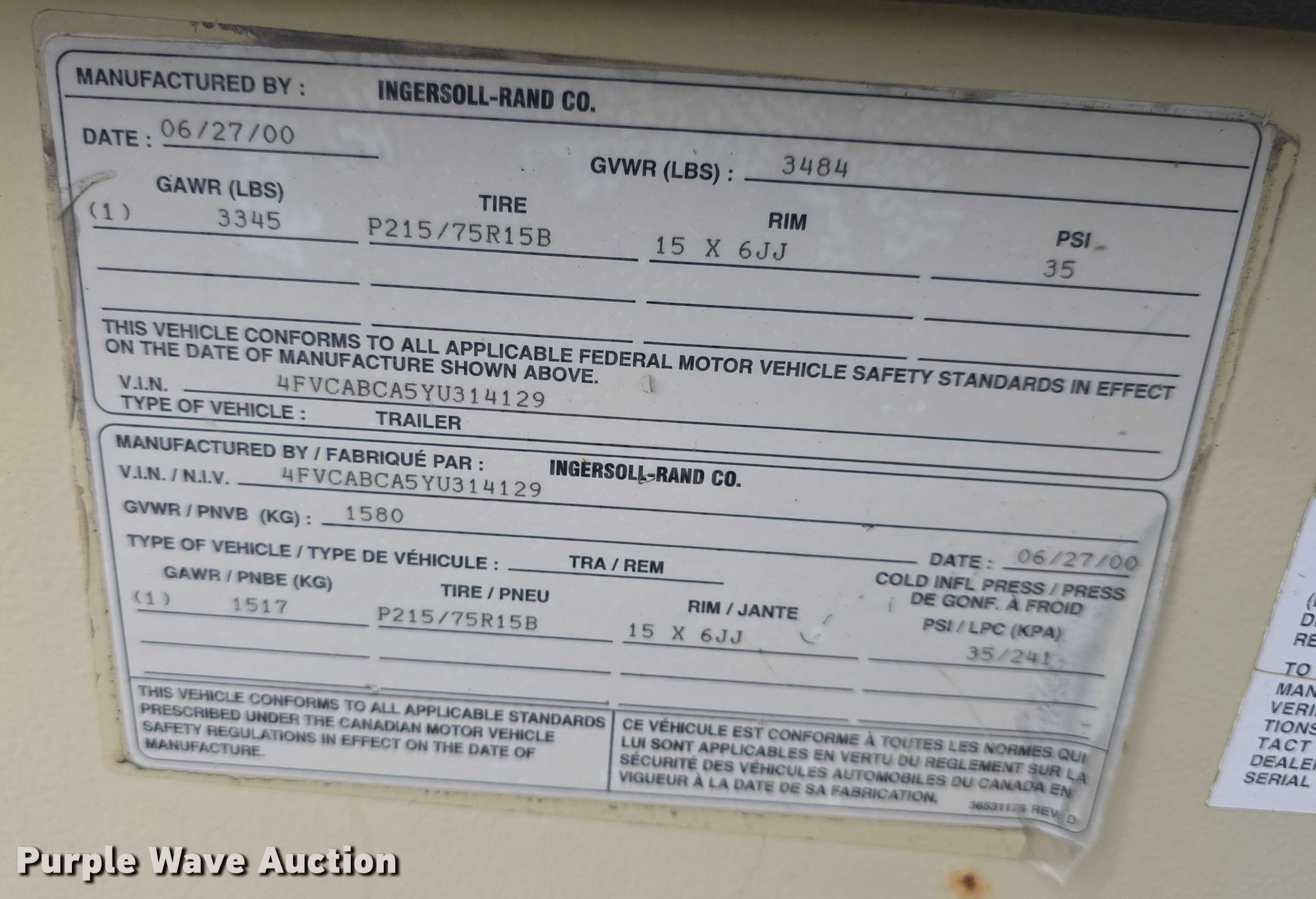 Purple Wave is selling a used Air Compressor in Kansas. This item is a 2000 Ingersoll Rand 185 air compressor with the following: VIN: 4FVCABCA5YU314129, Unit #: 8191