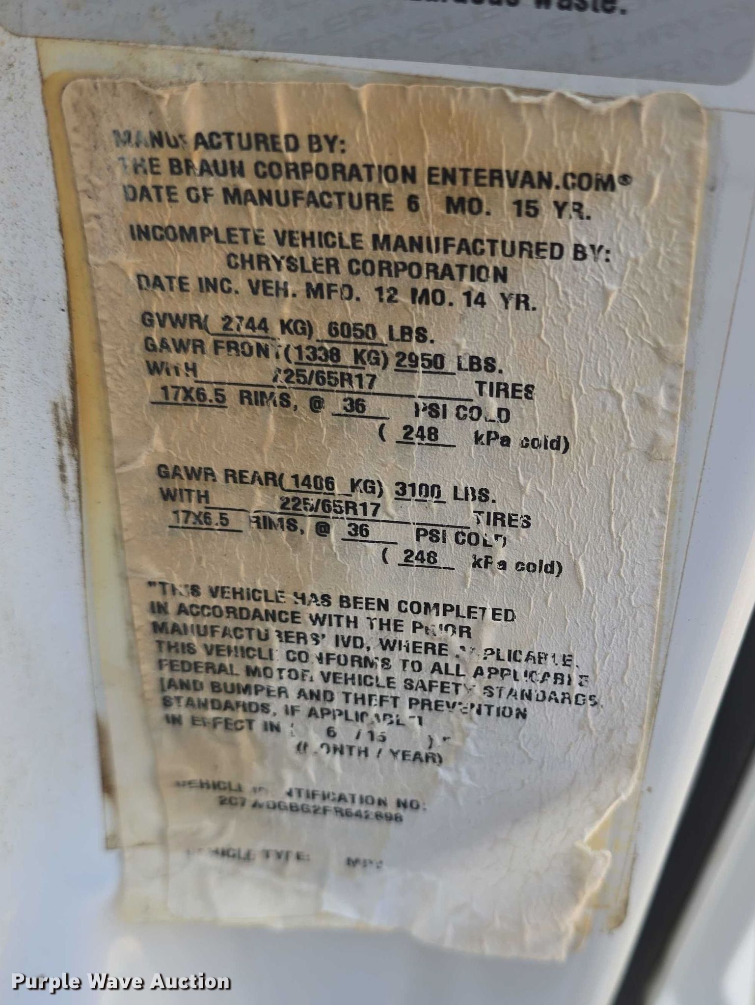 2015 Dodge Grand Caravan handicap accessible van. Miles: 233,809 on odometer, VIN: 2C7WDGBG2FR642898, Unit #: 2898. Engine Displacement: 3.6L V6 DOHC, Cylinders: 6, Fuel type: Gas. Transmission Automatic. Interior AC, Heat, Heated mirrors, Power windows, Power locks, Cruise control. Features Wheelchair lift Braun Ability. Tires Size: 225/75R17. Notes Dash warning indicator: TPMS, Dead battery, Brake issues, may need replaced , Possible engine issues Unit must be connected to jump box, May need rebuilt, Unit must be towed or hauled. Kansas title. Title distribution may be delayed up to 14 days from verification of funds. Council Grove, KS 66846