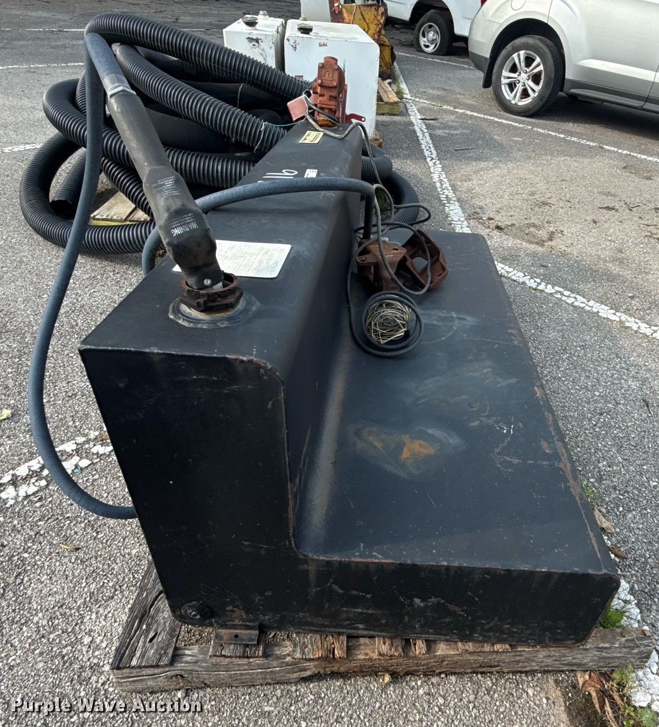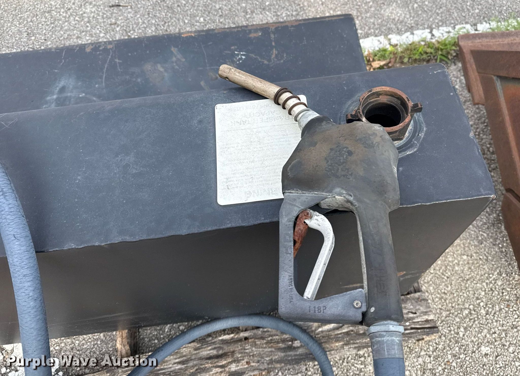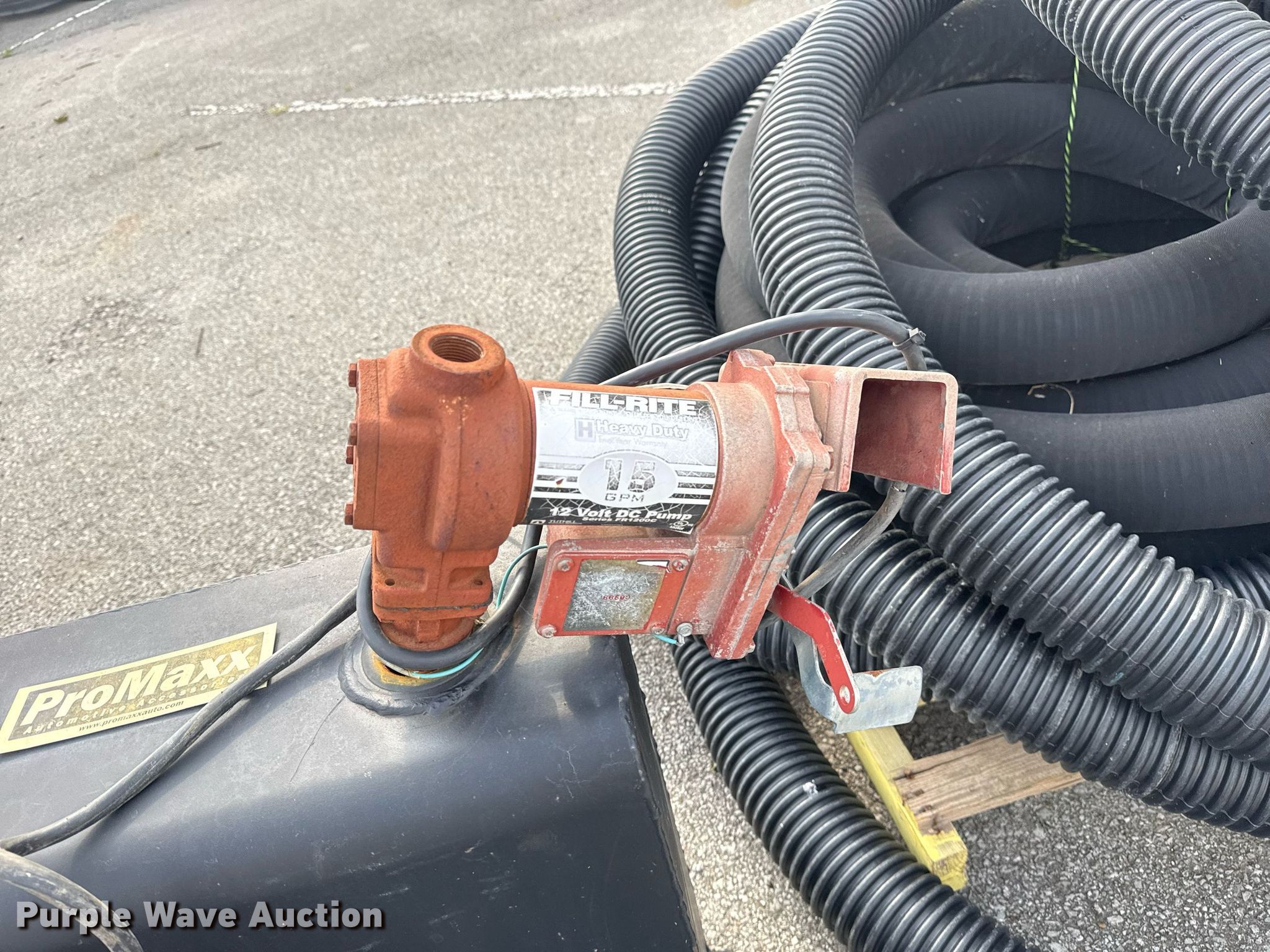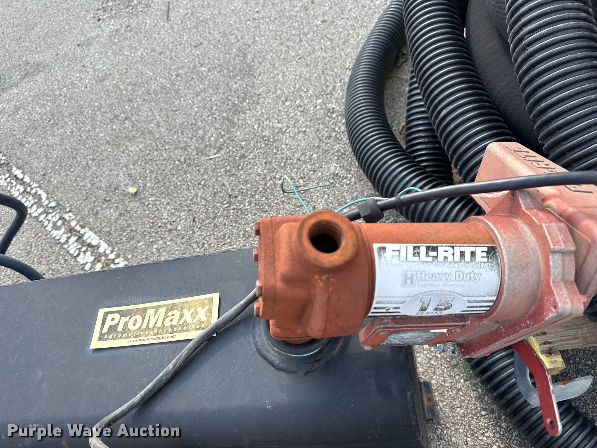 Purple Wave is selling a used Automotive Parts or Acces. in Oklahoma. This item is a ProMaxx auxiliary fuel tank with the following: 5' L x 30" W x 24" H, Fill-Rite pump, GPM: 15, Volts: 12, Nozzle, Unit #: 919
