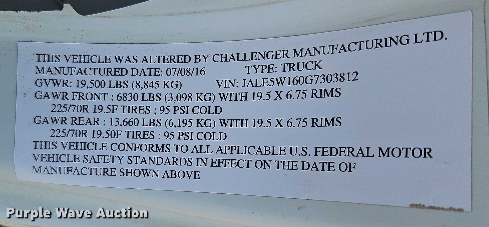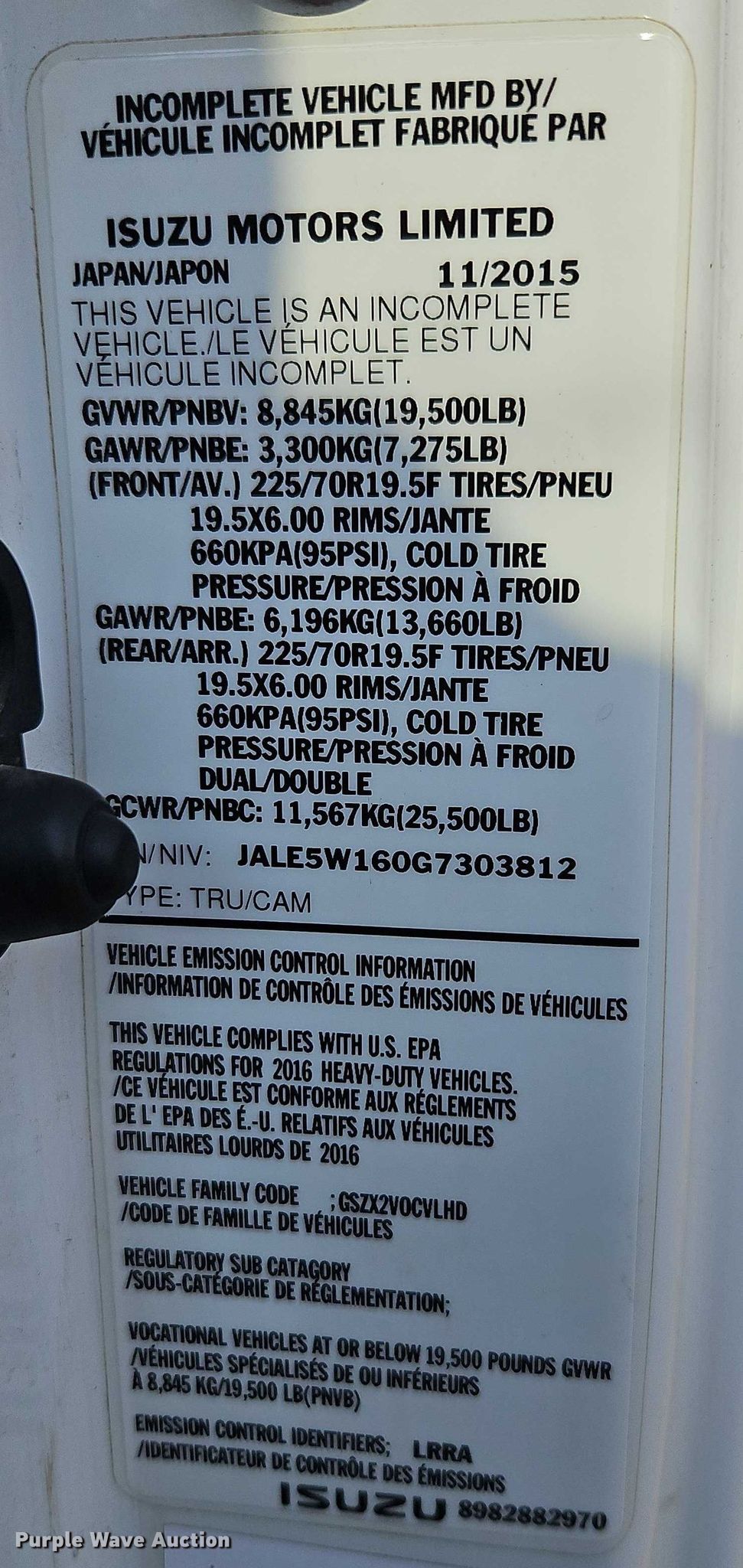 2016 Isuzu NRR street sweeper truck. Miles: 10,075 on odometer, Hours: 1,696 on meter, Hours: 1,511 on second odometer, VIN: JALE5W160G7303812, Unit #: 812. Engine Isuzu I1B - 4HK1TC, Displacement: 5.2L OHV, Cylinders: 4, Fuel type: Diesel, HP: 215. Transmission Automatic. Chassis Suspension: Air, Brakes: Hydraulic, GVWR: 19,500 lbs. Operators station AC, Heat. Features Broom Width: 60", Water spray system Capacity: 250 gallons, Sweeper bed Sweeper bed type: Conveyor Elgin Broom Badger, Serial: CH-365L, Left gutter broom Diameter: 30", Right gutter broom Diameter: 30", Engine Kubota V2403, Displacement: 2.4, Cylinders: 4. Tires Size: 225/70R19.5. Kansas title. Title distribution may be delayed up to 14 days from verification of funds. City of Edgerton, KS. Edgerton, KS 66021