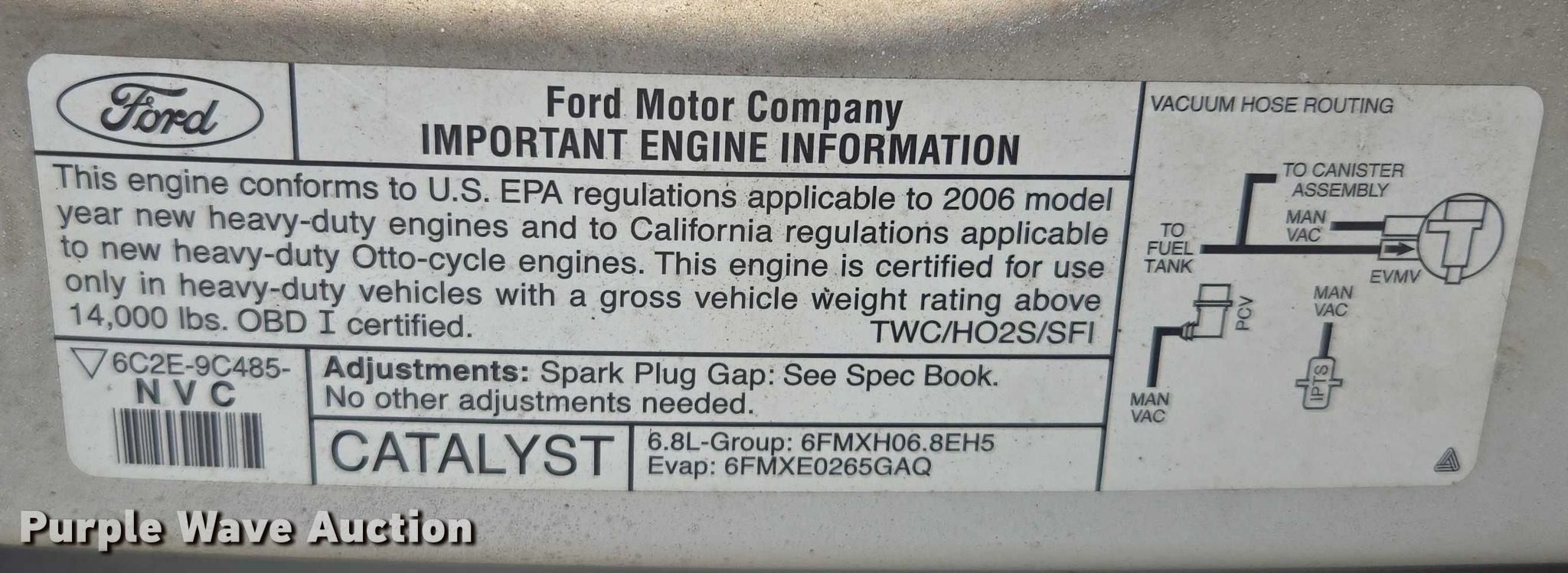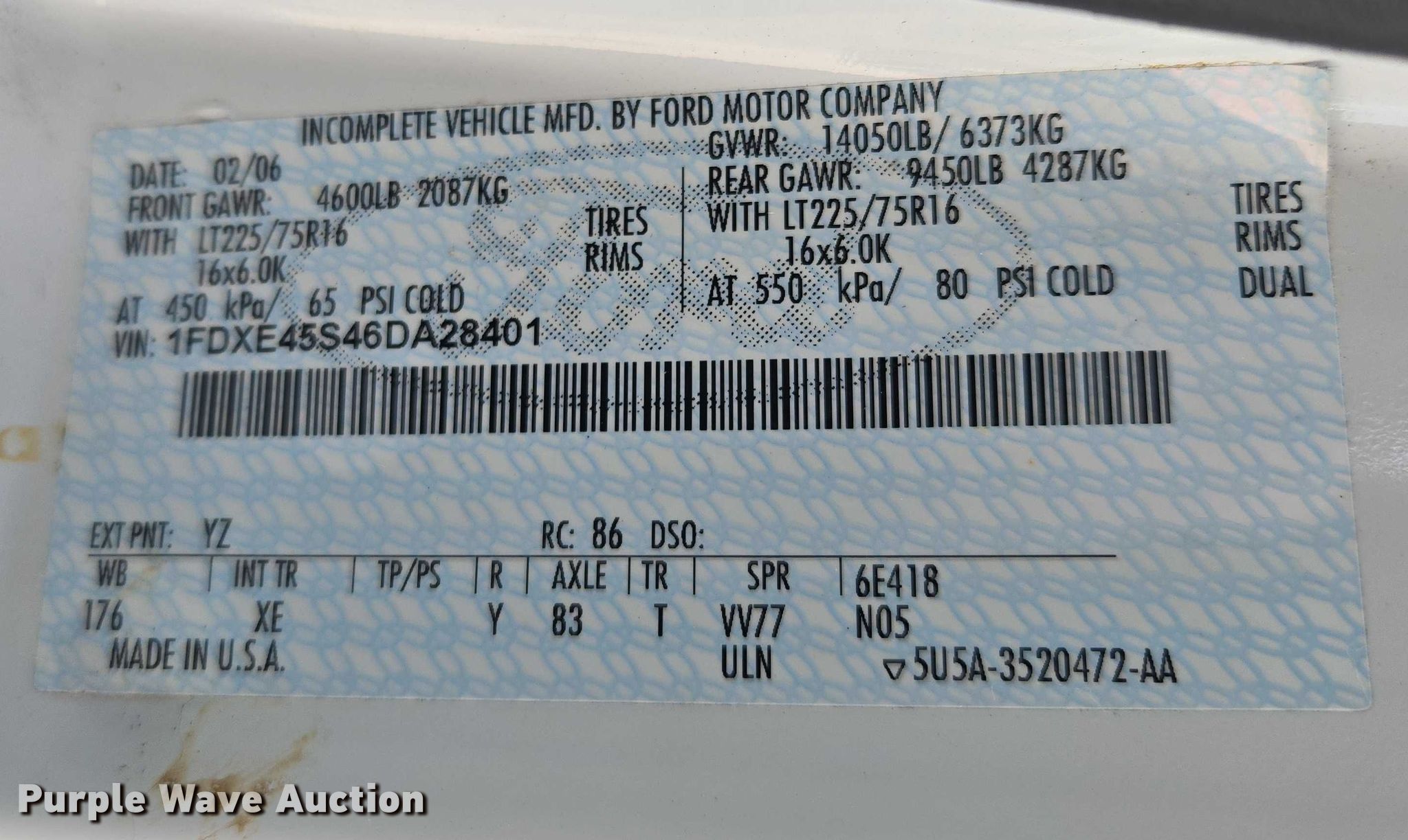 2006 Ford E450 Super Duty shuttle bus. Miles: Unknown, VIN: 1FDXE45S46DA28401, Unit #: 3999. Engine Displacement: 6.8L V10 SOHC, Cylinders: 10, Fuel type: Gas. Transmission Automatic. Chassis Axles: Single, Suspension: Spring, Brakes: Hydraulic, GVWR: 14,050 lbs. Interior AC, Heat, Cruise control, Auxiliary controls, Electric passenger sliding door, Passengers: 24. Tires Size: 225/7/R16. Notes Missing battery, Unknown operating condition. Missouri title. Mileage has not been verified. Odometer discrepancy will be marked on the title. Title distribution may be delayed up to 14 days from verification of funds. Jackson County Parks and Rec. Lee's Summit, MO 64081