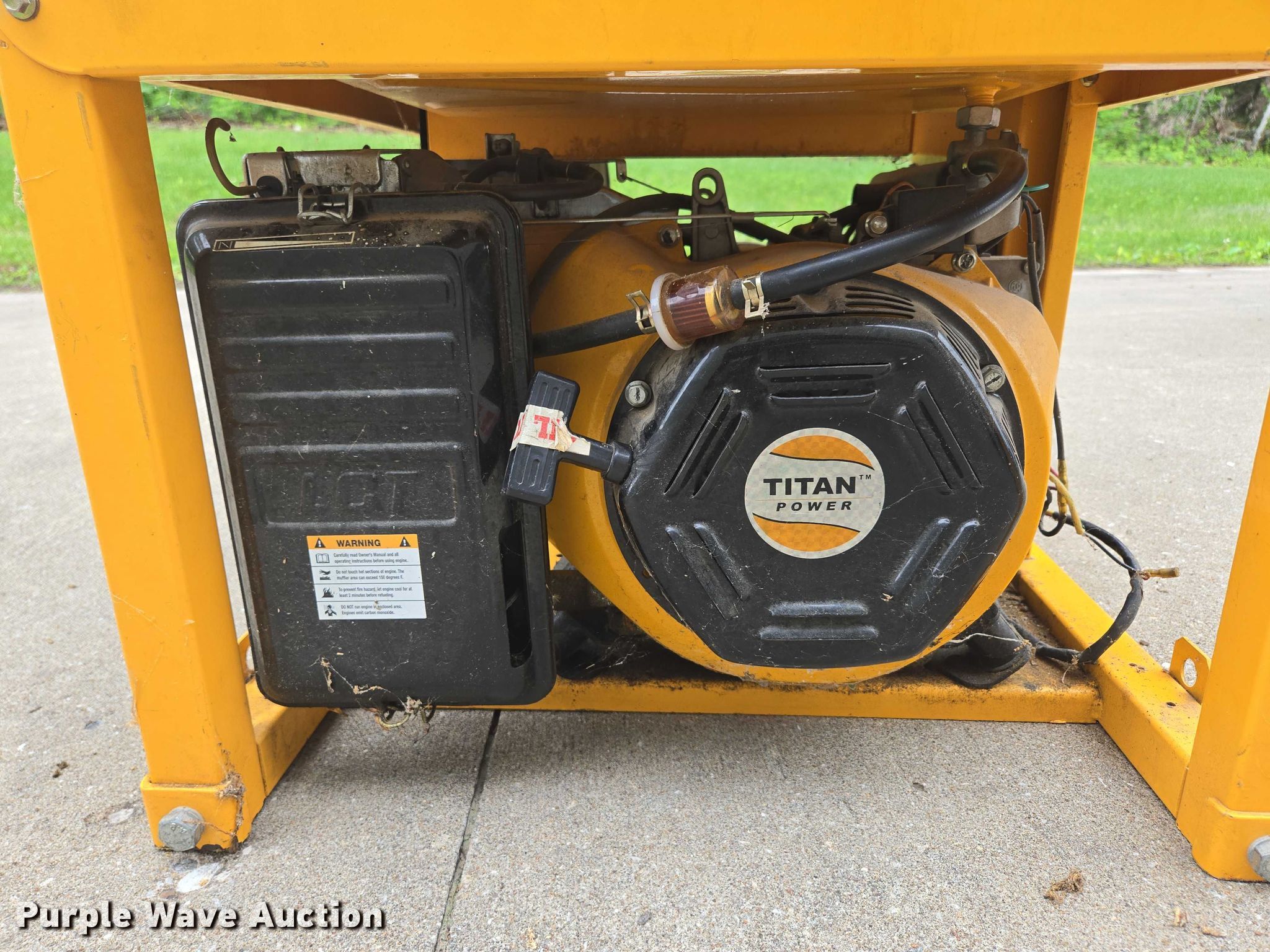 Titan Industrial 9000ES generator. Serial: TRC04181. Engine Titan Power, Displacement: 390 cc, Cylinders: 1, Fuel type: Gas, HP: 11. Features Generator kVA: 7, Phase: Single, Electric start, Fuel tank. Notes Dead battery, Non-operational engine, carburetor issues , Non-operational unit. Central Taney Fire Protection. Taneyville, MO 65759