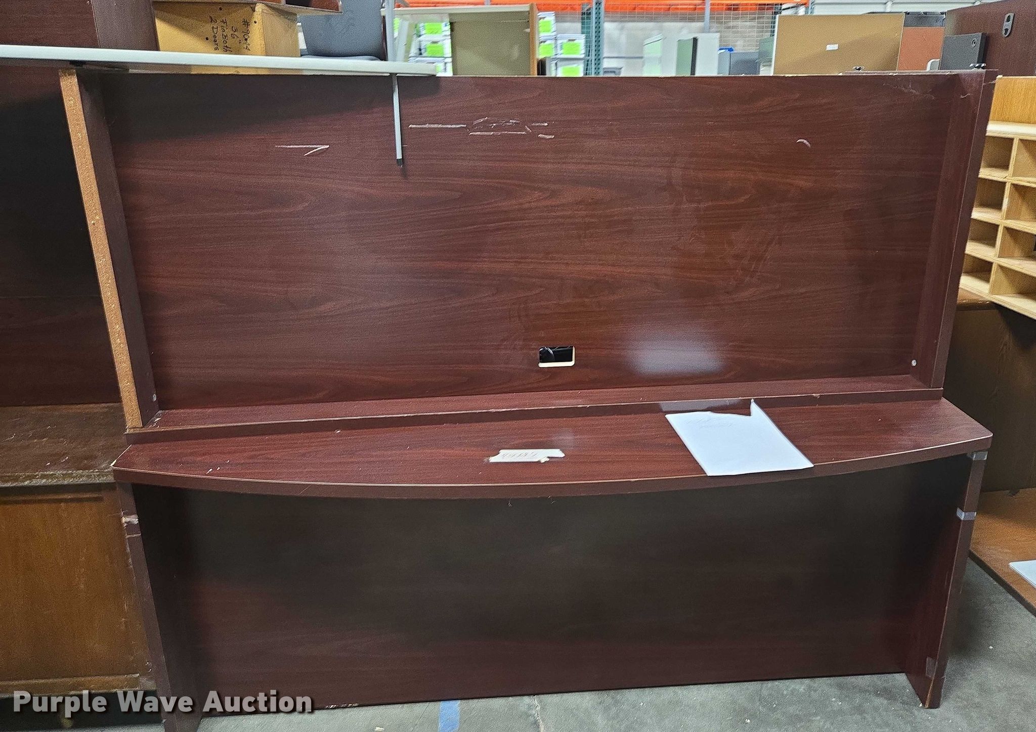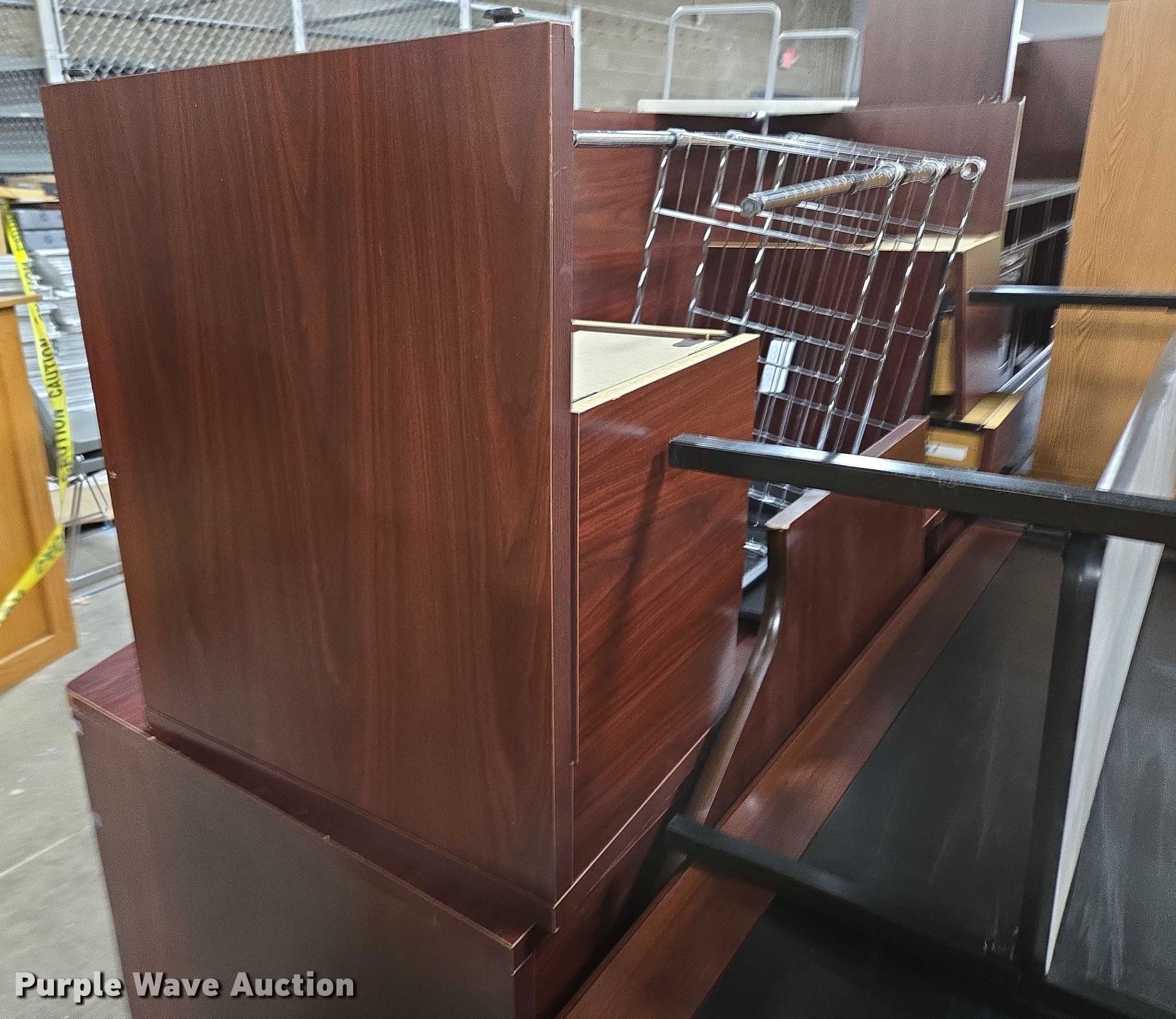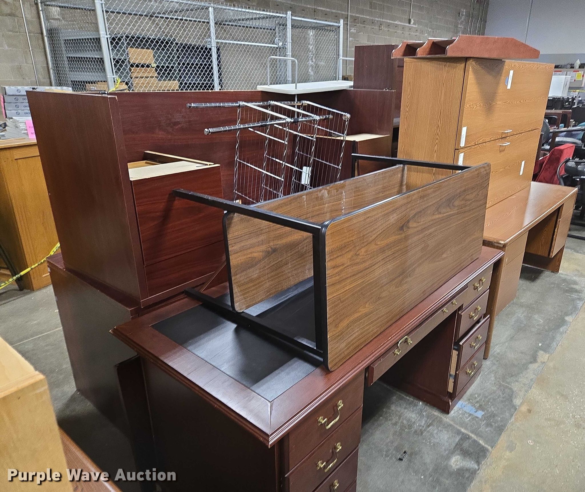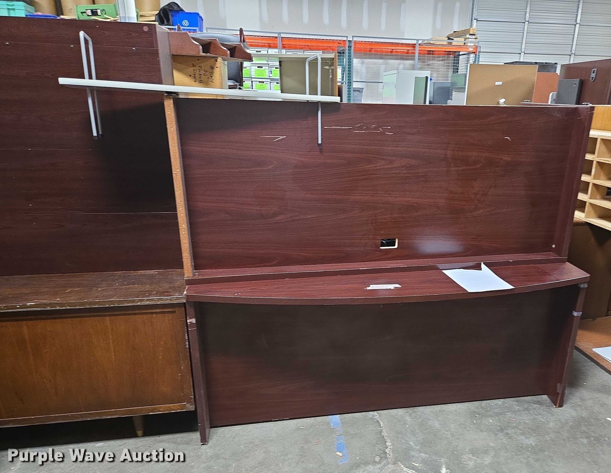 Purple Wave is selling a used Furniture in Arkansas. This item is a Furniture with the following: (5) desks, (3) Cabinets, (3) Shelves, Filing pocket