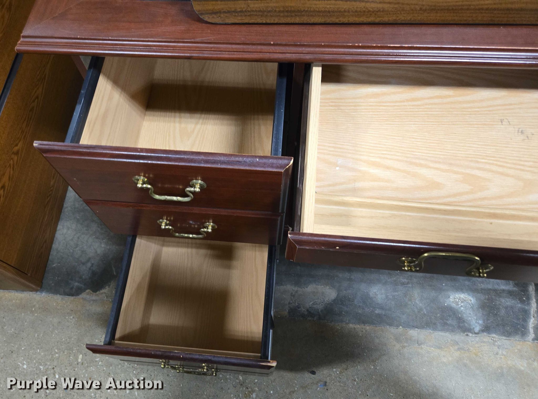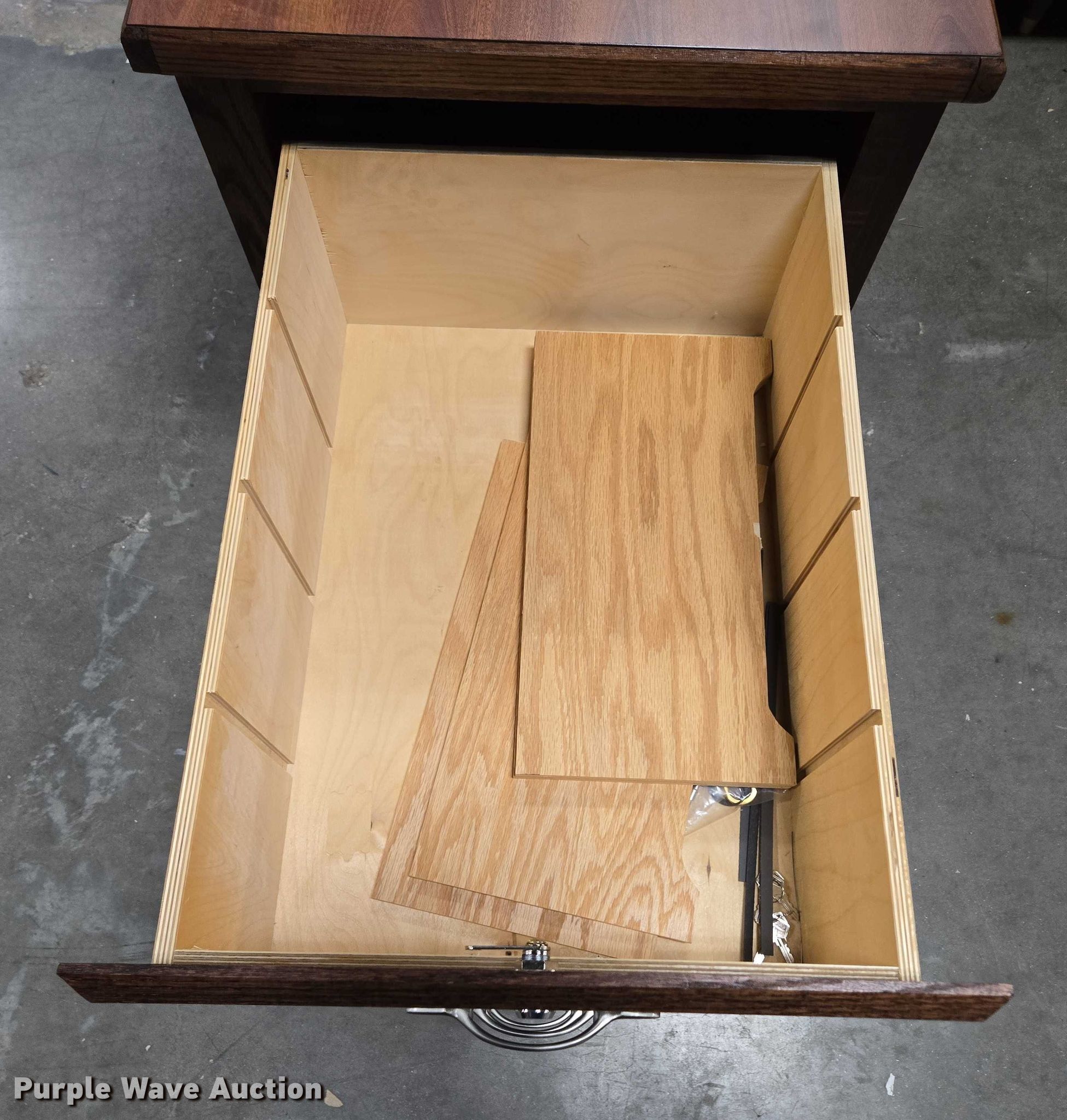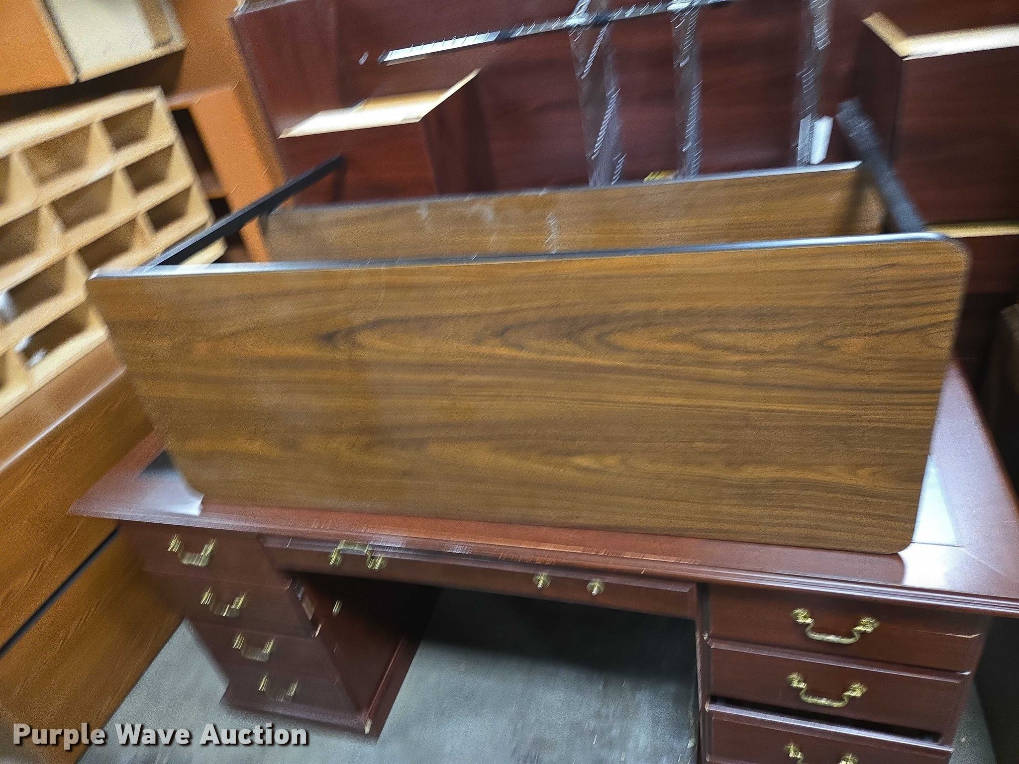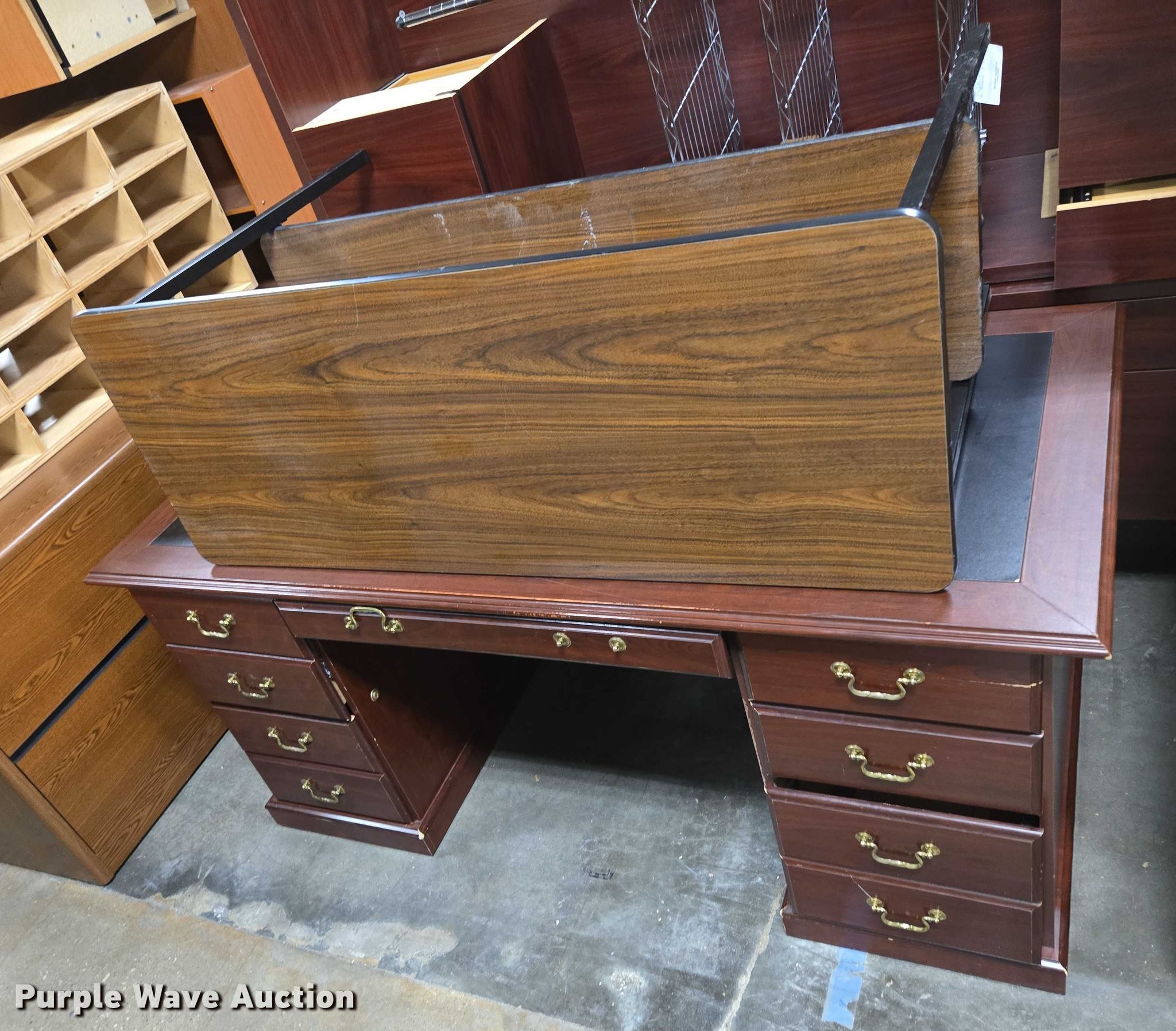 Purple Wave is selling a used Furniture in Arkansas. This item is a Furniture with the following: (5) desks, (3) Cabinets, (3) Shelves, Filing pocket