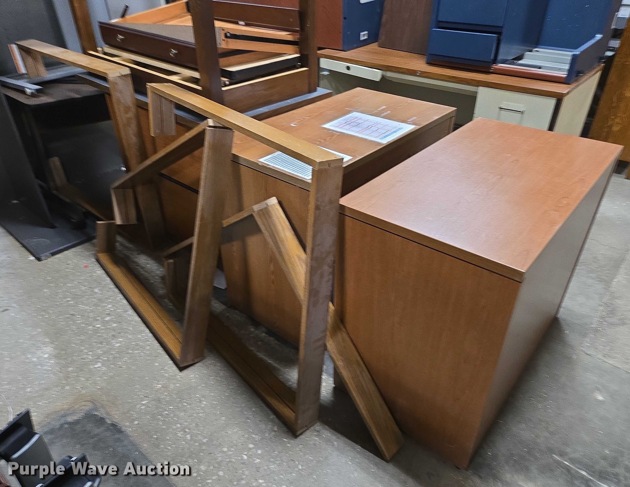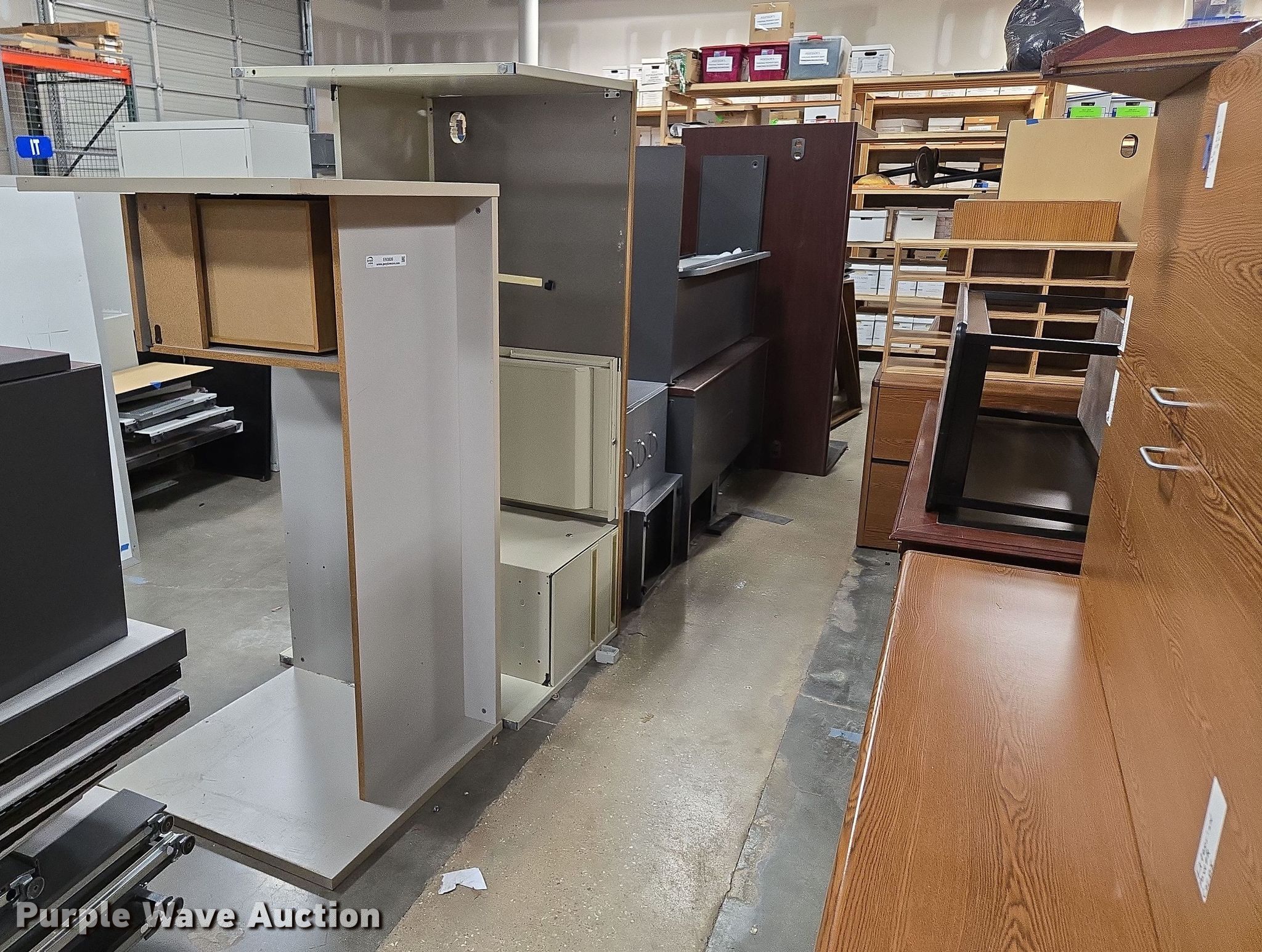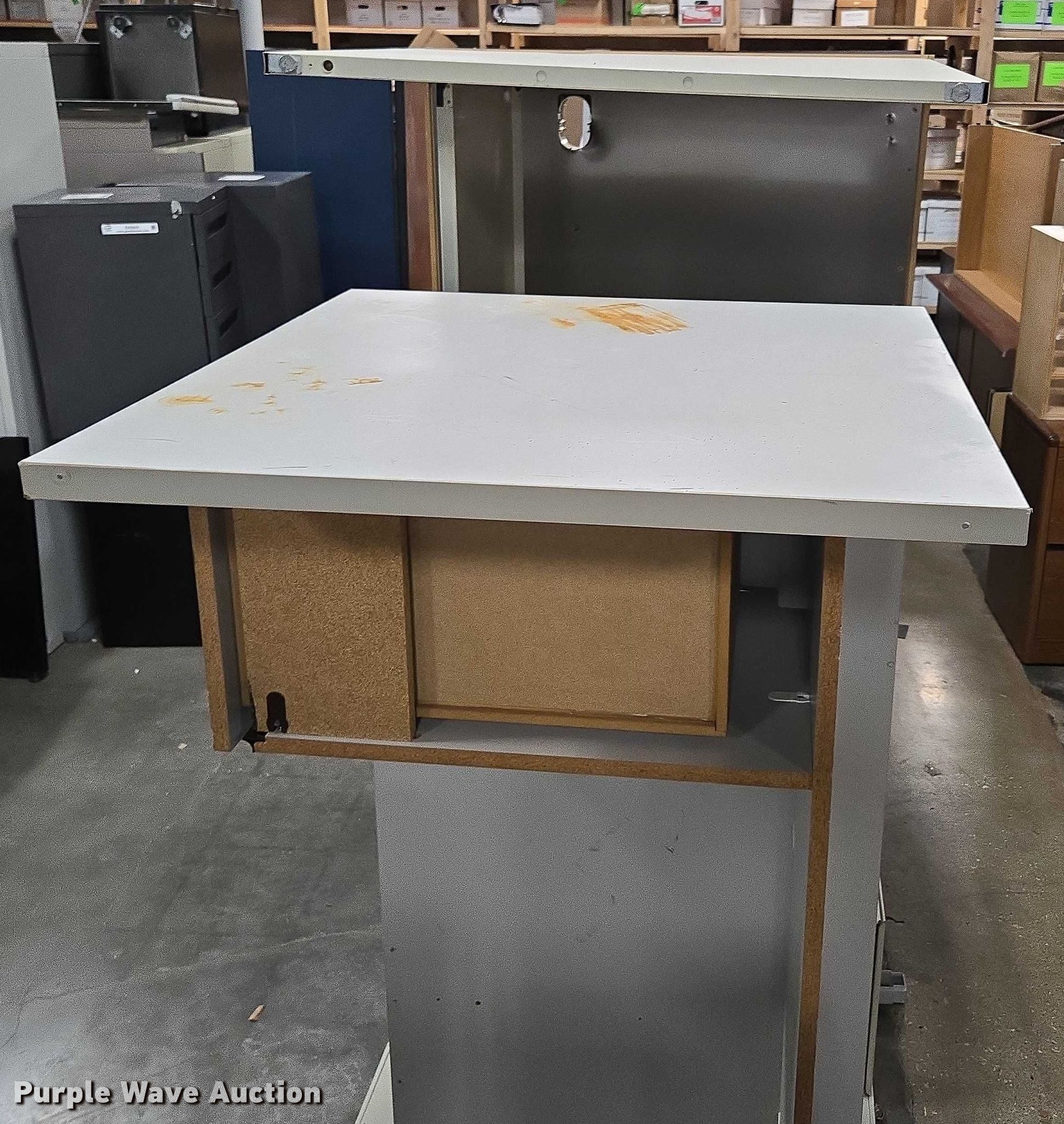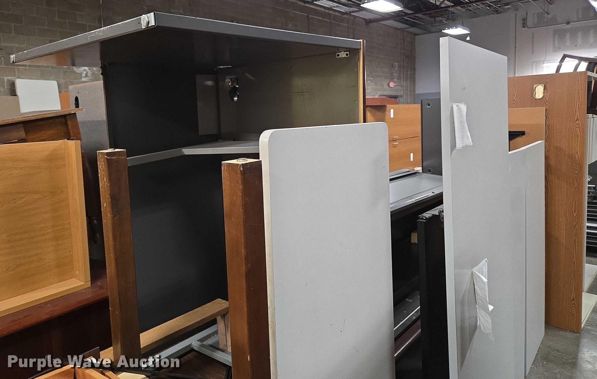 Purple Wave is selling a used Furniture in Arkansas. This item is a Furniture with the following: Approximately 10 desks, Approximately 3 storage desks, Additional items