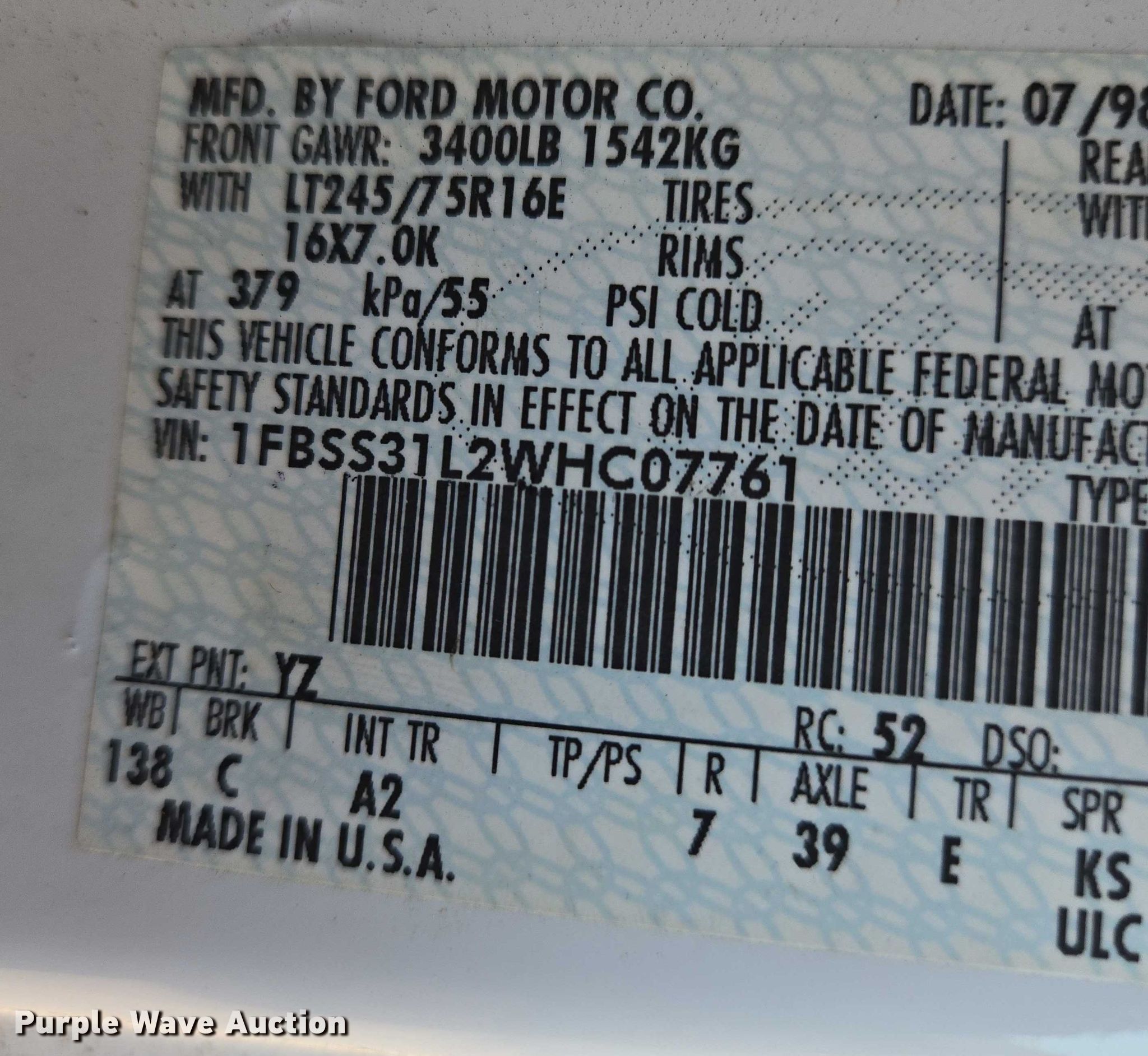 Purple Wave is selling a used Passenger Vehicle in Oklahoma. This item is a 1998 Ford Club Wagon XL van with the following: Miles: 88,252 on odometer, VIN: 1FBSS31L2WHC07761