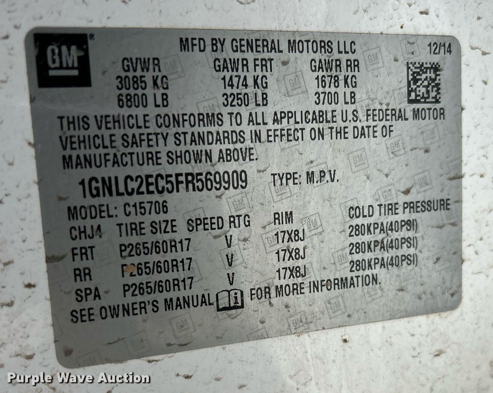 Purple Wave is selling a used Passenger Vehicle in Texas. This item is a 2015 Chevrolet Tahoe Police SUV with the following: Miles: 192,872 on odometer, VIN: 1GNLC2EC5FR569909