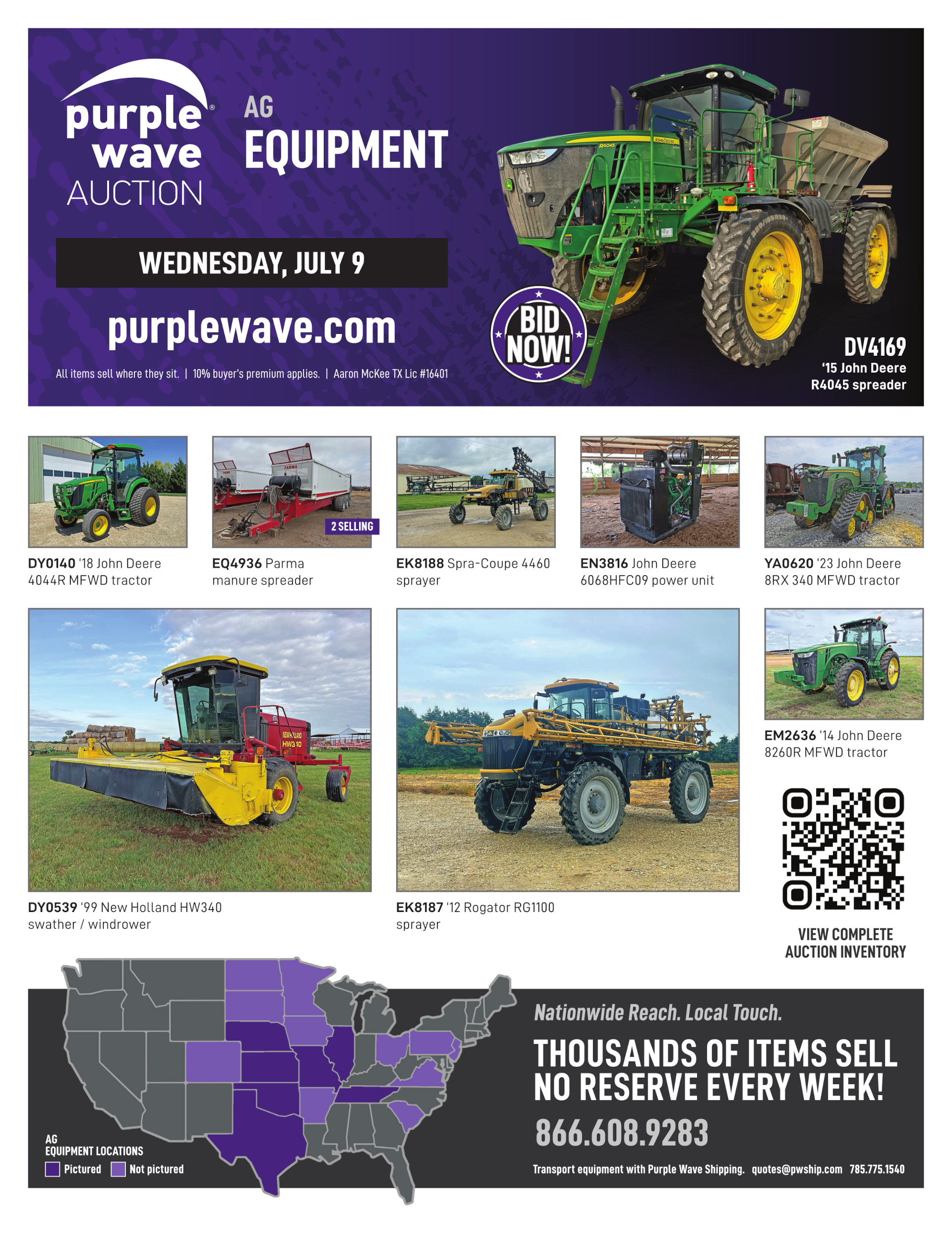 Purple Wave Shipping, LLC provides shipping and transportation services to winning bidders on ag, construction and fleet type assets. Purple Wave Shipping, LLC does not provide shipping on items weighing less than 1,000 pounds.