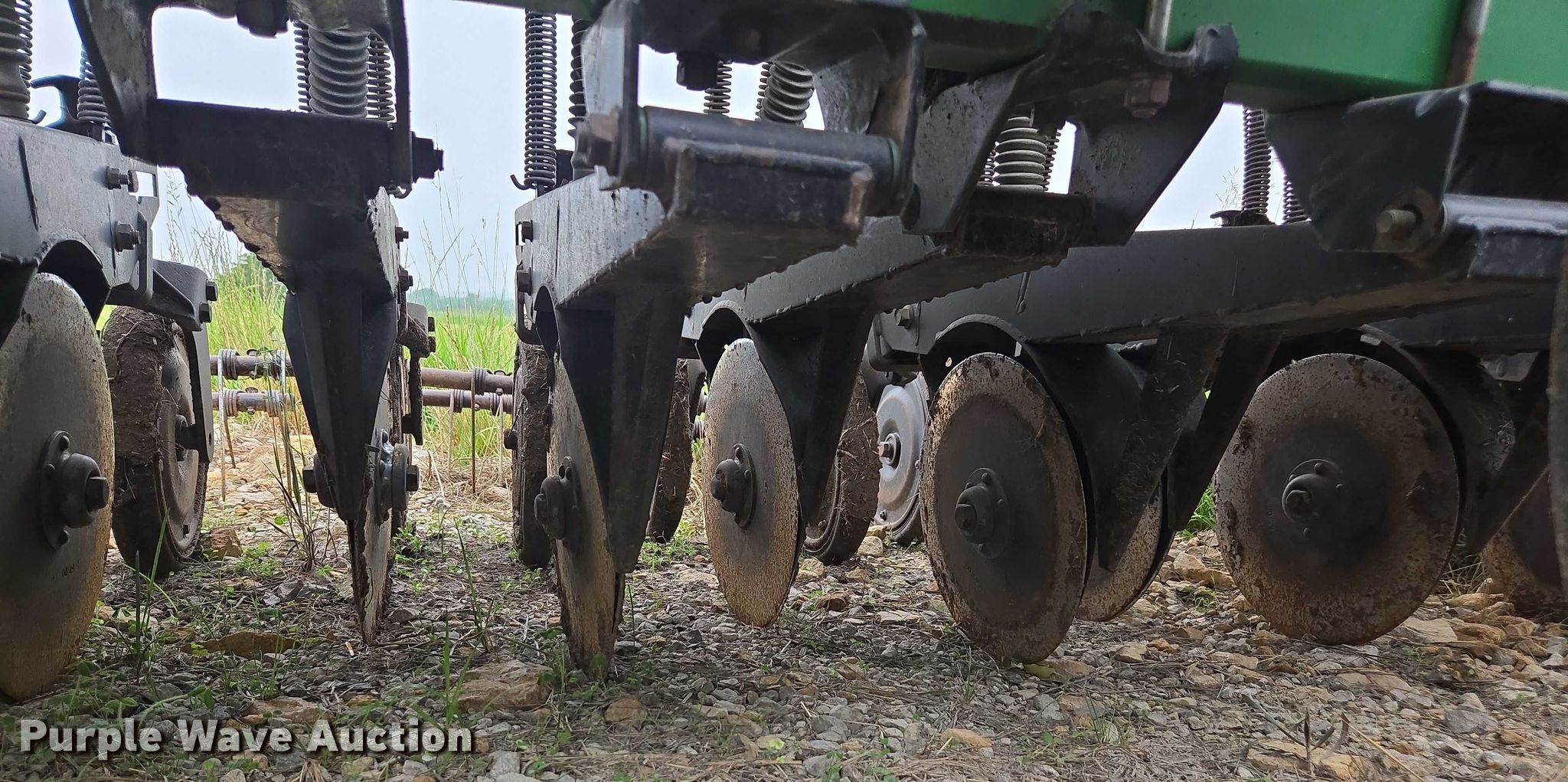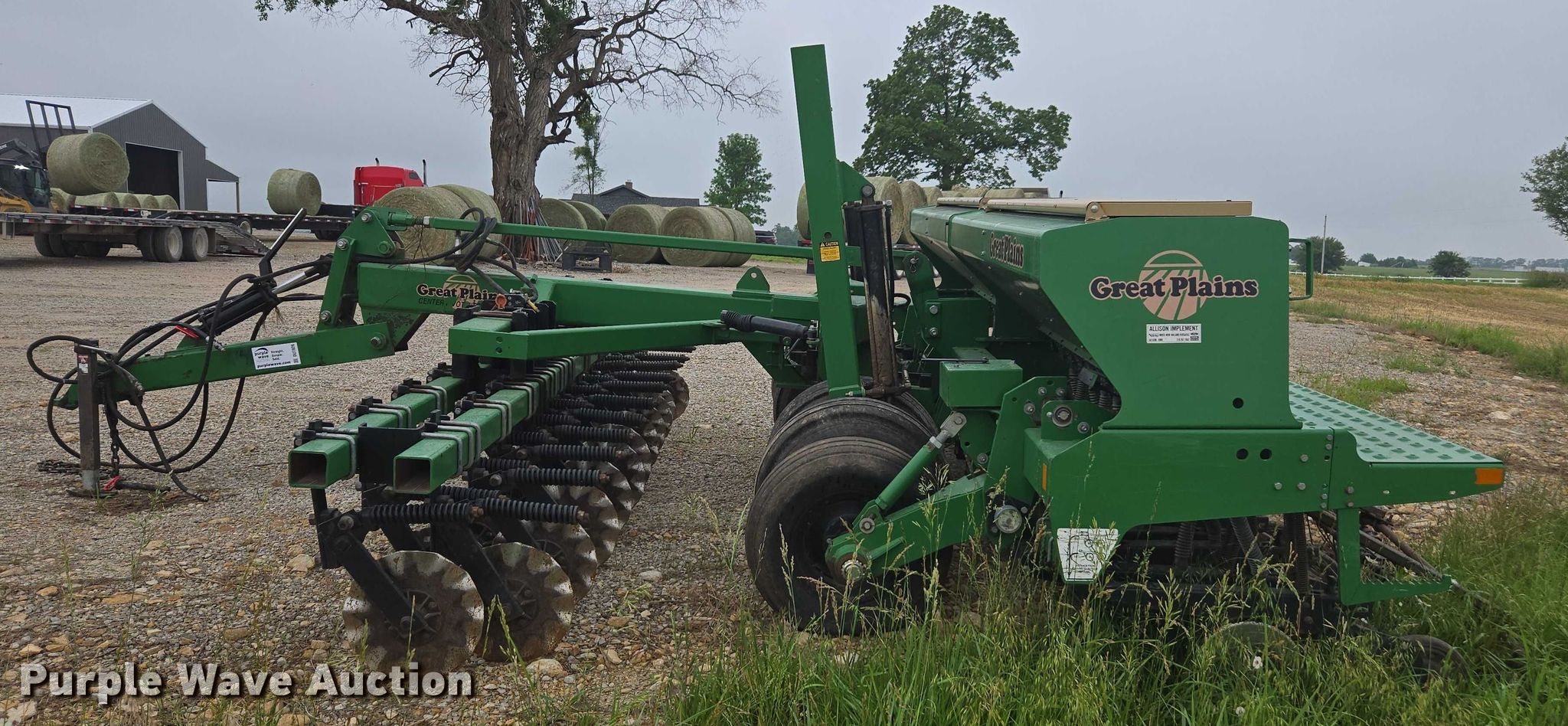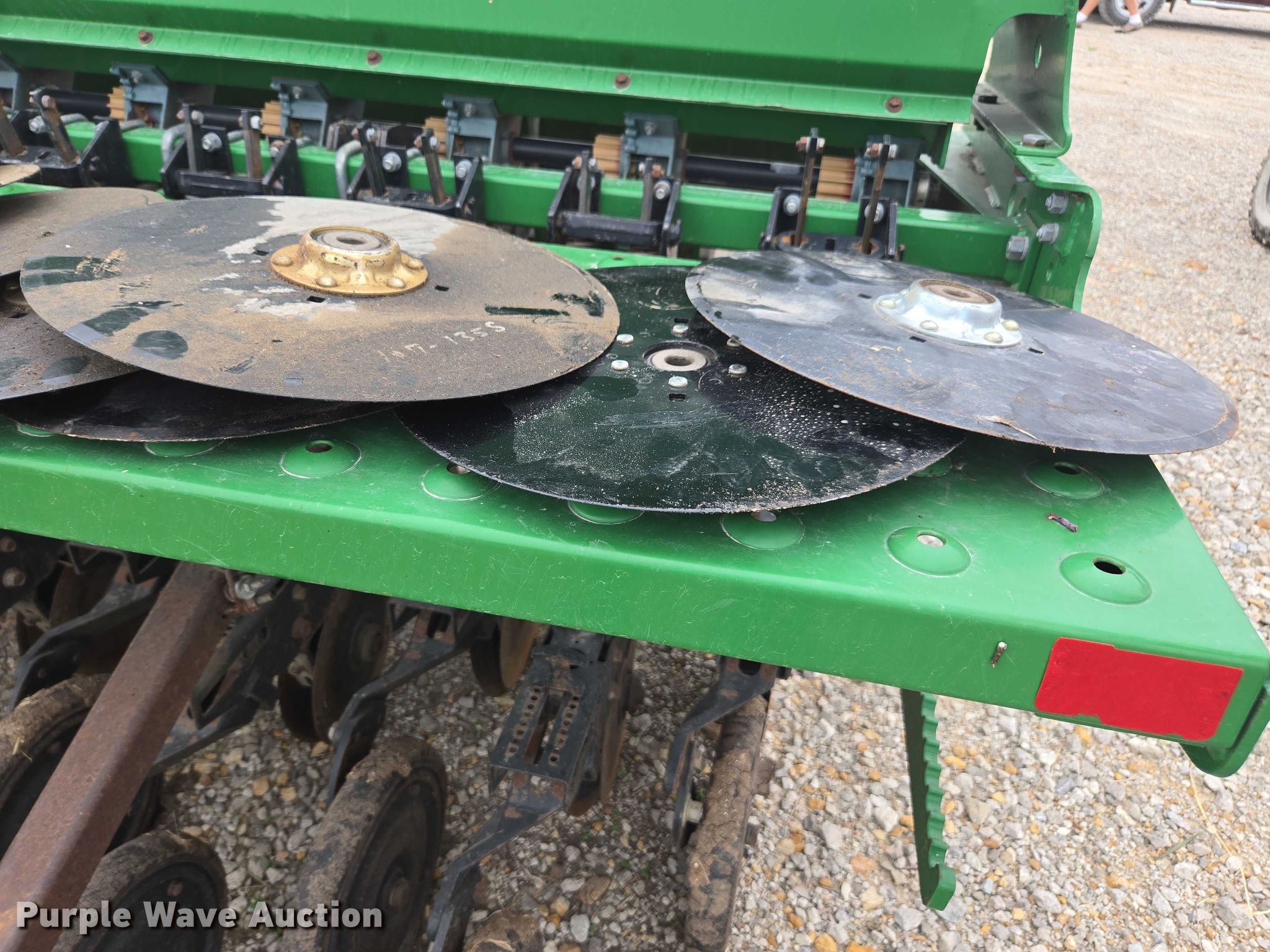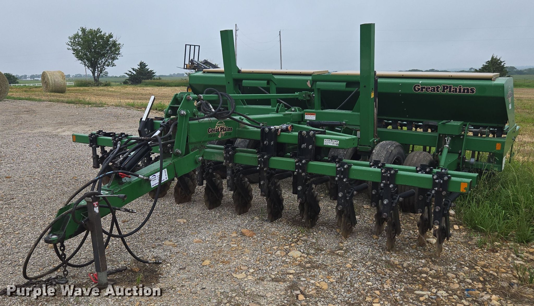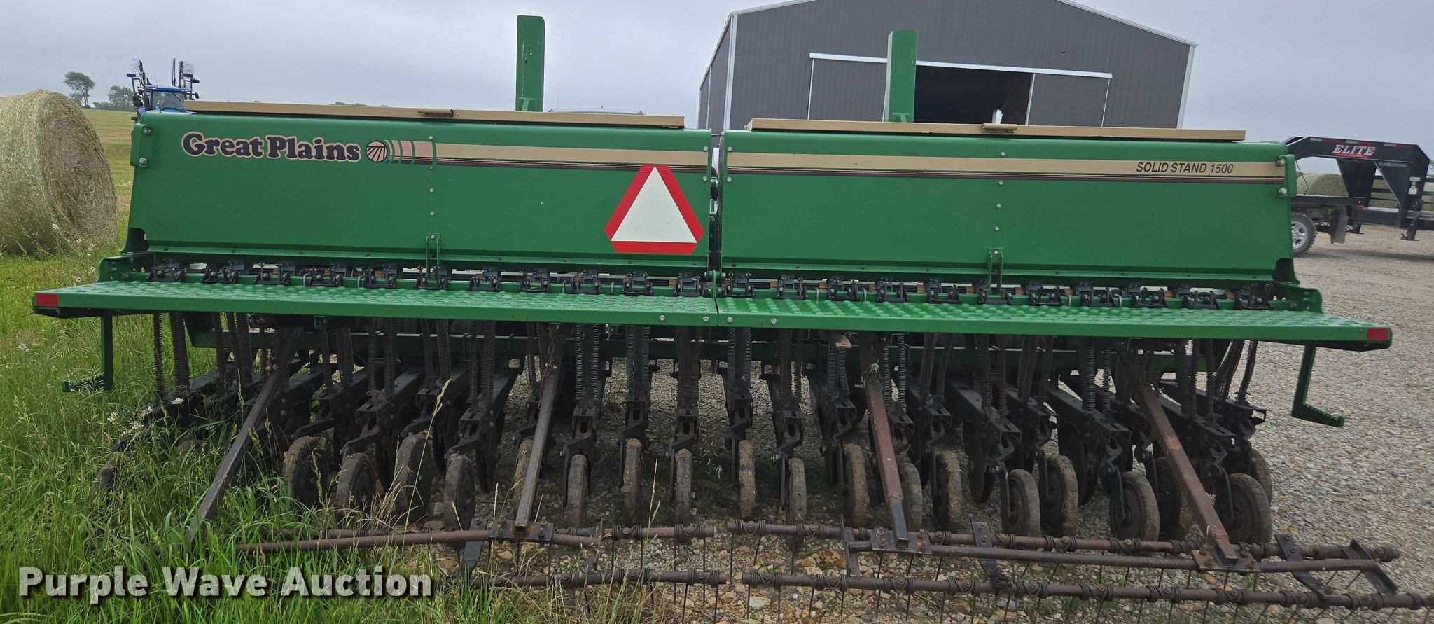 Great Plains CPH-1595 34 grain drill. Width: 14', Row spacing: 7.5", Serial: GP-6975Z. Features Seed delivery Bulk fill system, Row units Meter drive: Ground, Down pressure: Spring, No-till coulters, Disk openers: Double, Closing system: Single Type: Rubber.. Tires Transport tire size: 9.5-15 Quantity: 4, Drive/ outside tire size: 9.5-15 Quantity: 2. Notes Additional disc openers included. BK Farms. Baldwin City, KS 66006