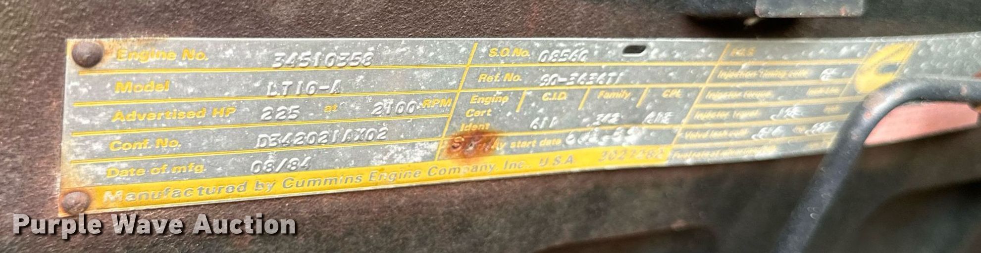 1984 Steiger Bearcat KM-225 4WD tractor. Hours: 8,850 on meter, Serial: 112-04214. Engine Cummins LT10-A, Displacement: 611 C.I.D., Cylinders: 6, Fuel type: Diesel, HP: 225. Transmission Manual, 20F - 4R. Operators station AC, Heat. Features Seven pin outlet, Hydraulic remote sets Rear: 4. Tires Size: 18.4R38, Duals. Kendall Tree Service. Cavalier, ND 58220