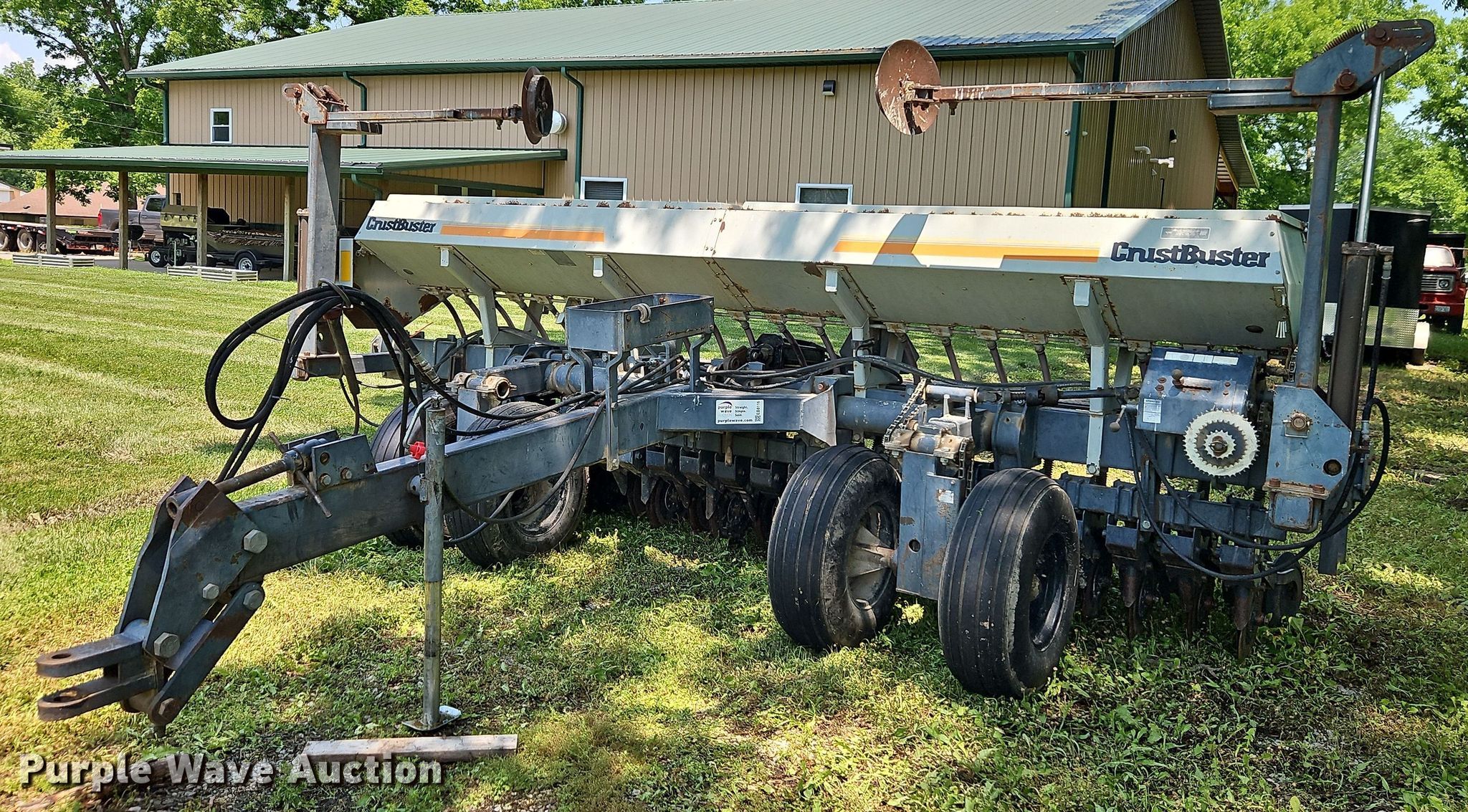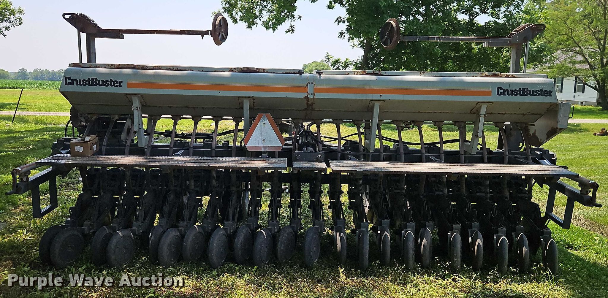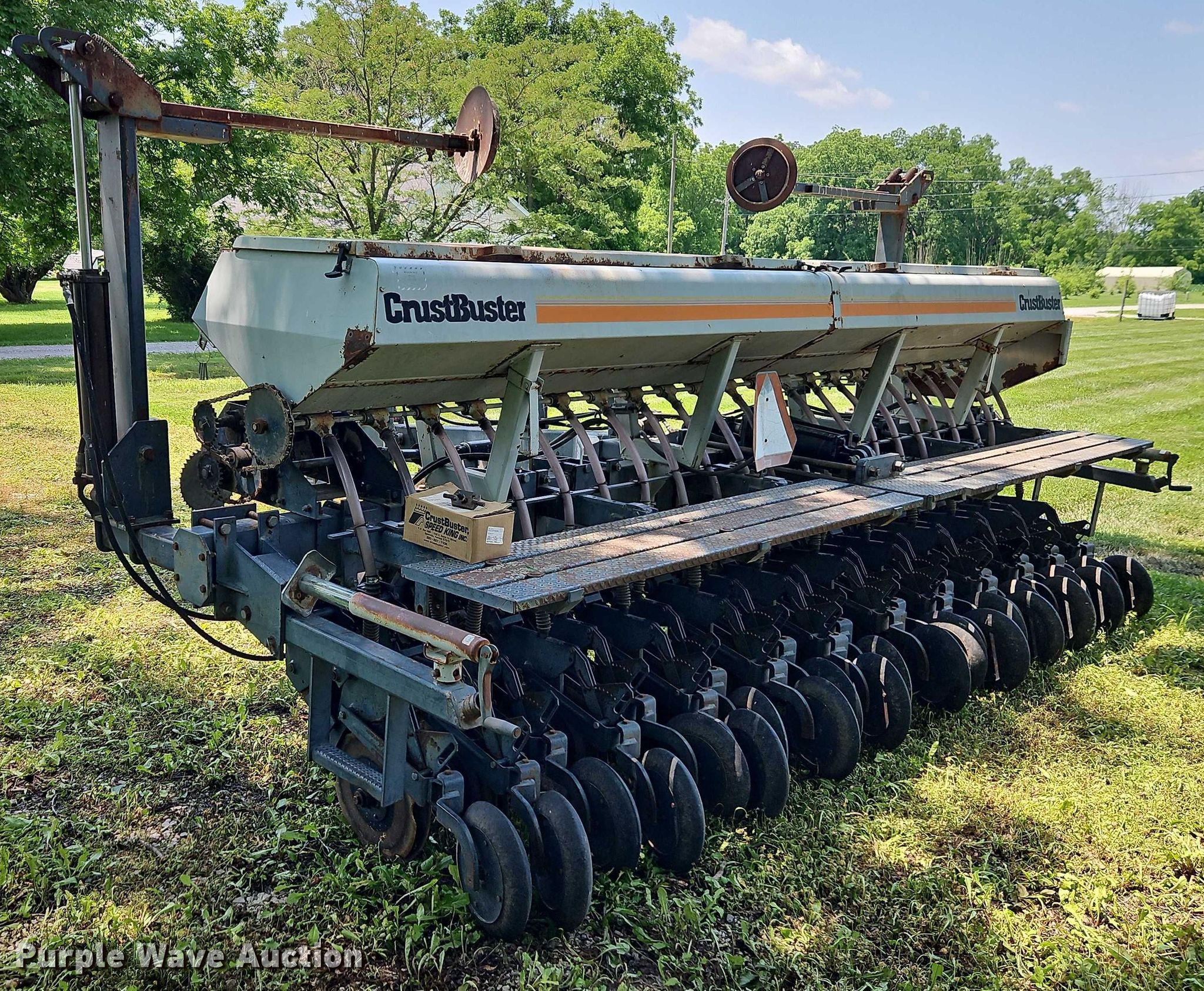 Crust Buster 3400AP 10C grain drill. Width: 15', Row units: 22, Row spacing: 8", Serial: 11598. Features Frame Hitch: Pin, Marker arm, Seed delivery Bulk fill system, Row units Meter drive: Ground, Down pressure: Spring, Disk openers: Double, Closing system: Single Type: Rubber.. Tires Transport tire size: 12.5L-15 Quantity: 4. Rockville, MO 64780