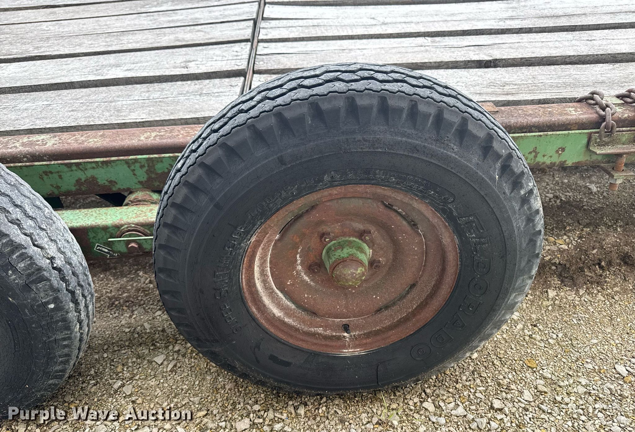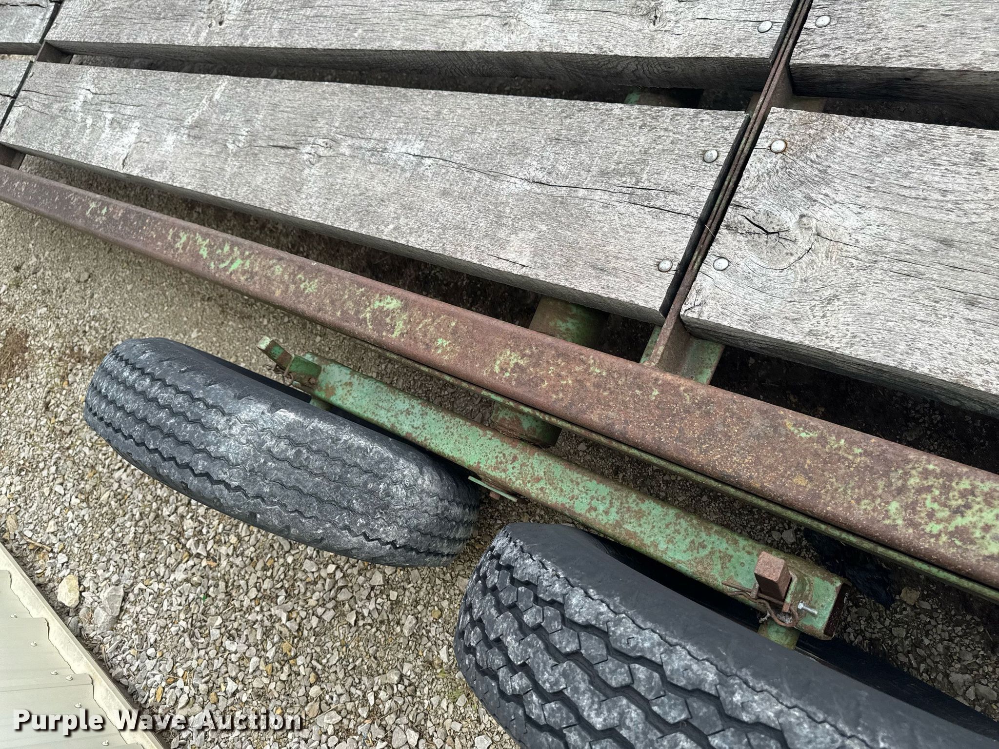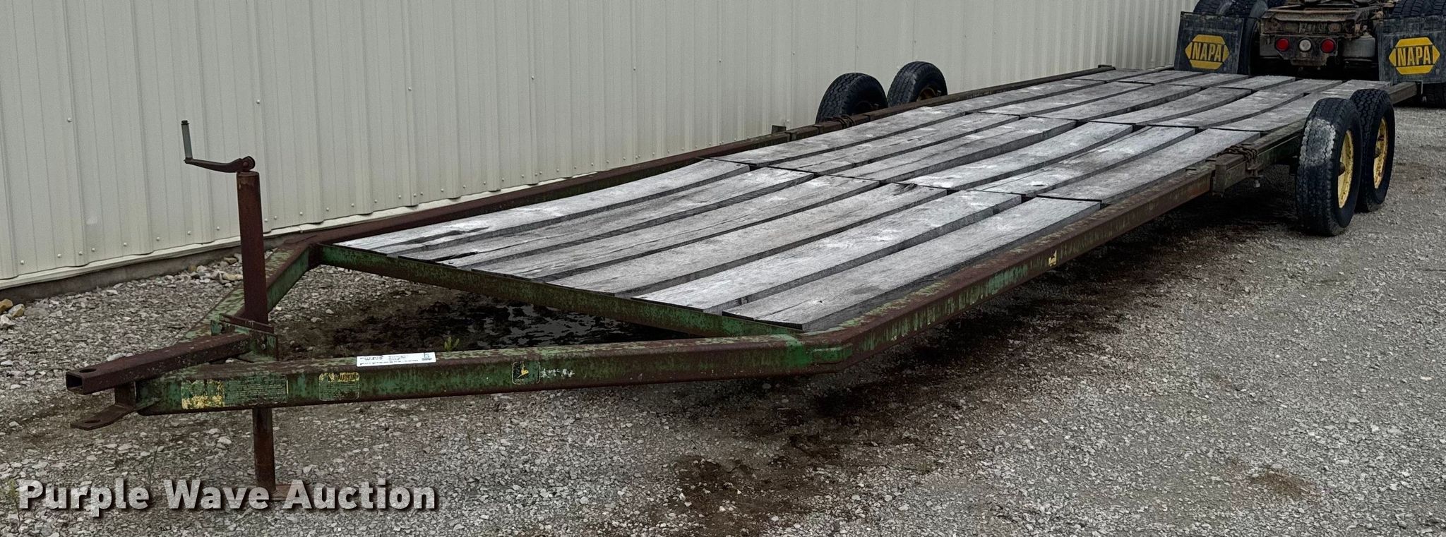 John Deere implement trailer. Dimensions. Overall: 34'L x 120" W, Deck: 28' L x 95" W. Features Deck type: Wood. Chassis Landing gear: Single, Suspension: Walking beam, Axles: Tandem. Tires Steel wheels, Size: 7.00-15LT. Transfer of ownership documentation will be a bill of sale. Allendan Seed Co.. Winterset, IA 50273