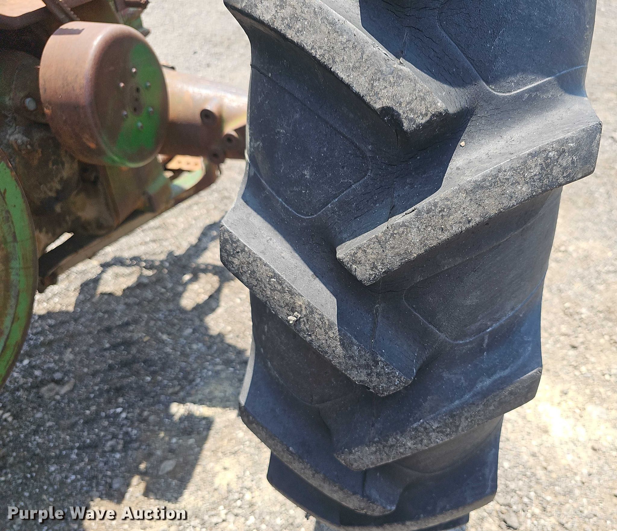 1937 John Deere A tractor. Serial: 449326. Engine John Deere, Cylinders: 2, Fuel type: Gas. Transmission Manual, 4F - 1R. Features PTO: 540, Power beyond (hydraulics). Tires Front: 6.00-16, Rear: 12.4-38. Leonardville, KS 66449