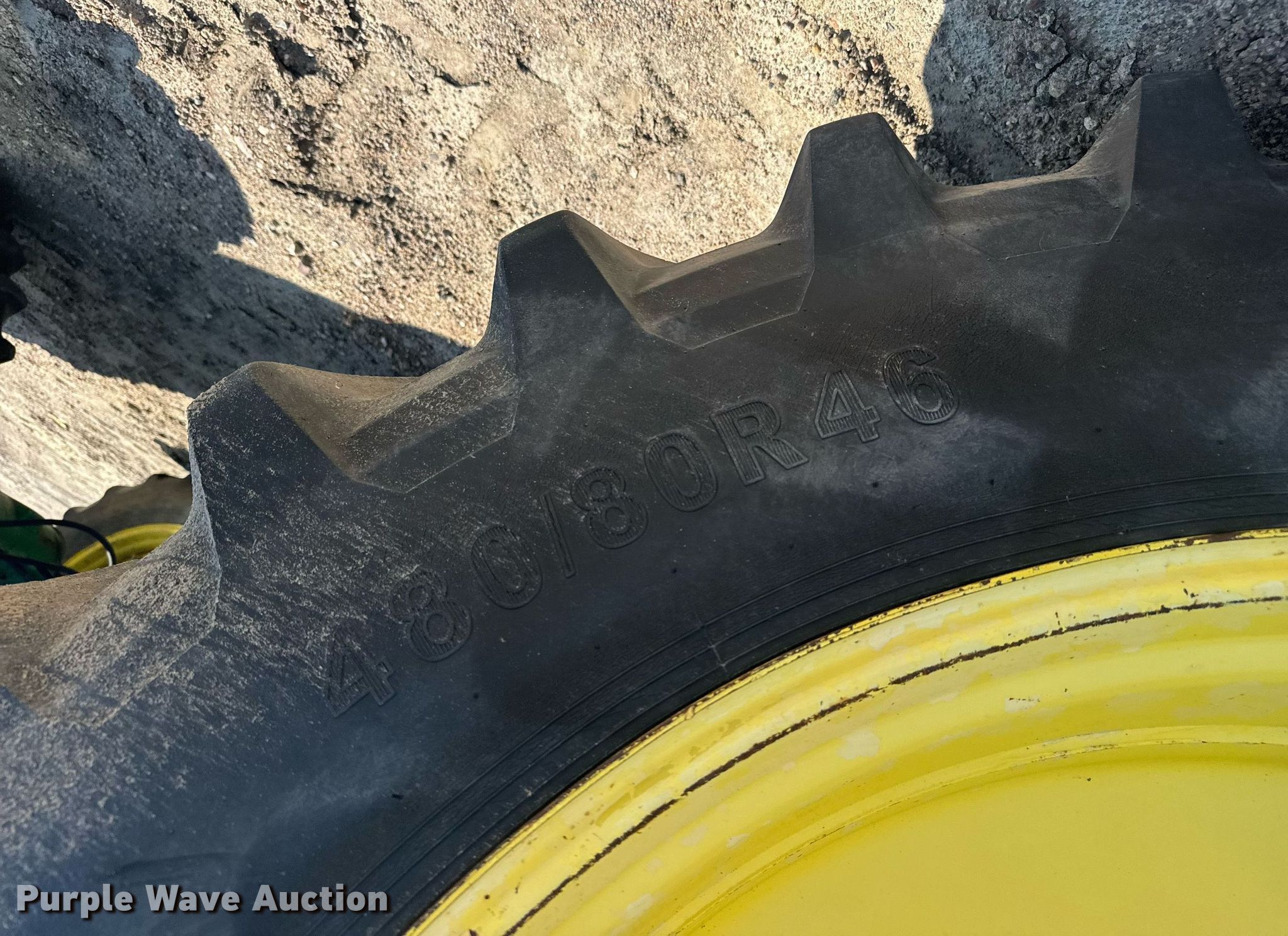 1997 John Deere 8300 MFWD tractor. Hours: 413 on meter, Serial: RW8300P010248. Engine John Deere, Displacement: 8.1L, Cylinders: 6, Fuel type: Diesel. Transmission Powershift, 16F - 4R, Differential lock. Operators station AC, Heat. Features PTO: 540, Three point Top link, Quick attach, Seven pin outlet, Rear: 3, Power beyond (hydraulics), Suitcase weights: 10. Tires Front: 380/85R34, Rear: 480/80R46, Duals. Notes Tire damage, dry rot. BSB Construction Inc.. Curtis, NE 69025