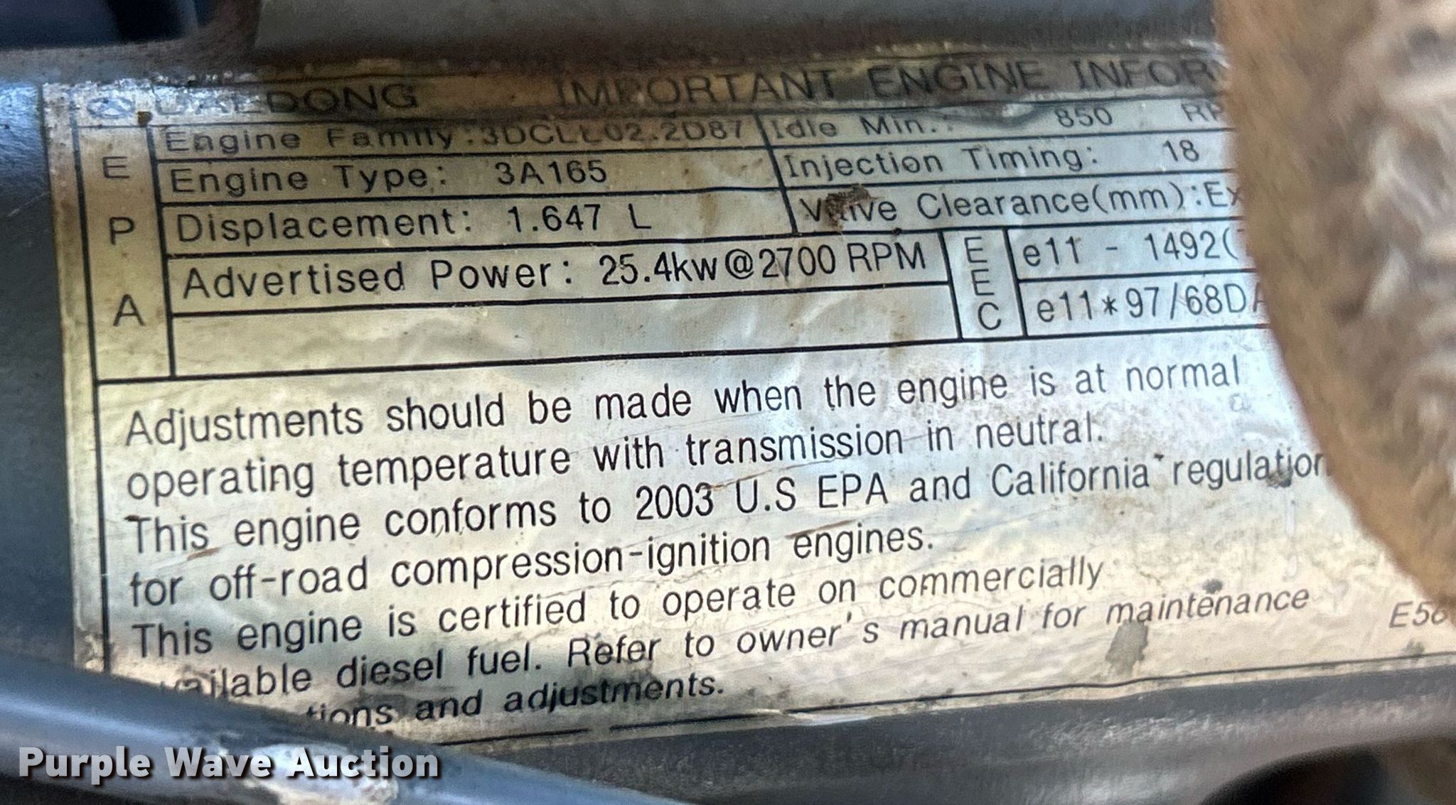 Kioti DK35 MFWD tractor. Hours: 582 on meter Actual hours unknown, Serial: 361400263. Engine Daedong, Displacement: 1.647L, Cylinders: 3, Fuel type: Diesel. Transmission Synchro, 8F - 8R, Left-hand reverser, Differential lock. Features PTO: 540, Three point, Hydraulic remote sets Rear: 1. Tires Front: 27x10.50-15, Rear: 43x16.00-20. True Stainless Enterprises. Norwood, MO 65717