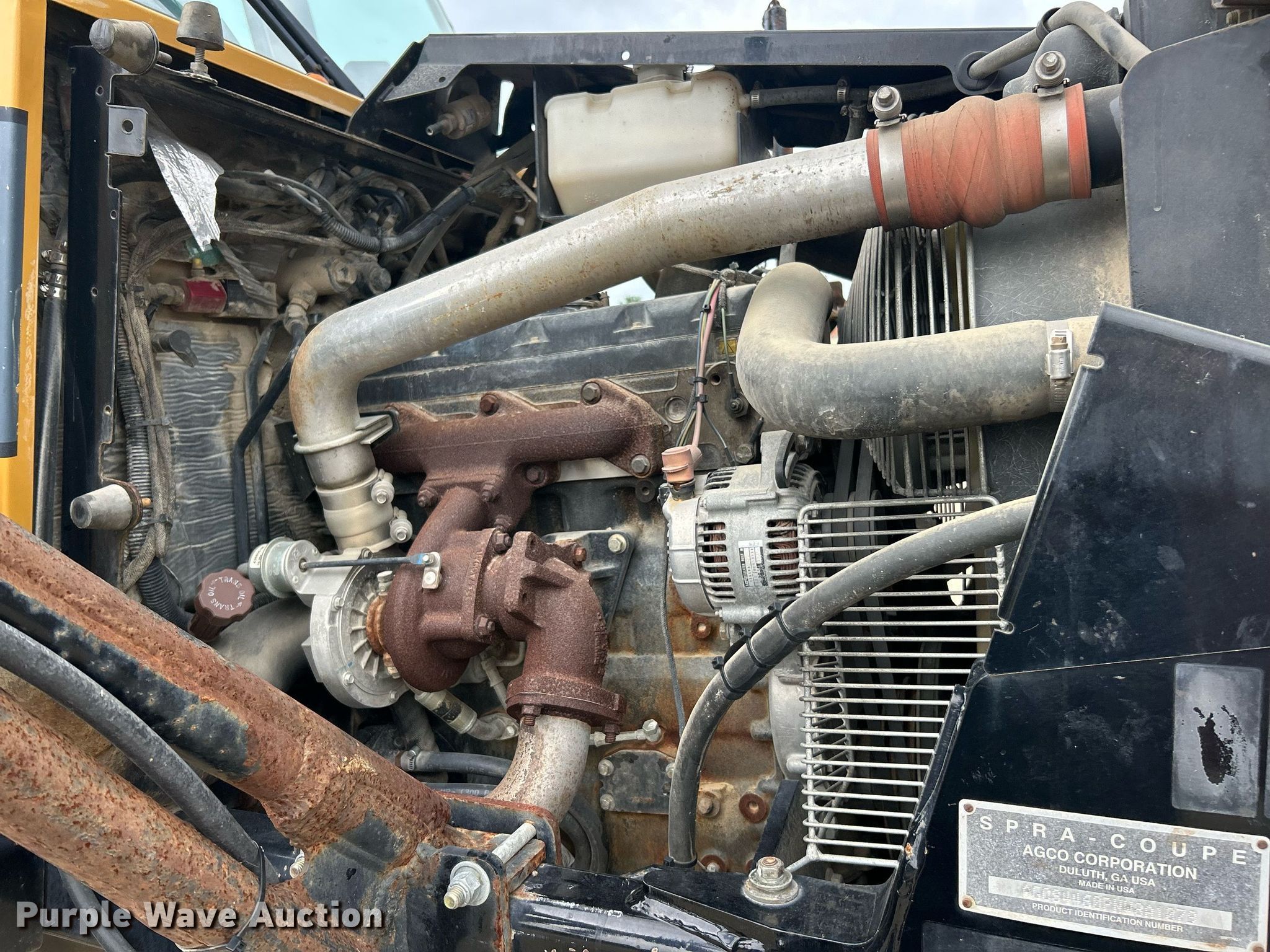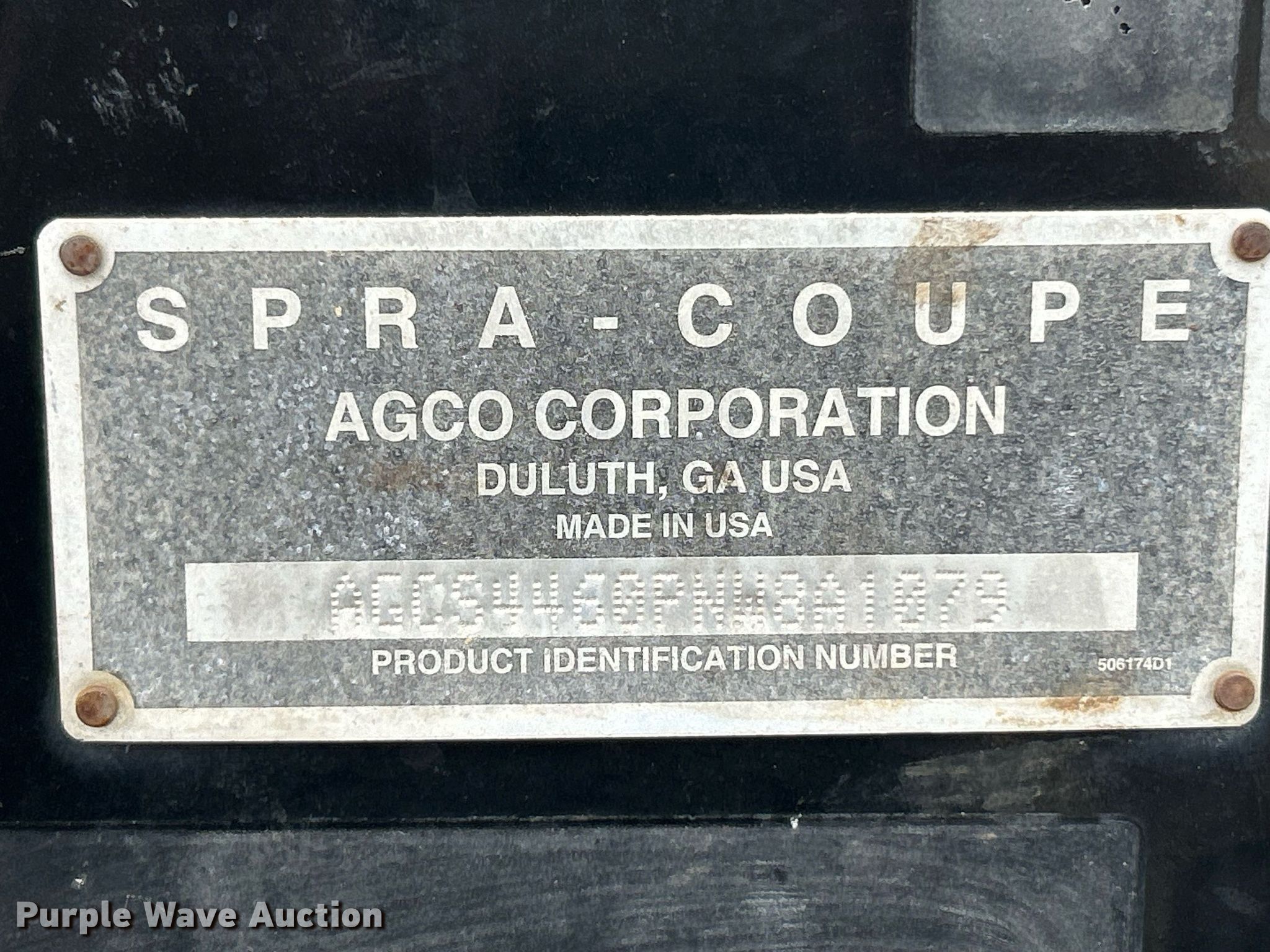 Spra-Coupe 4460 sprayer. Engine hours: 2,645 on meter, Serial: AGCS4460PNW8A1079. Engine Perkins, Cylinders: 4, Fuel type: Diesel. Transmission Automatic. Chassis Hydraulic axle width adjust. Operators station AC, Heat. Features Solution tank Capacity: 400 gallons, Type: Poly, Rinse tank Capacity: 45 gallons, Boom Width: 80', Sections: 5, Boom breakaway, Hydraulic boom fold, Hydraulic height control, Nozzle Spacing: 20", Nozzle bodies: 3-way.. Tires Front: 320/85R24, Rear: 380/85R24, Row crop tires. Notes Ag leader ready, no monitor, Windshield chipped or cracked. MFA Inc. Owensville, MO 65066