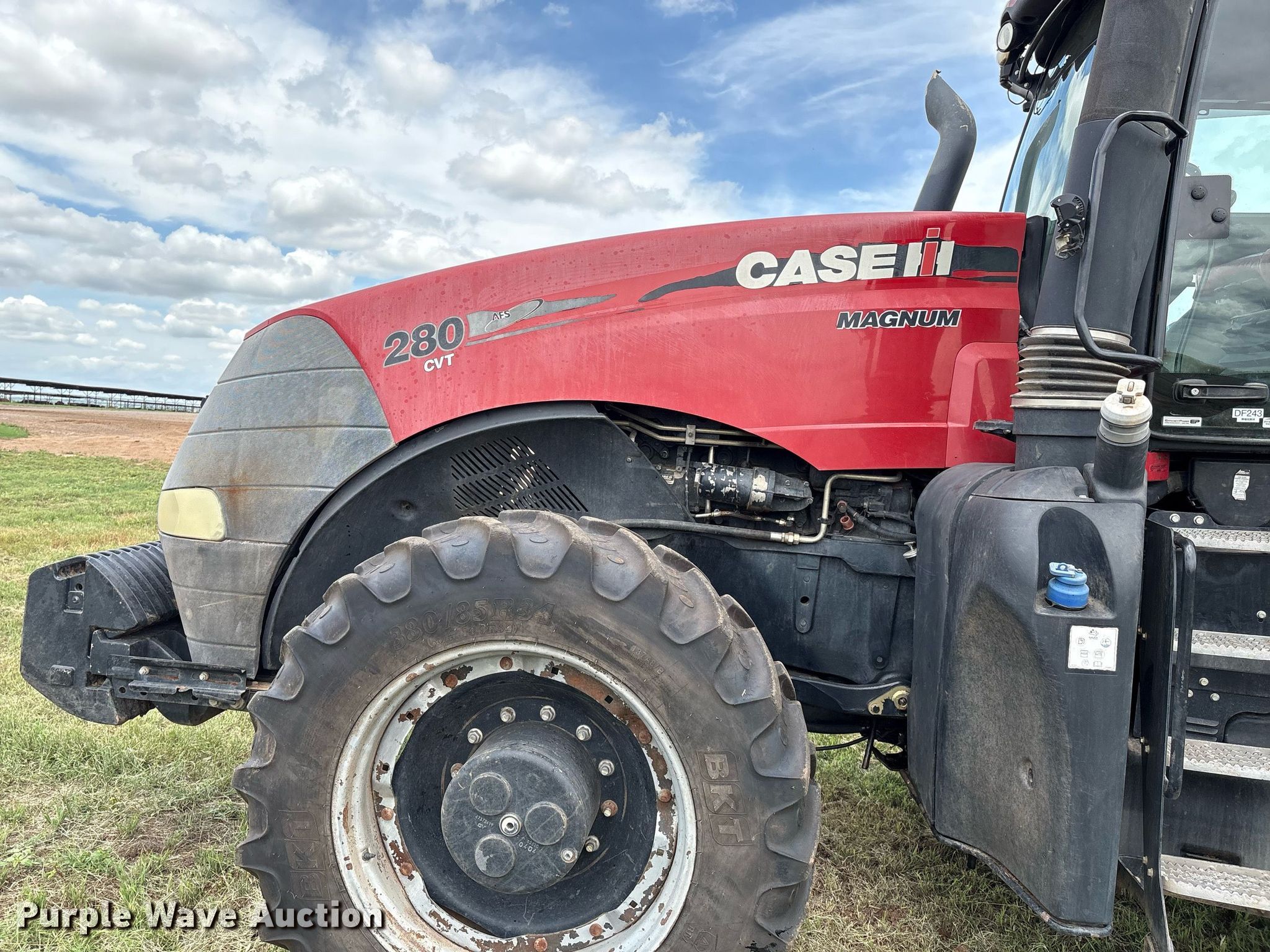 2015 Case Magnum 280 MFWD tractor. Hours: 7,310 on meter, Serial: ZERF08637. Engine Case, Displacement: 8.7L, Cylinders: 6, Fuel type: Diesel. Transmission CVT, Differential lock. Operators station AC, Heat. Features PTO: 1 3/4" 1000, Seven pin outlet, ISOBUS outlet, Hydraulic remote sets Rear: 5, Power beyond (hydraulics), Suitcase weights: 18. Tires Front: 380/85R34, Rear: 520/85R46. Hollis, OK 73550