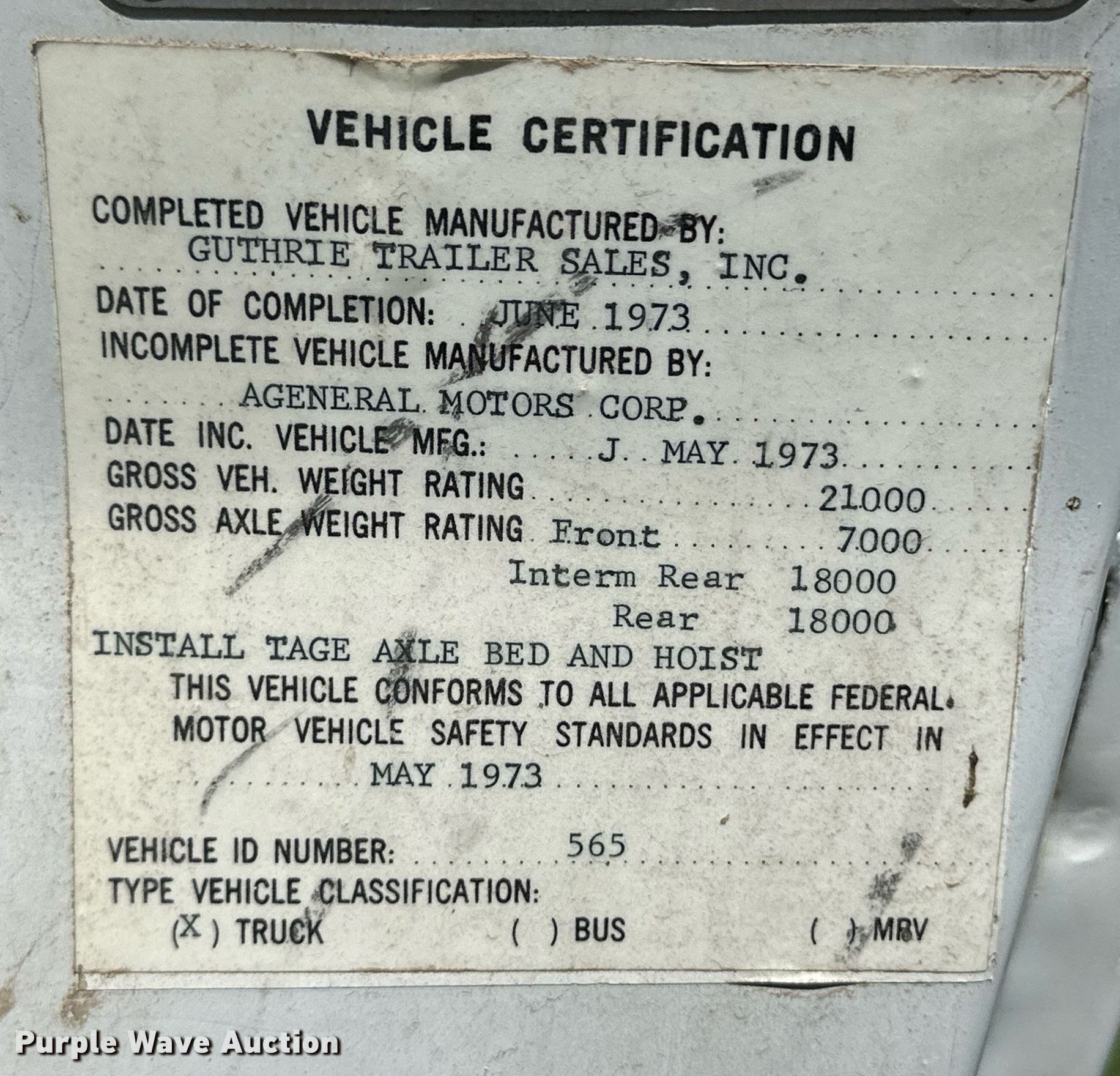 Purple Wave is selling a used Grain Truck in Kansas. This item is a 1973 GMC 6000 grain truck with the following: Miles: 34,985 on odometer, VIN: TCE61TV598652