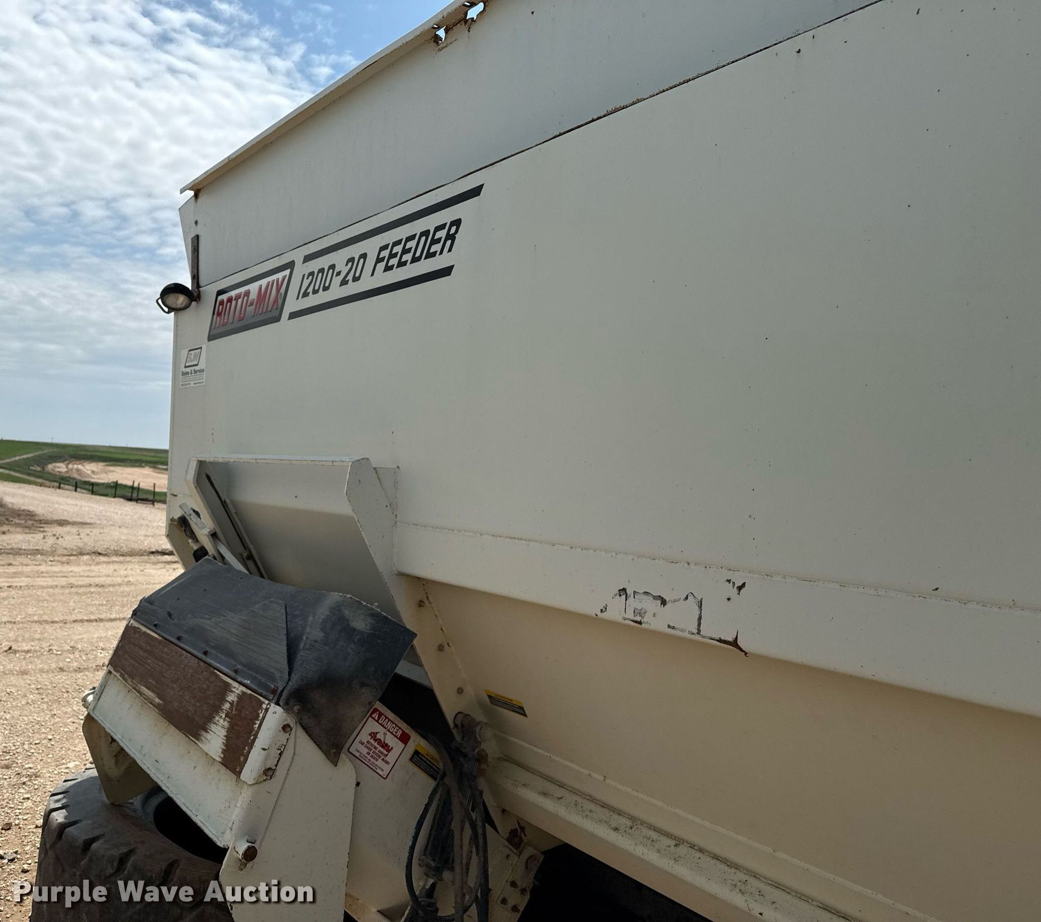 Roto-Mix 1200-20 feed mixer bed. Serial: 410539523. Features Scales Digi-Star, Auger Quantity: 2, Discharge: Side Width: 46", Chute: Hydraulic, Door: Hydraulic. Notes Scale display missing. Cobalt Cattle Company. Leoti, KS 67861