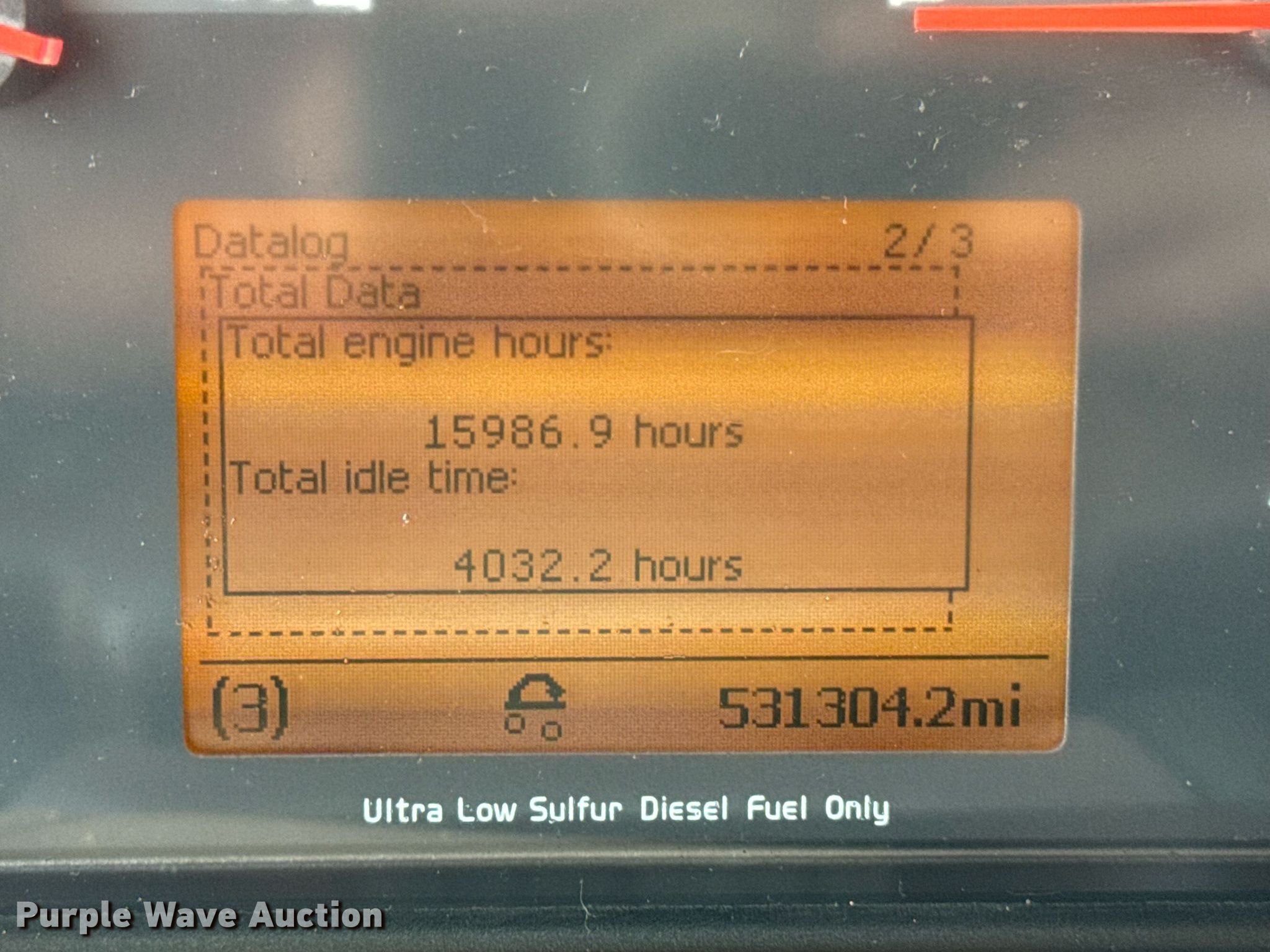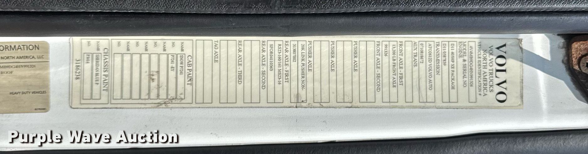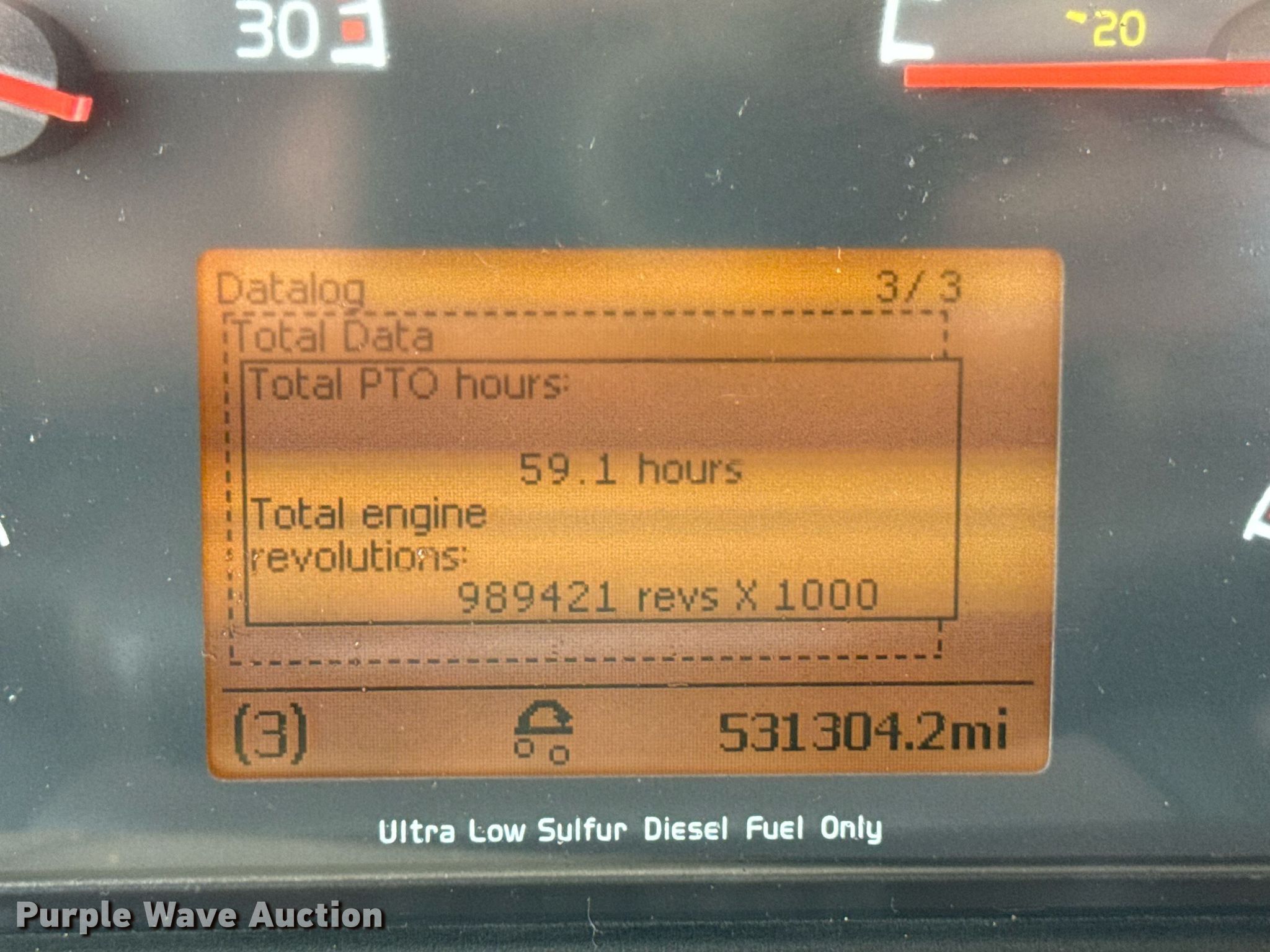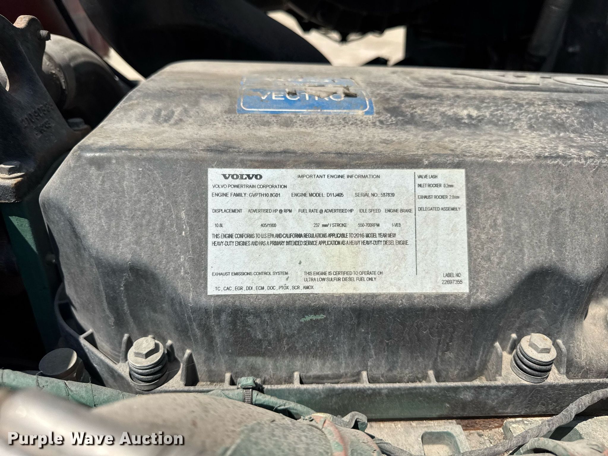 2017 Volvo VNM semi truck. Miles: 531,304 on odometer, Hours: 15,987 on meter, VIN: 4V4MB9DG4HN991326, Unit #: 47. Engine Volvo D11, Displacement: 10.8L, Cylinders: 6, Fuel type: Diesel, Engine brake. Transmission Automated manual. Chassis Axles: Tandem, Pusher axle, Differential lock: Inter-axle, Suspension: Air Dump valves, Brakes: Air, PTO, GVWR: 53,200 lbs FAWR: 12,300 lbs, IAWR: 20,000 lbs, RAWR: 20,000 lbs. Interior AC, Heat, Heated mirrors, Power windows, Power locks, Cruise control, Air ride cab. Features Deck plate: Aluminum, Fifth wheel type: Air operated, Sliding, Fuel tank: Single, 3" PTO driven fluid pump. Tires Size: 295/75R22.5. Notes PTO switch disconnected from fluid pump. Ohio title. Title distribution may be delayed up to 30 days from verification of funds. Beck Suppliers, Inc.. Fremont, OH 43420