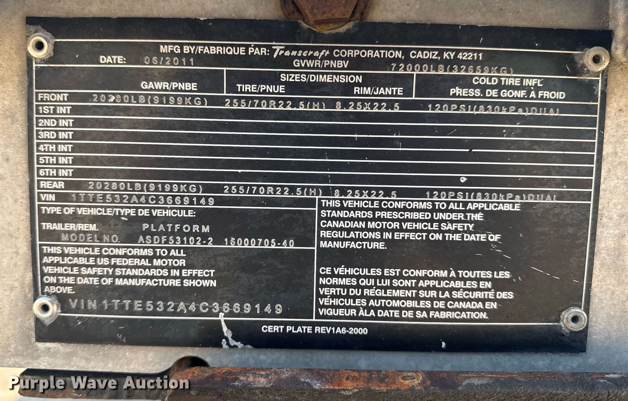 Purple Wave is selling a used Flat or Drop Deck Trailer in Kansas. This item is a 2012 Transcraft drop deck trailer with the following: Overall: 53' 5" L x 102" W, Vin: 1TTE532A4C3669149, Deck: 42' L, Top deck length: 11', Ramps: Manual, Length: 8', Features, Deck type: Aluminum, Wood, Chassis, Landing gear: Dual, Suspension: Air, Brakes: Air, Axles: Spread, GVWR: 72,000 lbs, GAWR: 20,280 lbs, Tires, Aluminum wheels, Size: 255/70R22.5, Kansas title. Title distribution may be delayed up to 14 days from verification of funds.. Irish Express, Inc.. Alma, KS 66401