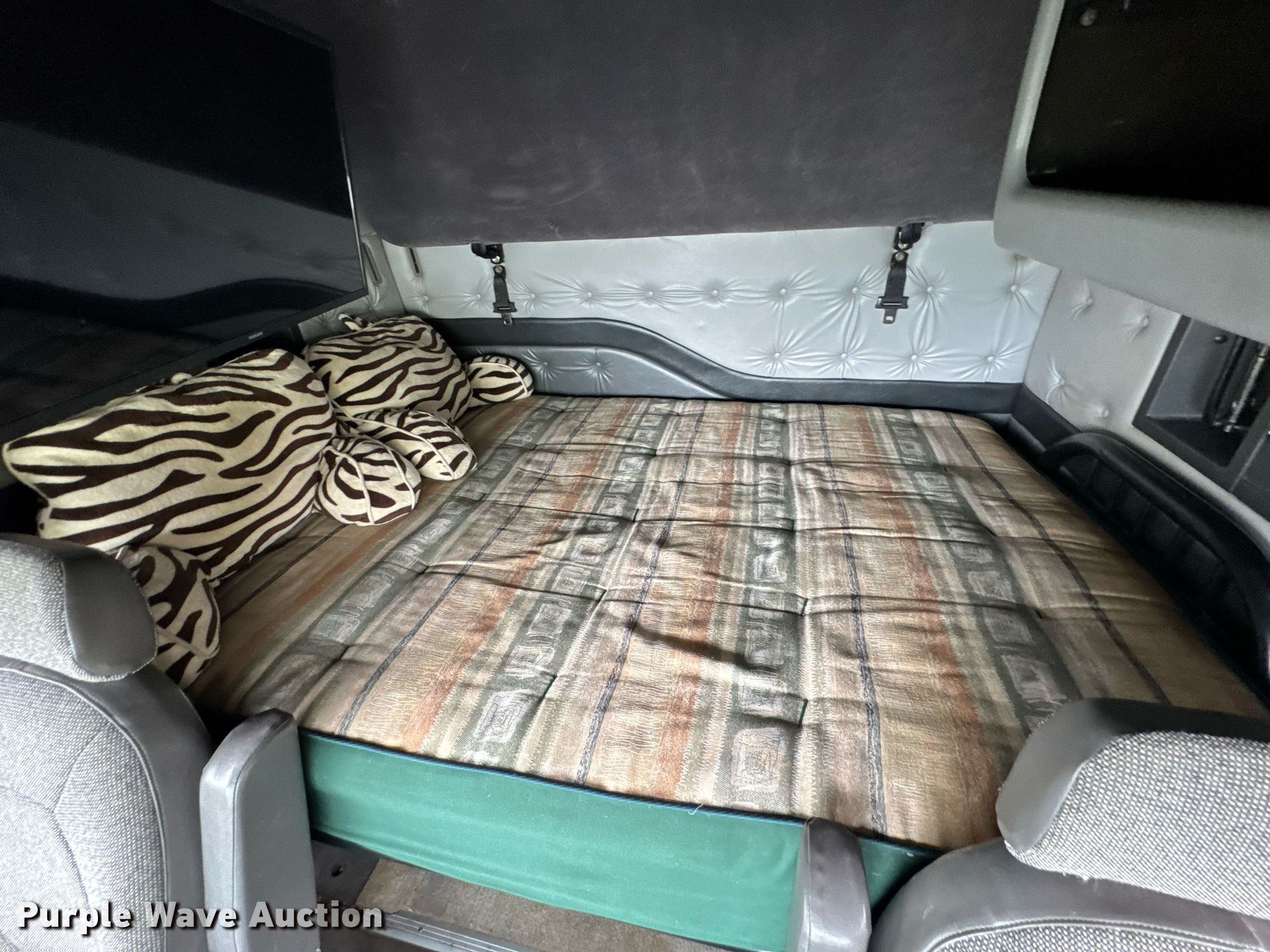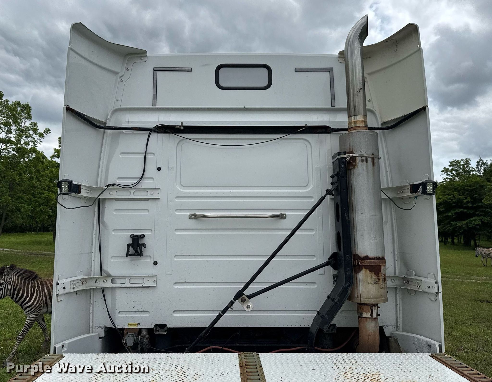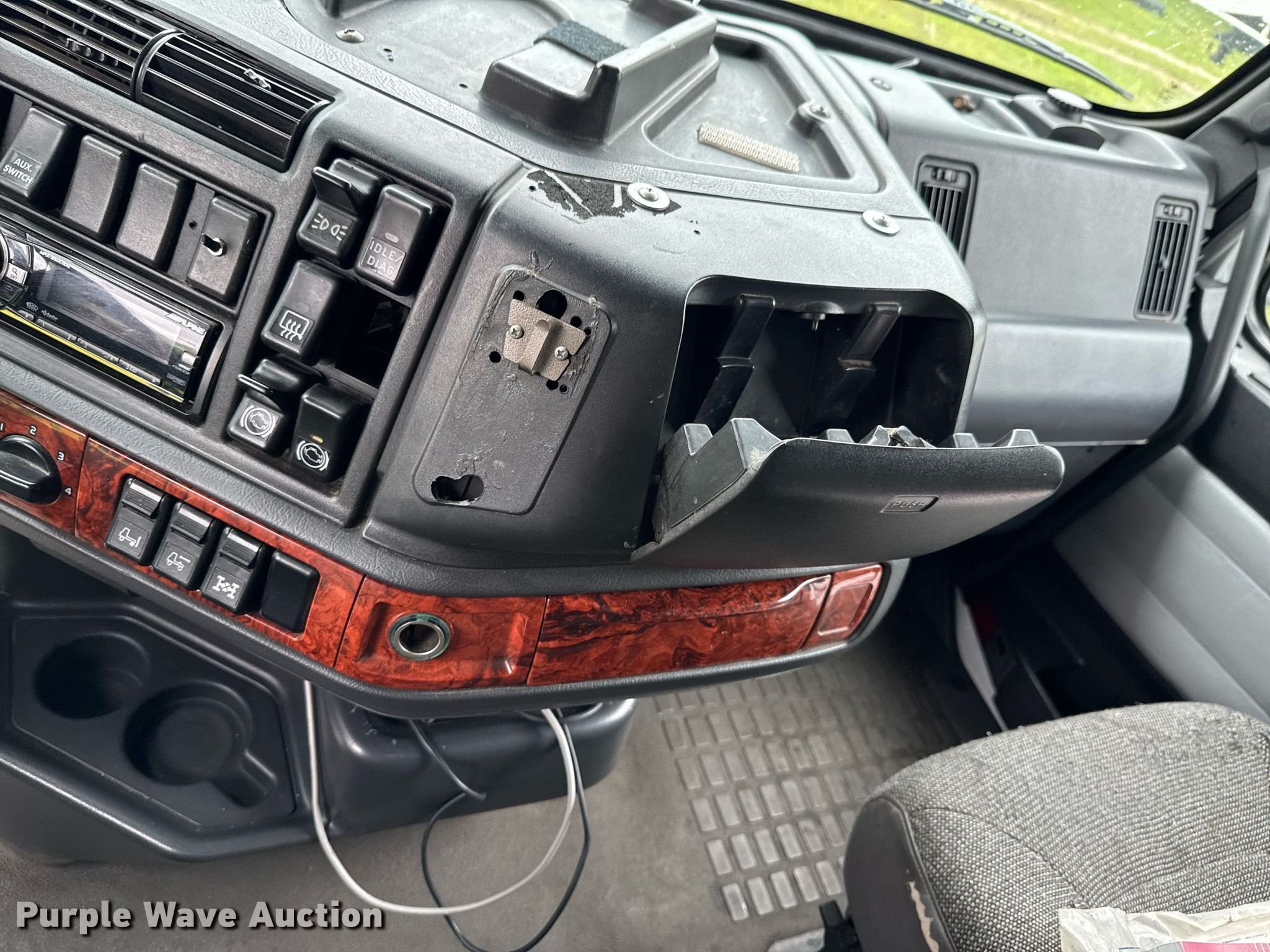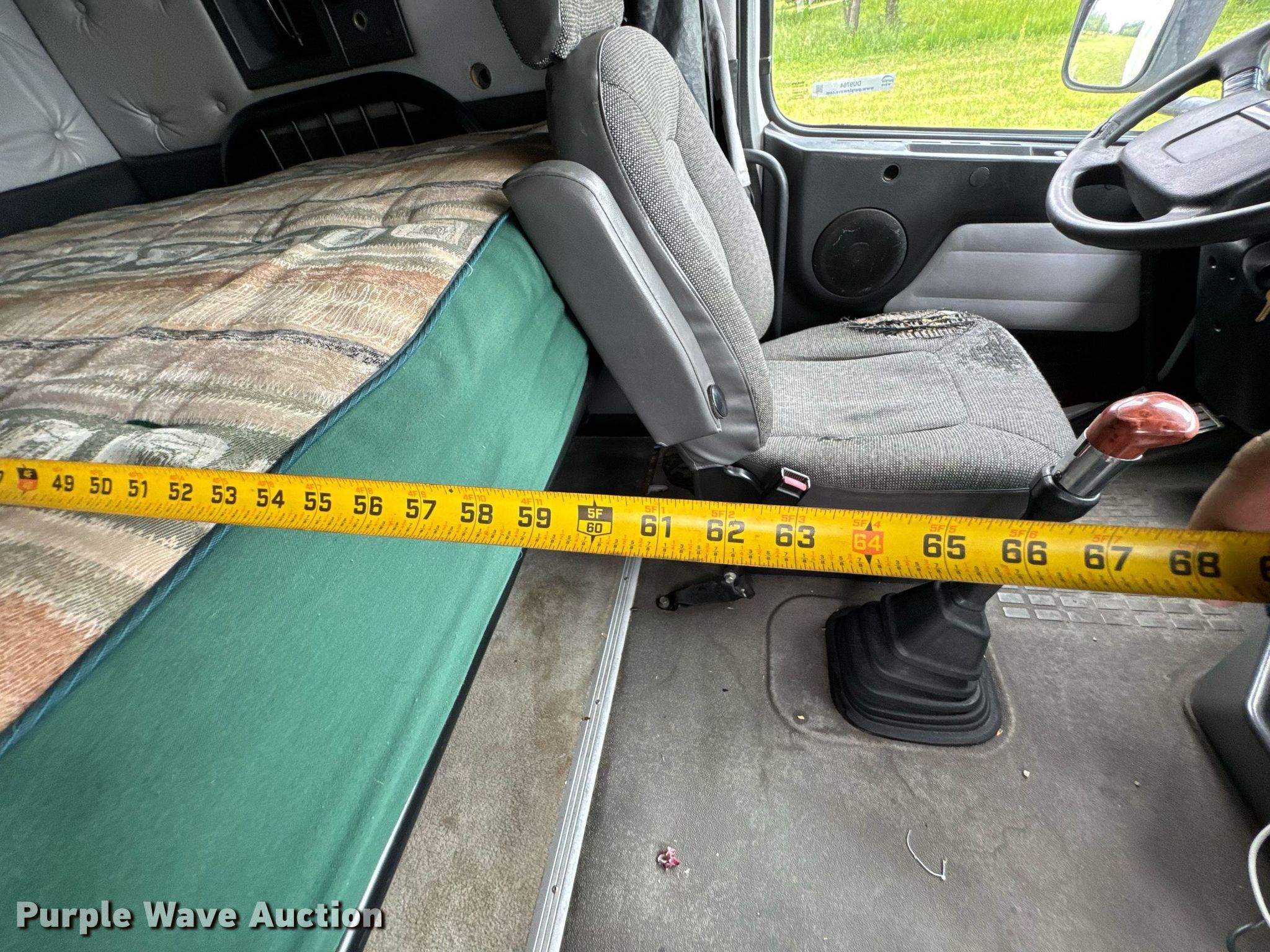 1999 Volvo VNL flatbed truck. Miles: 763,500 on odometer, VIN: 4VG7DBJH3XN773987. Engine Cummins N14, Displacement: 14.0L, Cylinders: 6, Fuel type: Diesel, Engine brake. Transmission Eaton Fuller, Manual, Speed: 10. Chassis Four wheel drive, Axles: Single, Differential lock: Inter-axle, Suspension: Air, Brakes: Air, GVWR: 49,828 lbs FAWR: 12,350 lbs, RAWR: 18,739 lbs. Interior AC, Heat, Heated mirrors, Power windows, Power locks, Cruise control, Air ride cab, Sleeper Sleeper length: 60", Beds: Double bunk, TV, Rear climate control, Auxiliary power unit Xantrex XPower 1500. Features Deck plate: Steel, Fuel tank: Dual, Gooseneck hitch, 8' L x 96" W. Tires Size: 295/75R22.5. California title. Title distribution may be delayed up to 30 days from verification of funds. Pontious Farm. Chanute, KS 66720